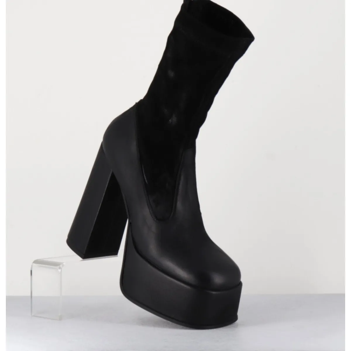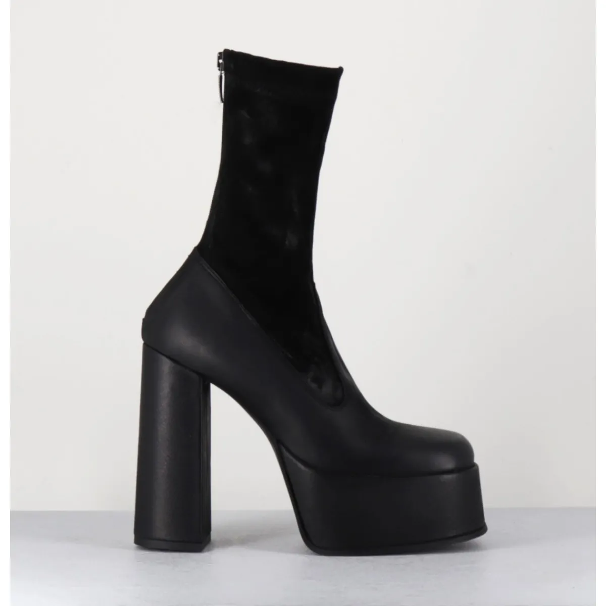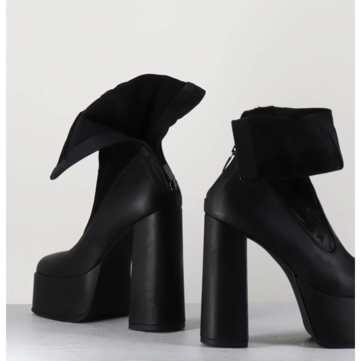 Boots à plateforme en cuir gras noir, bout carré esprit années 90, tige en cuir nubuck patiné noir, zip arrière, montées sur un haut talon large.
