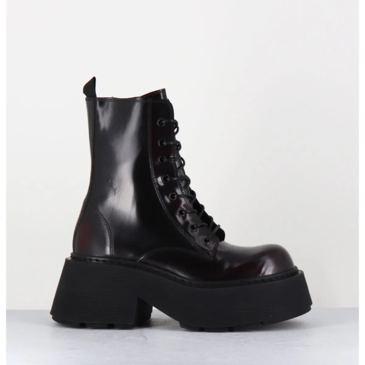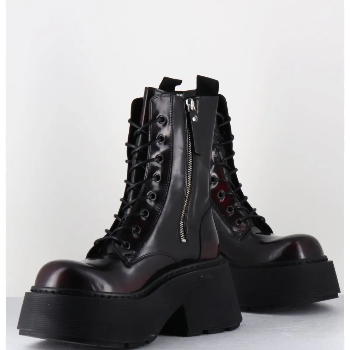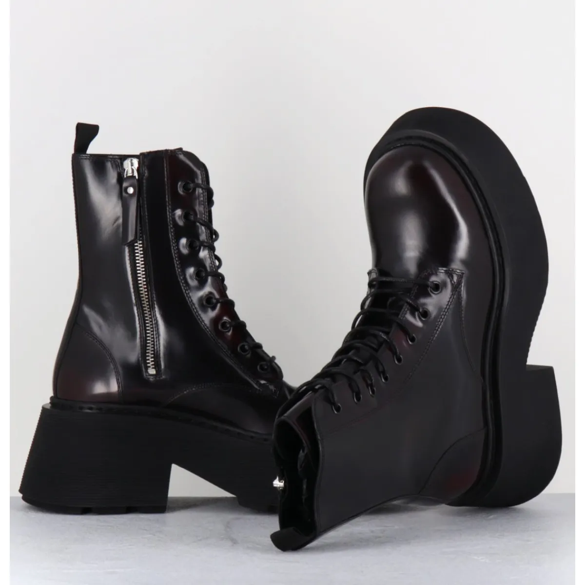 Rangers à lacets en cuir glacé bordeaux sombre brossé au noir pour un effet fumé, forme ronde exagérée, zip intérieur, montées sur une semelle épaisse bloc striée