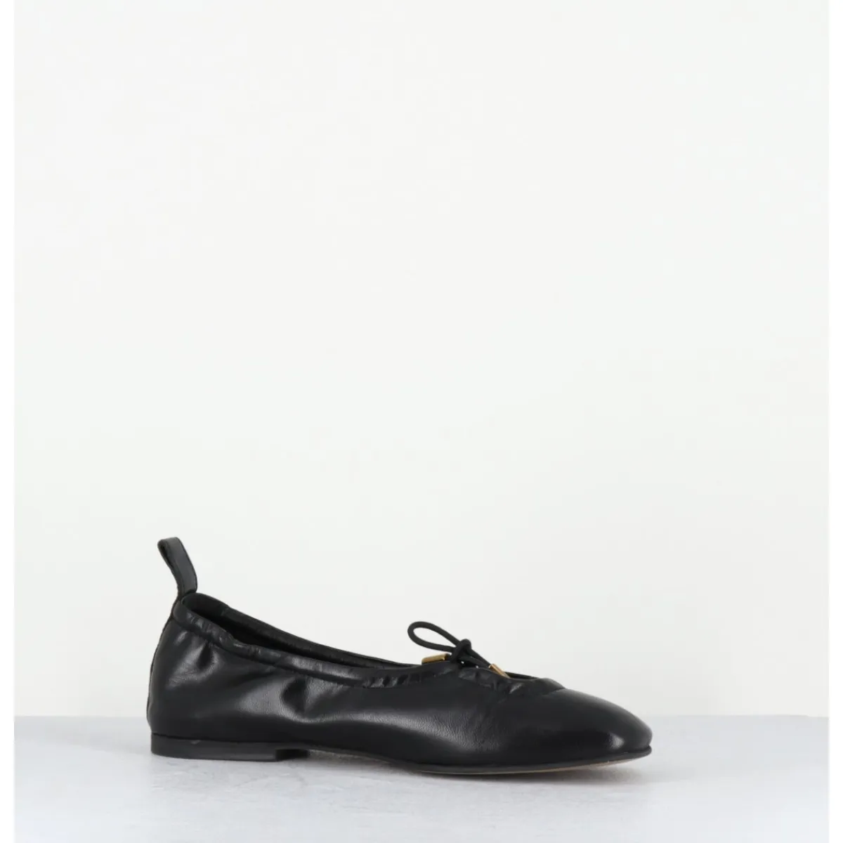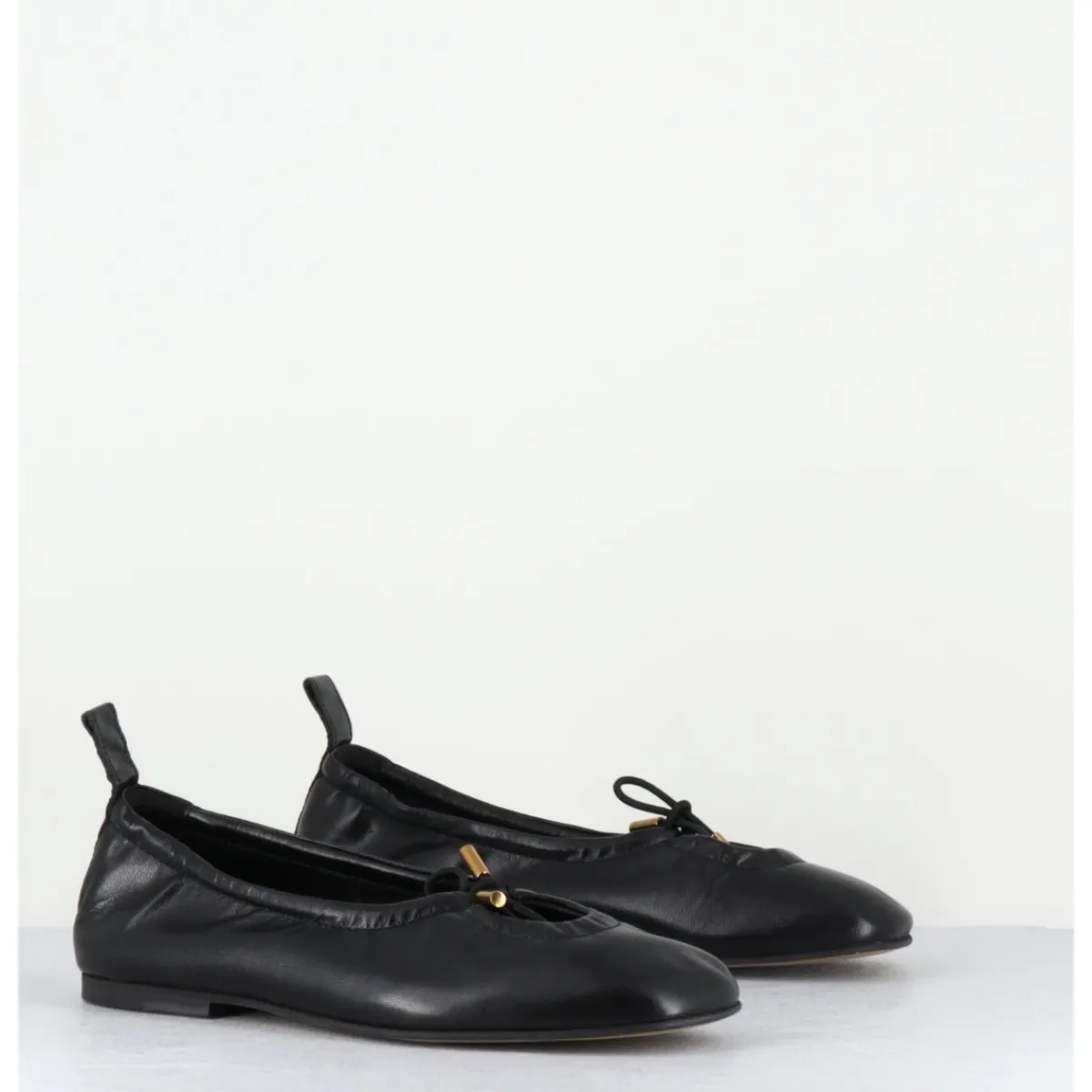 Ballerines plates en cuir noir, petit noeud élastique avec finitions dorées réglable à l’avant, bout carré arrondi