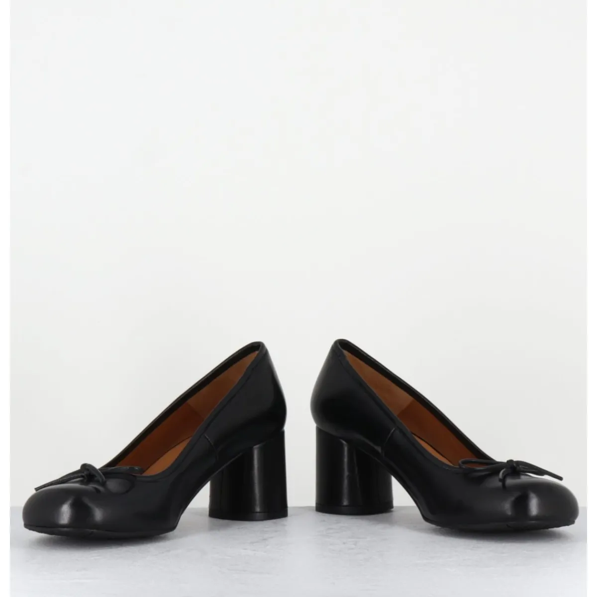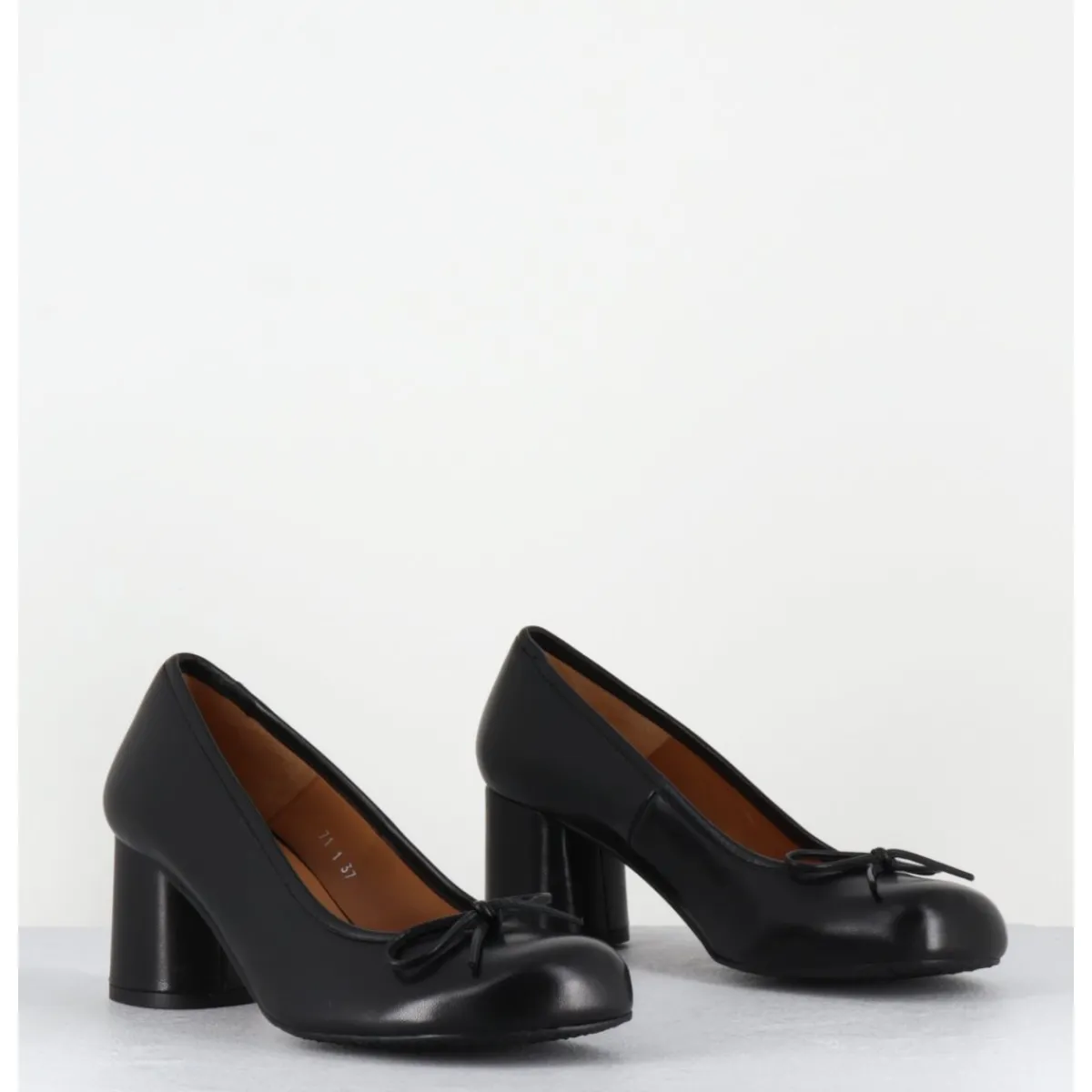Escarpins en cuir noir à talon, bout rond et petit noeud