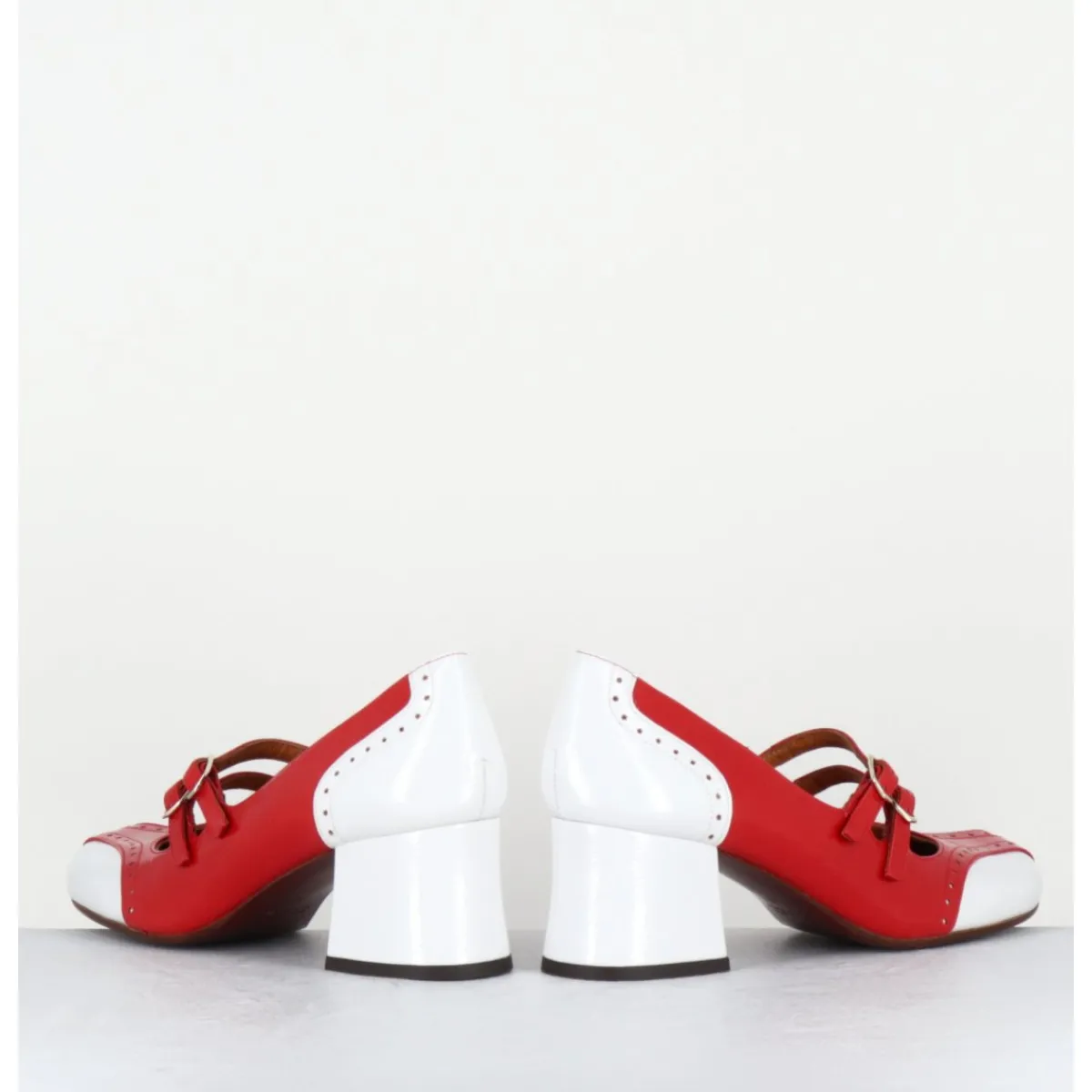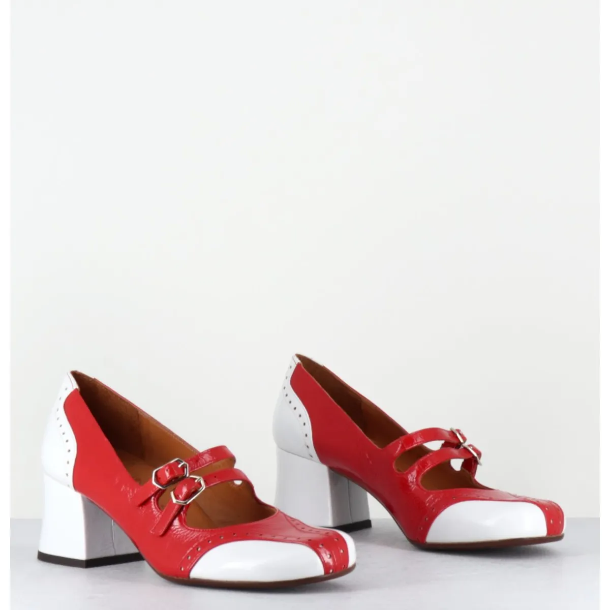 Chaussures – babies double brides réglables en cuir vernis souple effet brillant rouge & blanc, bout arrondie, détails de petits trous esprit vintage, montées sur un petit talon trotteur légèrement évasé