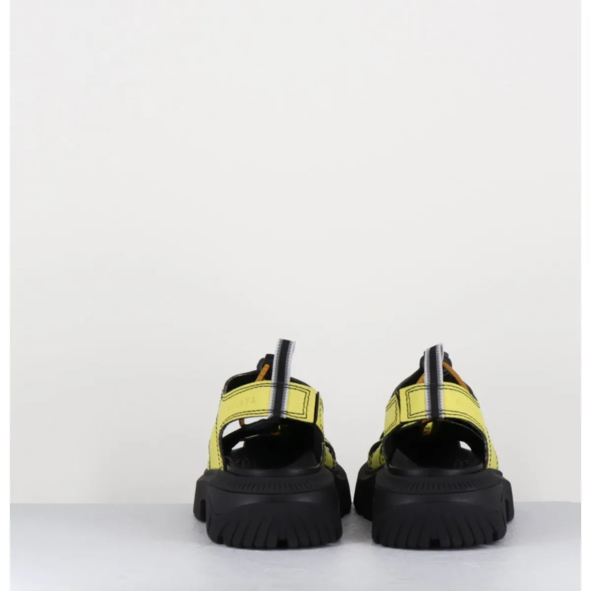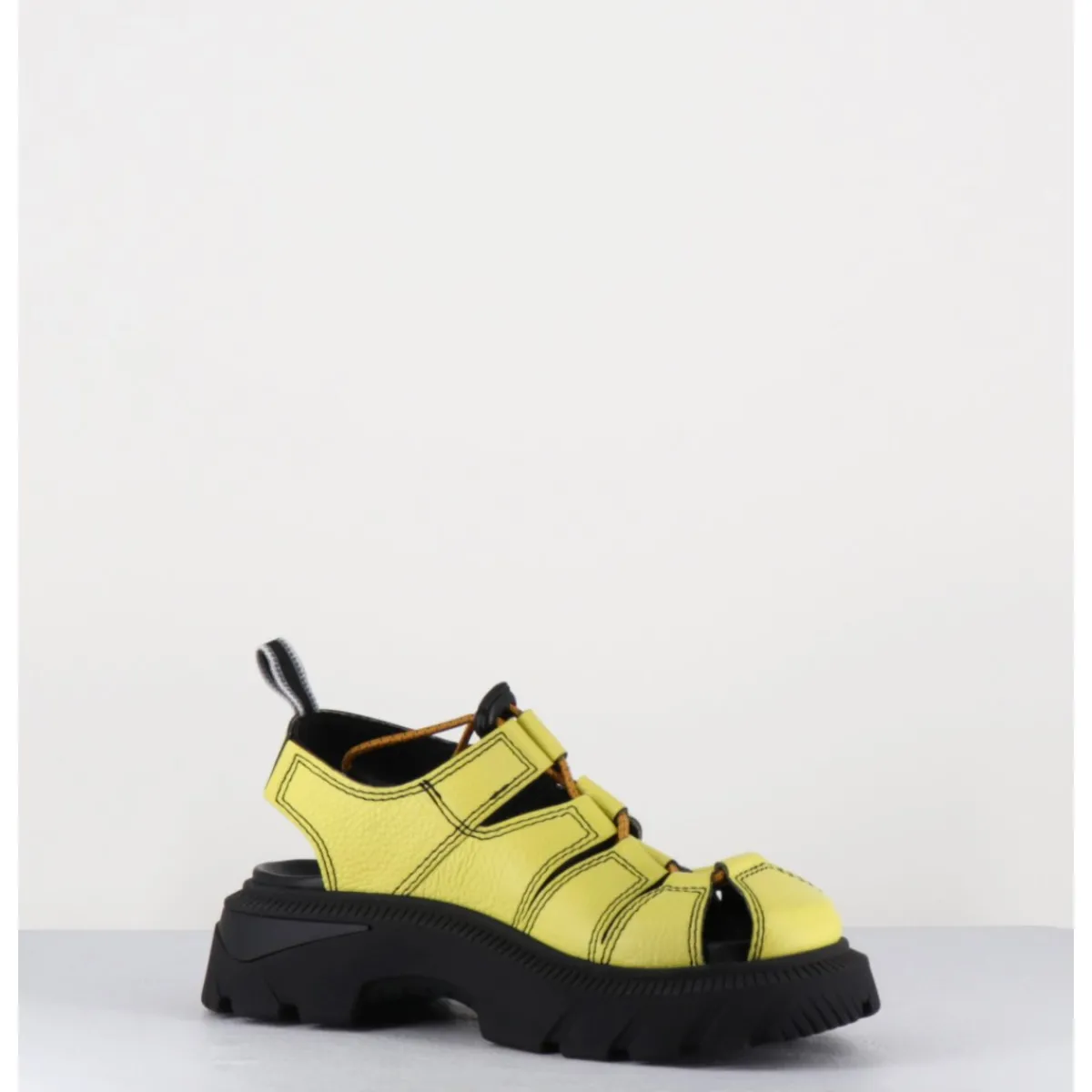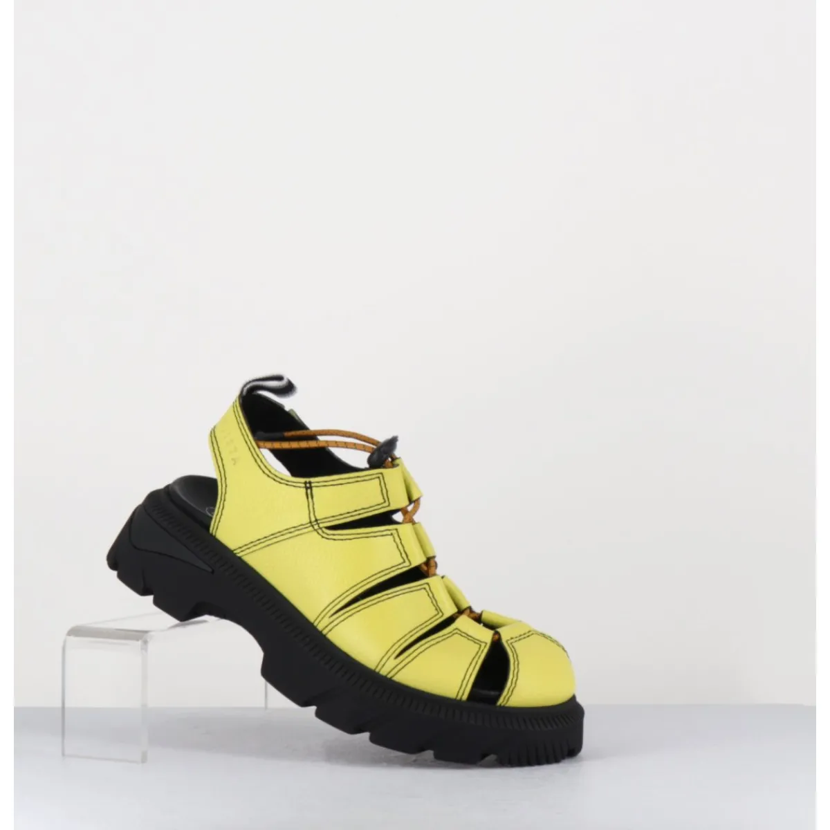 Entre la chaussure et la sandale, Eunice présente un montage inspiré des chaussures de sport avec un élastique réglable qui relie des bandes de cuir jaune, forme large montées sur une semelle noire crantée esprit années 90