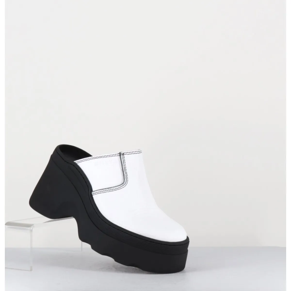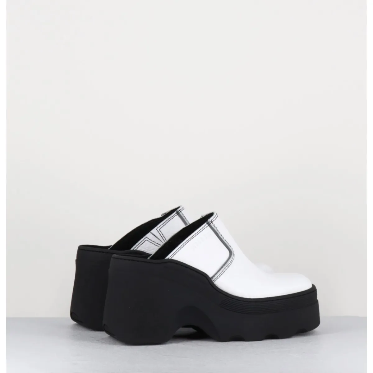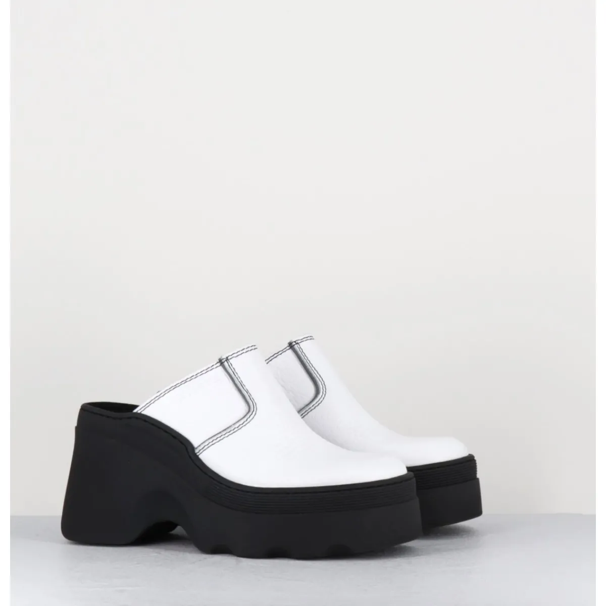 Mules compensées en cuir blanc esprit années 90, montées sur une plateforme bloc stylisée avec surpiqures contrastantes à l’avant & détails gris 3M réfléchissants, muni d’un petit élastique intérieur pour plus d’aisance + Signature de la Maison Miista ton sur ton. Ultra confortable