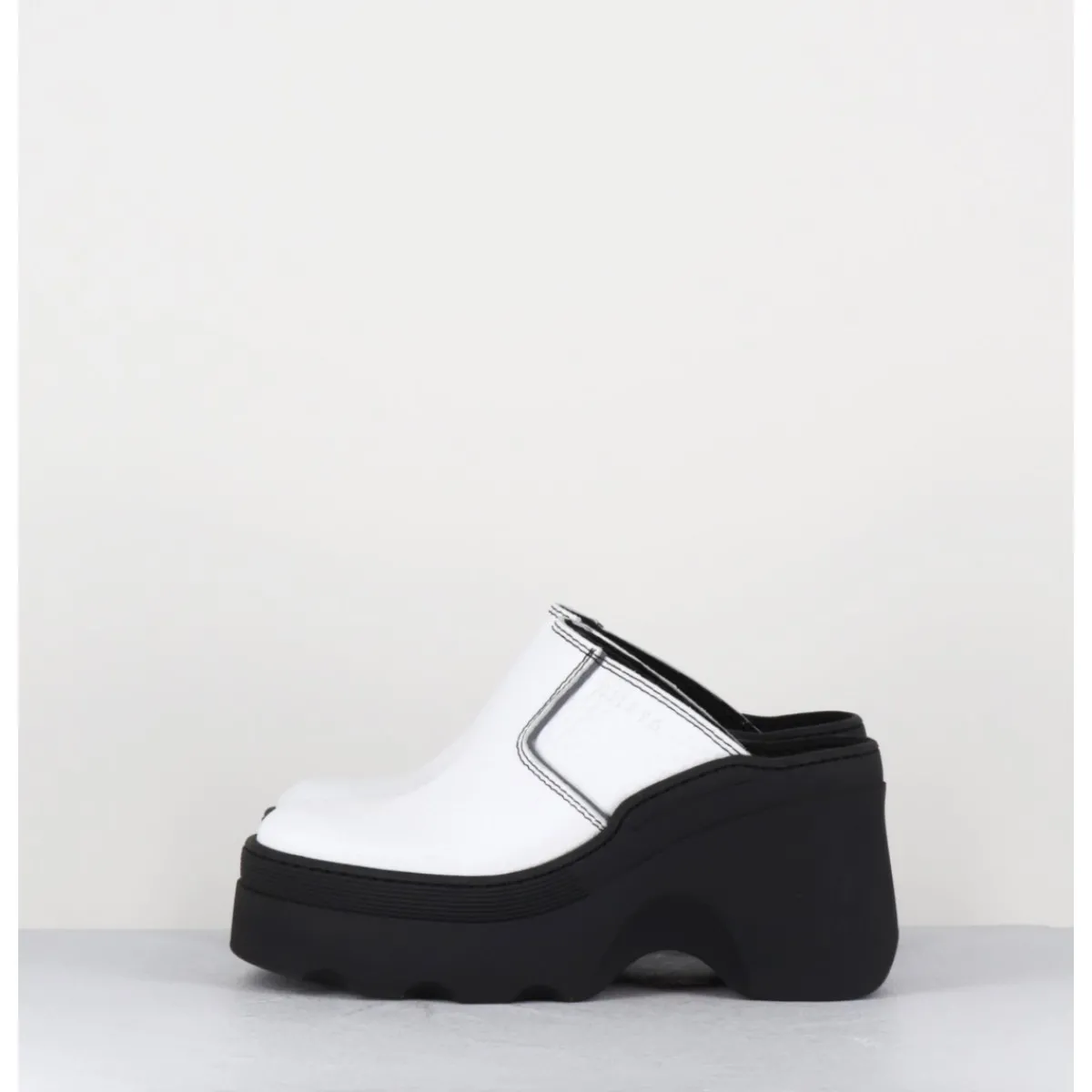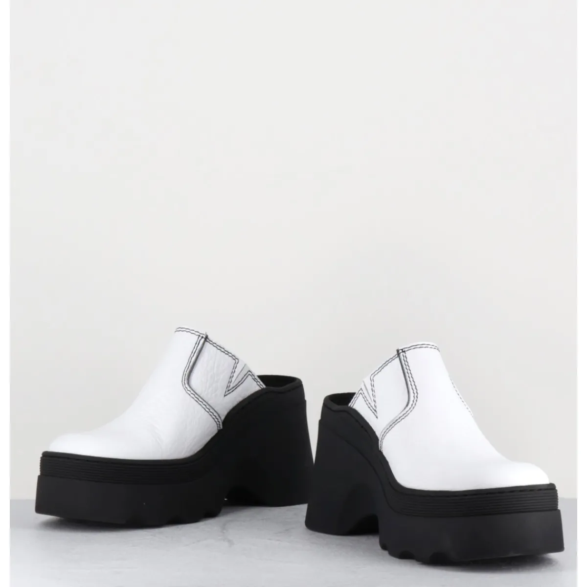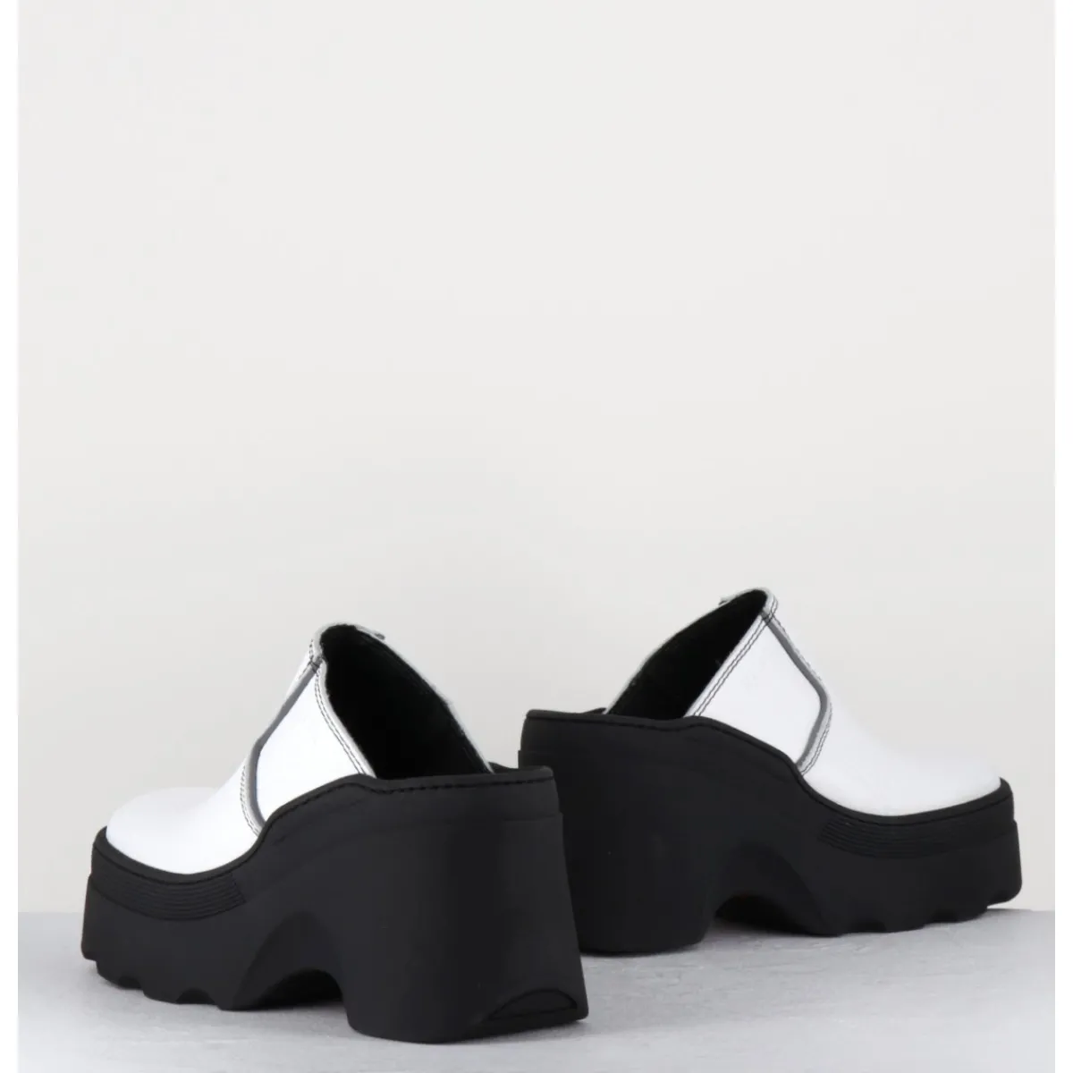 Mules compensées en cuir blanc esprit années 90, montées sur une plateforme bloc stylisée avec surpiqures contrastantes à l’avant & détails gris 3M réfléchissants, muni d’un petit élastique intérieur pour plus d’aisance + Signature de la Maison Miista ton sur ton. Ultra confortable