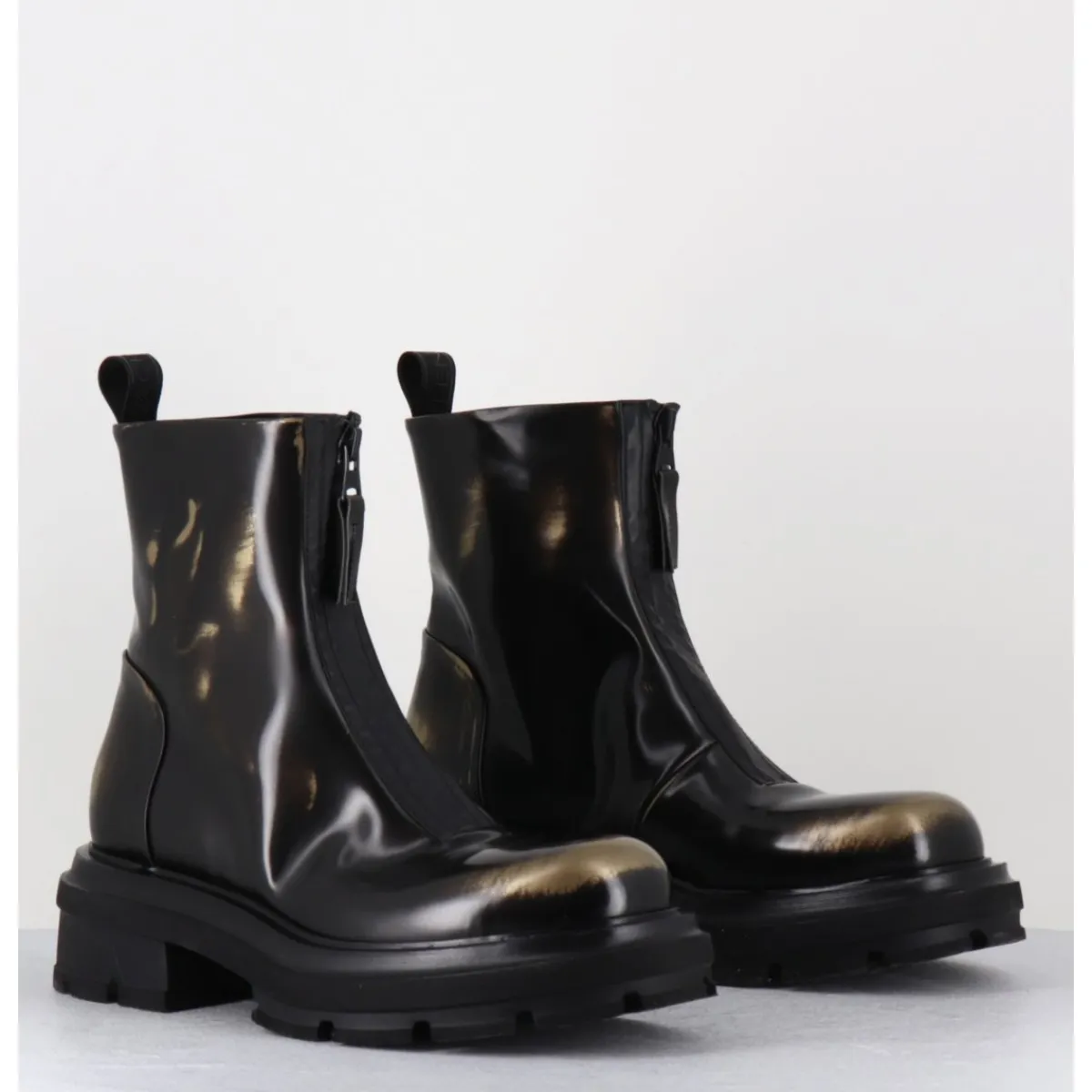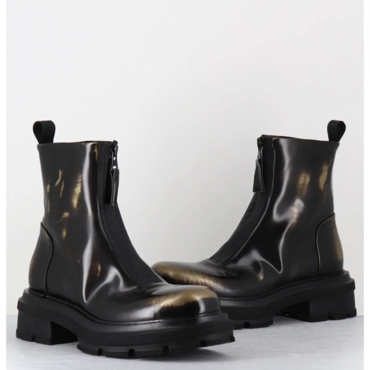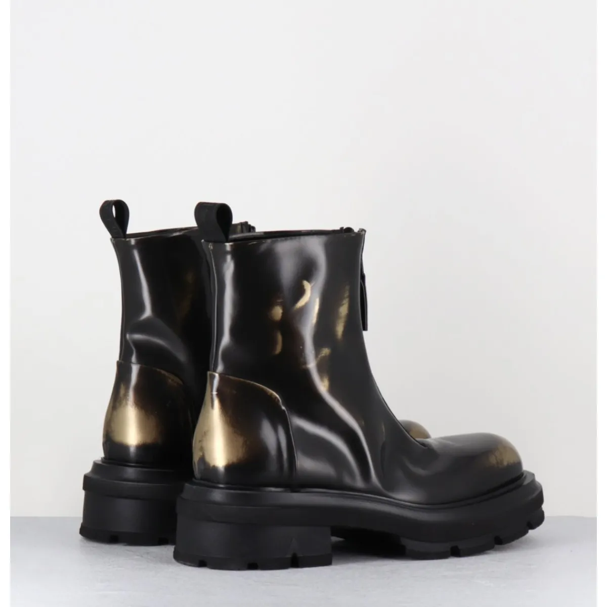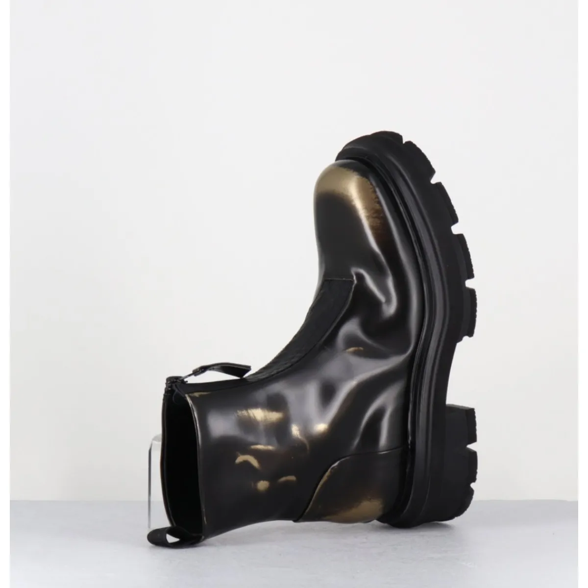 Boots effet glacé marron et or brossé pour un effet volontairement ‘usé’, bout arrondi et zip à l’avant, montées sur une semelle épaisse légère