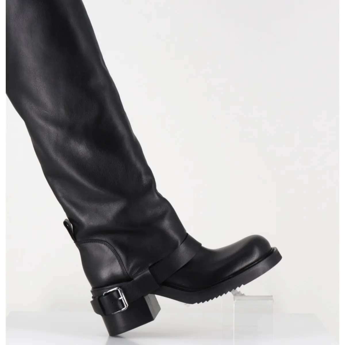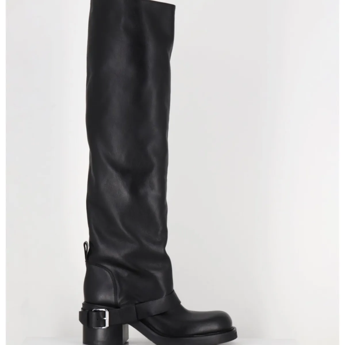 Bottes genouillères en cuir noir souple, ligne pure esprit bikers à tige haute tubulaire avec passant à boucle, montées sur un talon bloc et une semelle en gomme légère