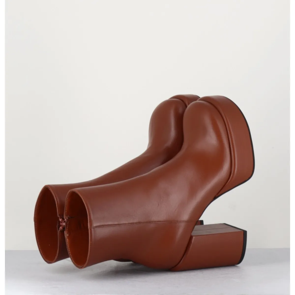 Boots 70s en cuir marron, bout rond anatomique, zip intérieur, montées sur une plateforme et un talon stylisés et recouverts.