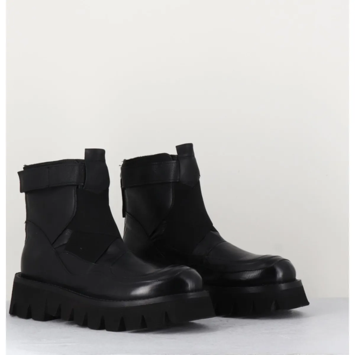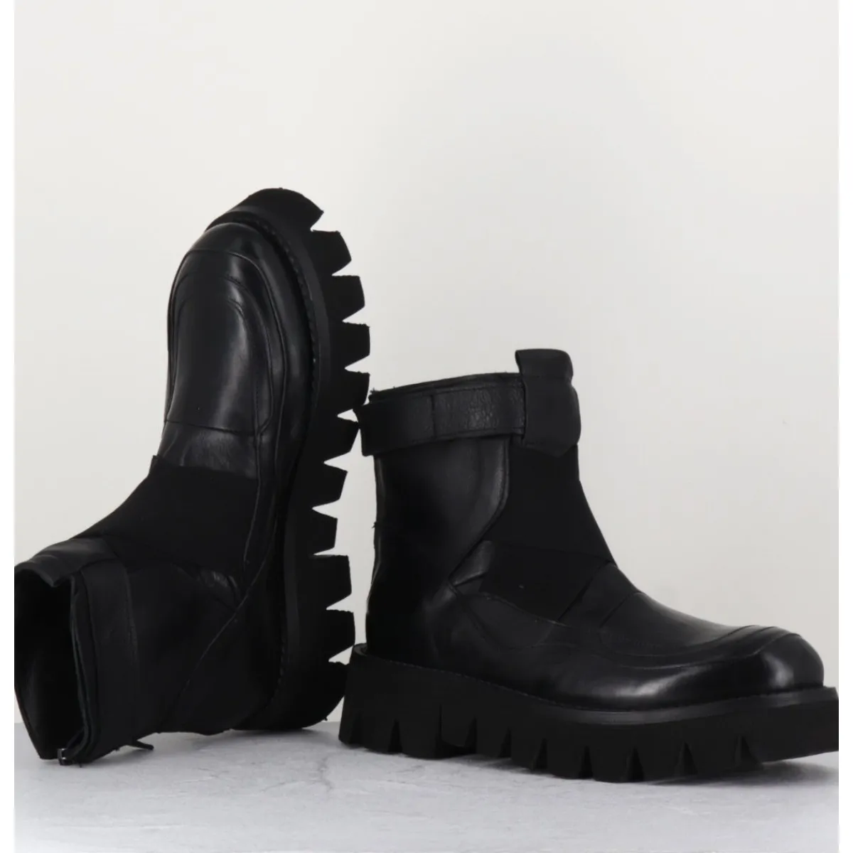 Boots en cuir très souple noir, bout rond, élastiques croisés sur le coup de pieds, bride à scratch sur la cheville, zip arrière, montées sur une semelle épaisse crantée en micro-fibre extra légère.