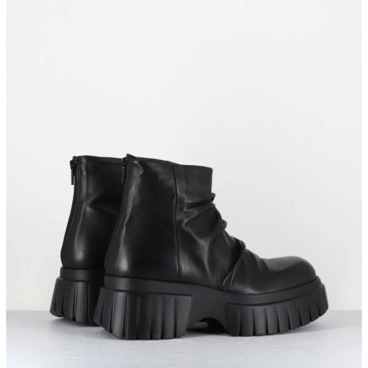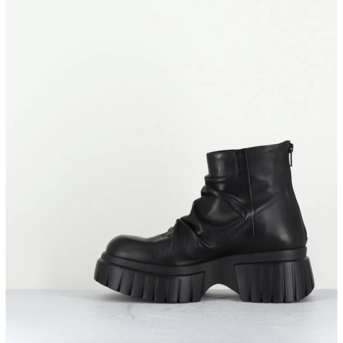 Boots tige courte en cuir noir ultra souple effet plissé, zip arrière, montées sur une semelle épaisse légère en gomme crantée