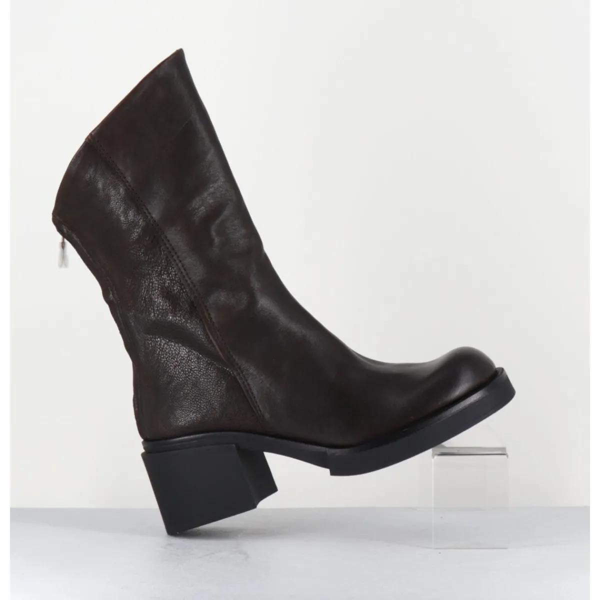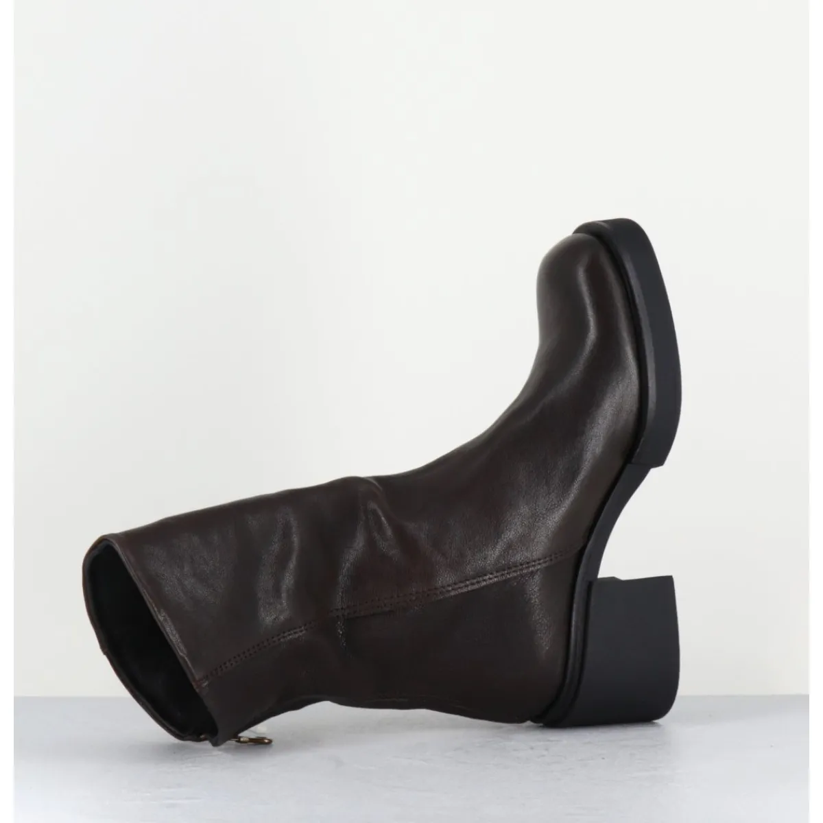 Boots esprit biker en cuir grainé marron effet froissé sur la jambe, tige mis-haute à découpe asymétrique, zip arrière, montées sur une semelle en gomme ultra légère et un talon bloc confortable