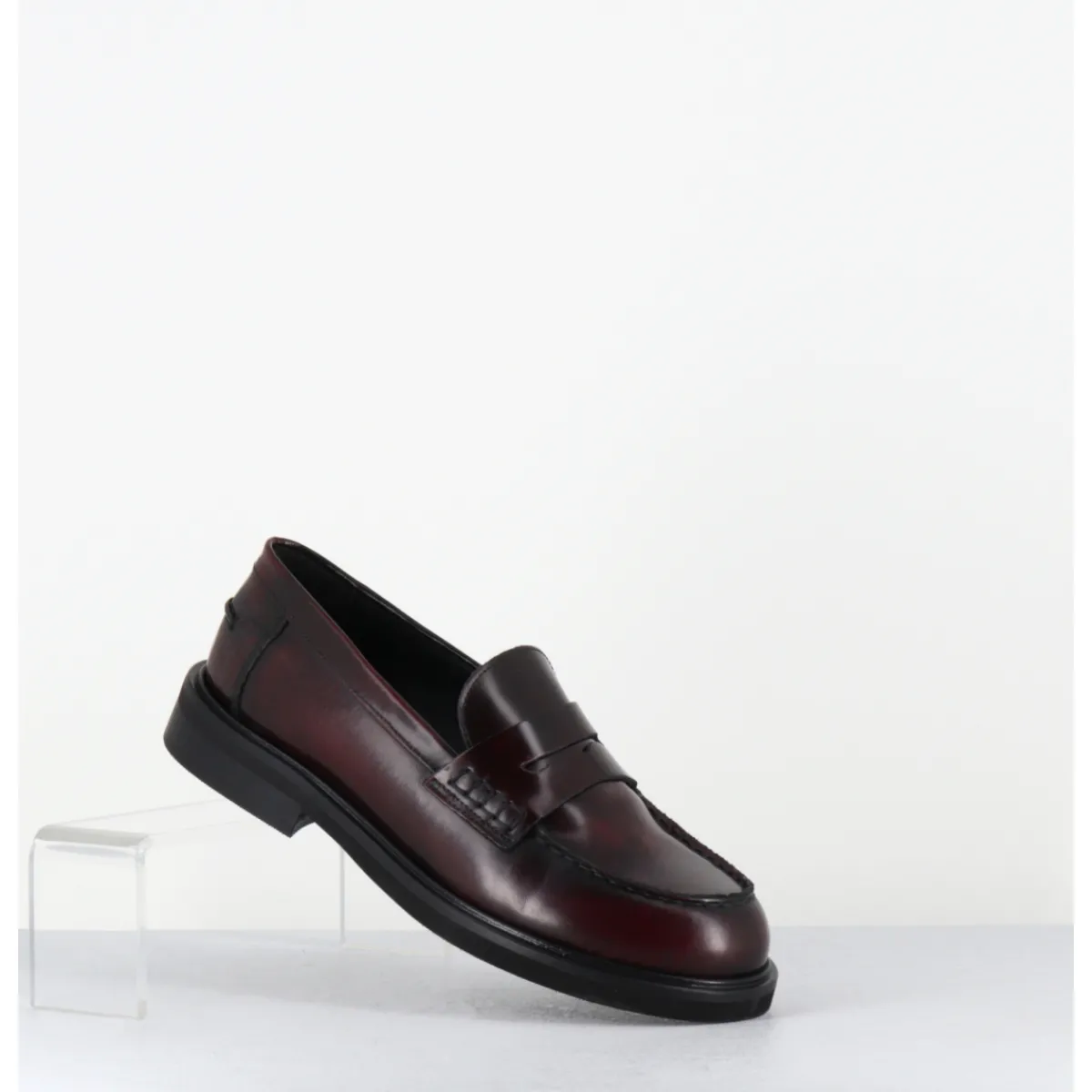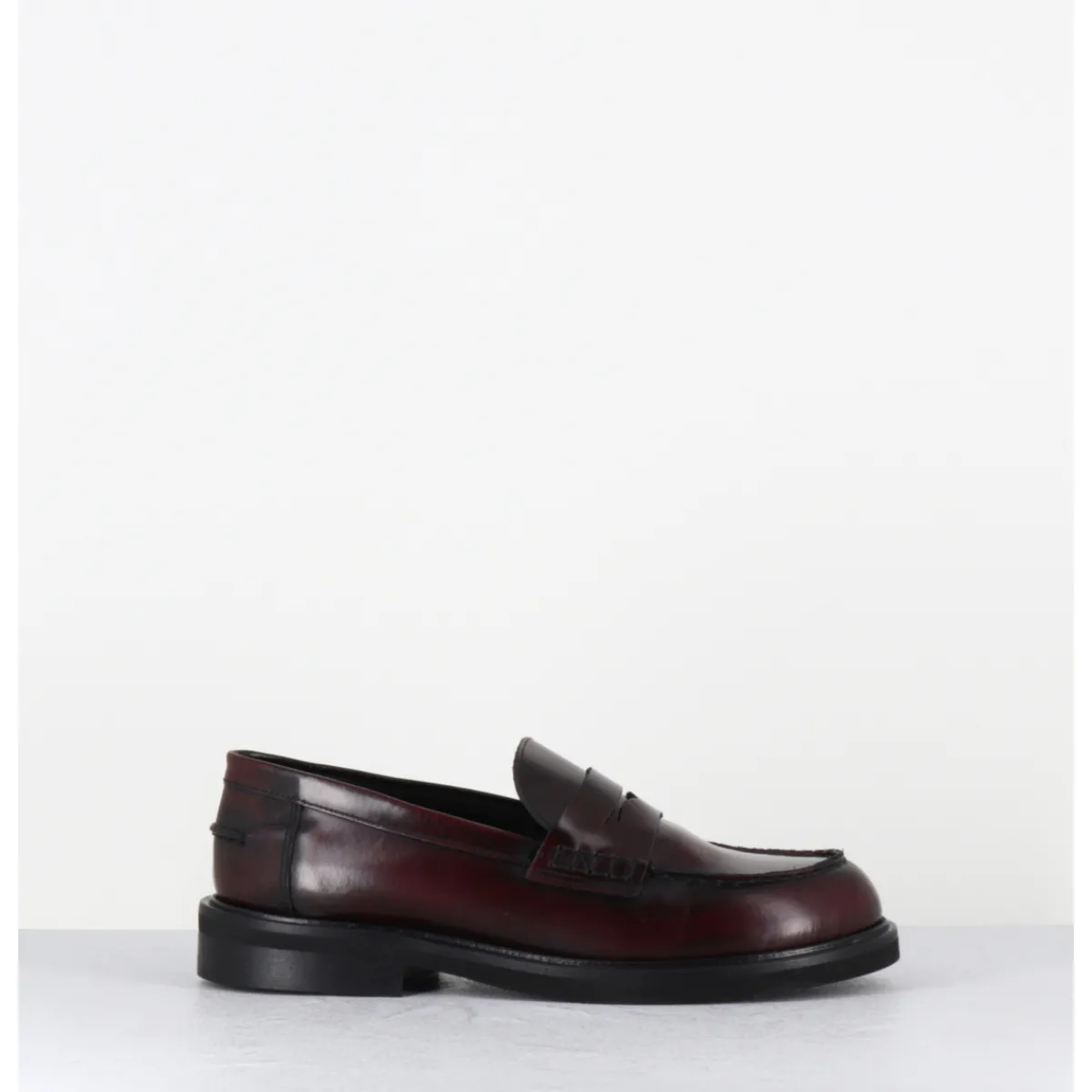 Mocassins plats en cuir bordeaux légèrement glacé, bout rond esprit collège, montés sur une semelle légère en gomme