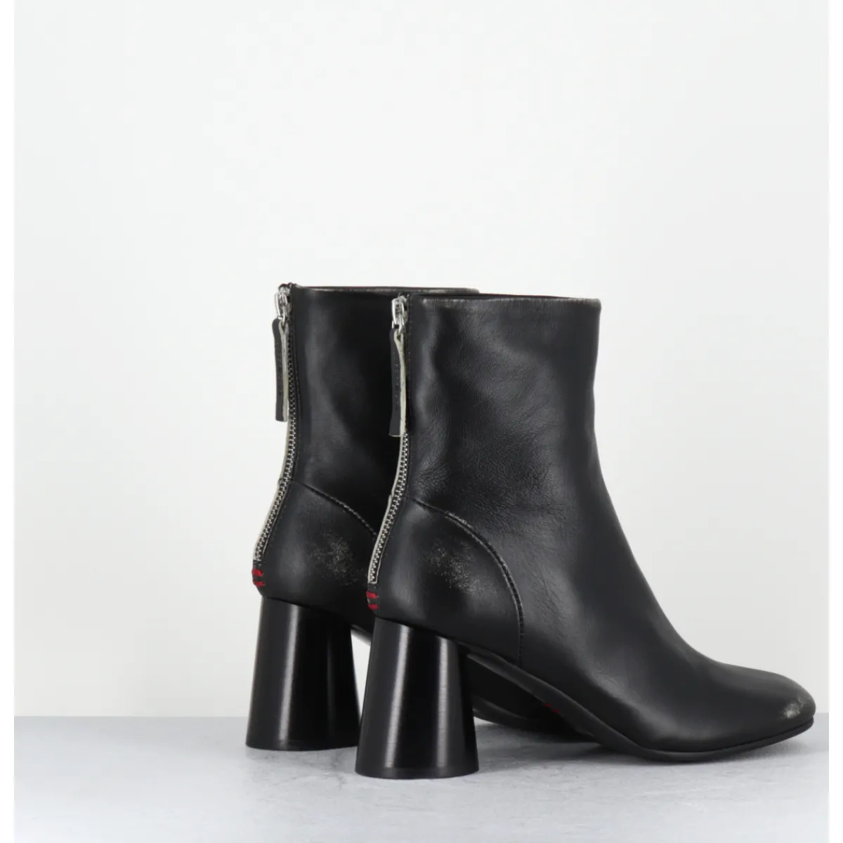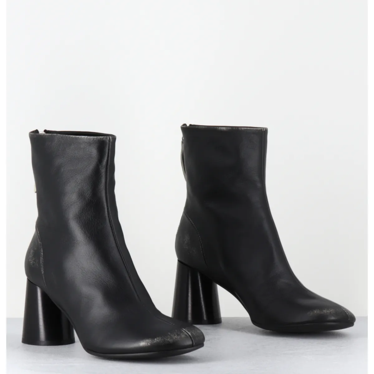Boots en cuir noir souple brossé pour un effet volontairement ‘usé’, bout rond, zip arrière, couture signature de la maison sur le contrefort, montés sur un talon haut cylindrique peint à la main en noir
