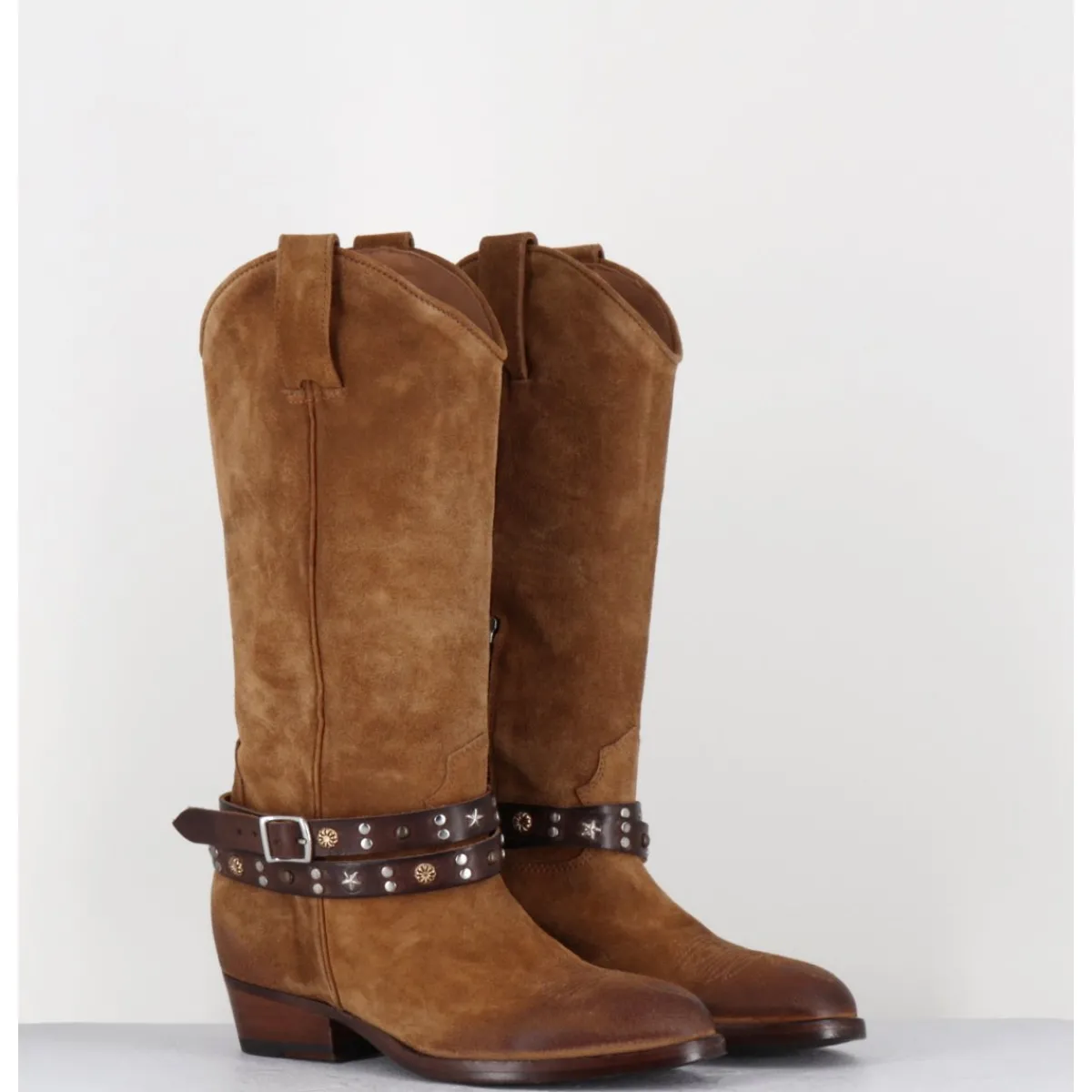 Bottes esprit carmaguaise en daim camel, bout effilé en amande avec surpiqure à l’avant, bracelet en cuir décorations texanes amovible, zip intérieur, montées sur un petit talon légèrement biseauté.