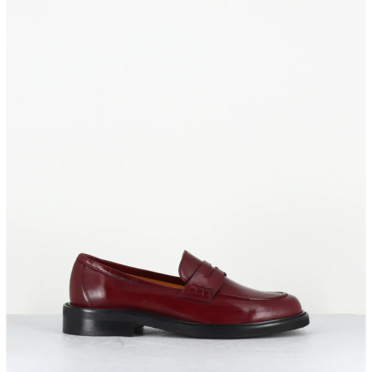 Mocassins plats en cuir bordeaux extrêmement souple, ligne pure montées sur une semelle en gomme ultra légère