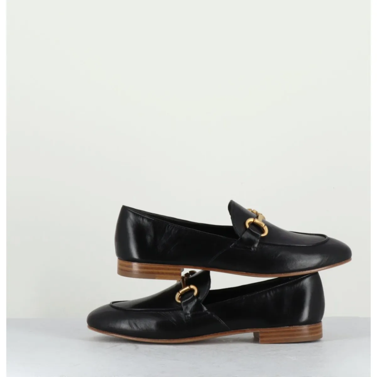 Mocassins plats en cuir noir extrêmement souple avec mors doré mat 70s et bout en amande. Chic & confortable !