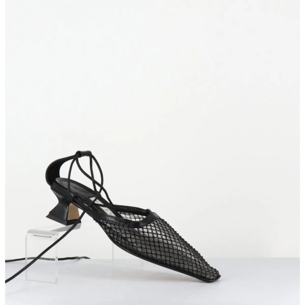Escarpins en cuir noir et résille orné de petits strass ton sur ton avec doublure en mesh clair, s’attache par de longs lacets en cuir que l’on noue autour de la jambe, forme effilée avec pointe carrée rappelant celles du début des années 2000, montées sur un petit talon pyramidal recouvert de cuir