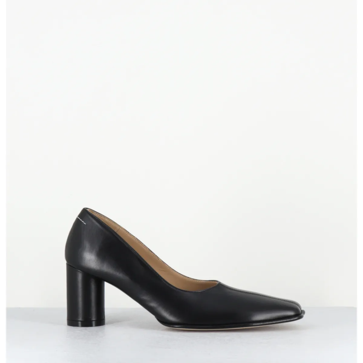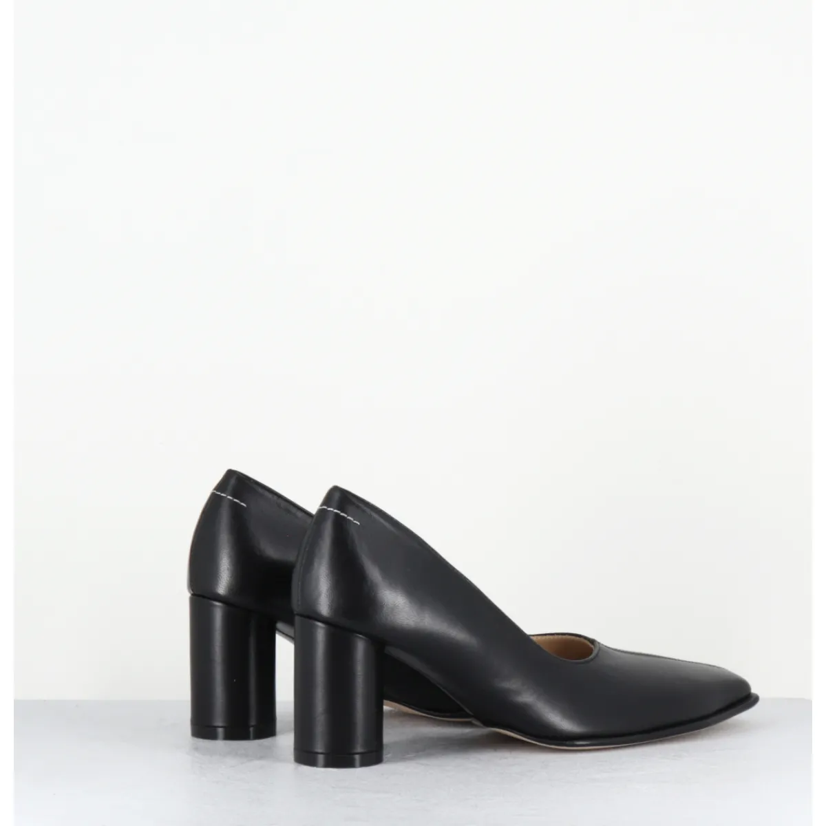 Escarpins en cuir noir, forme exagérée à pointe carrée avec couture centrale accentuant l’effet allongé, dotées du fameux talon cylindrique laqué avec le logo 6 imprimé sur la base et surpiqûres blanches à l’arrière et talo signature de la Maison