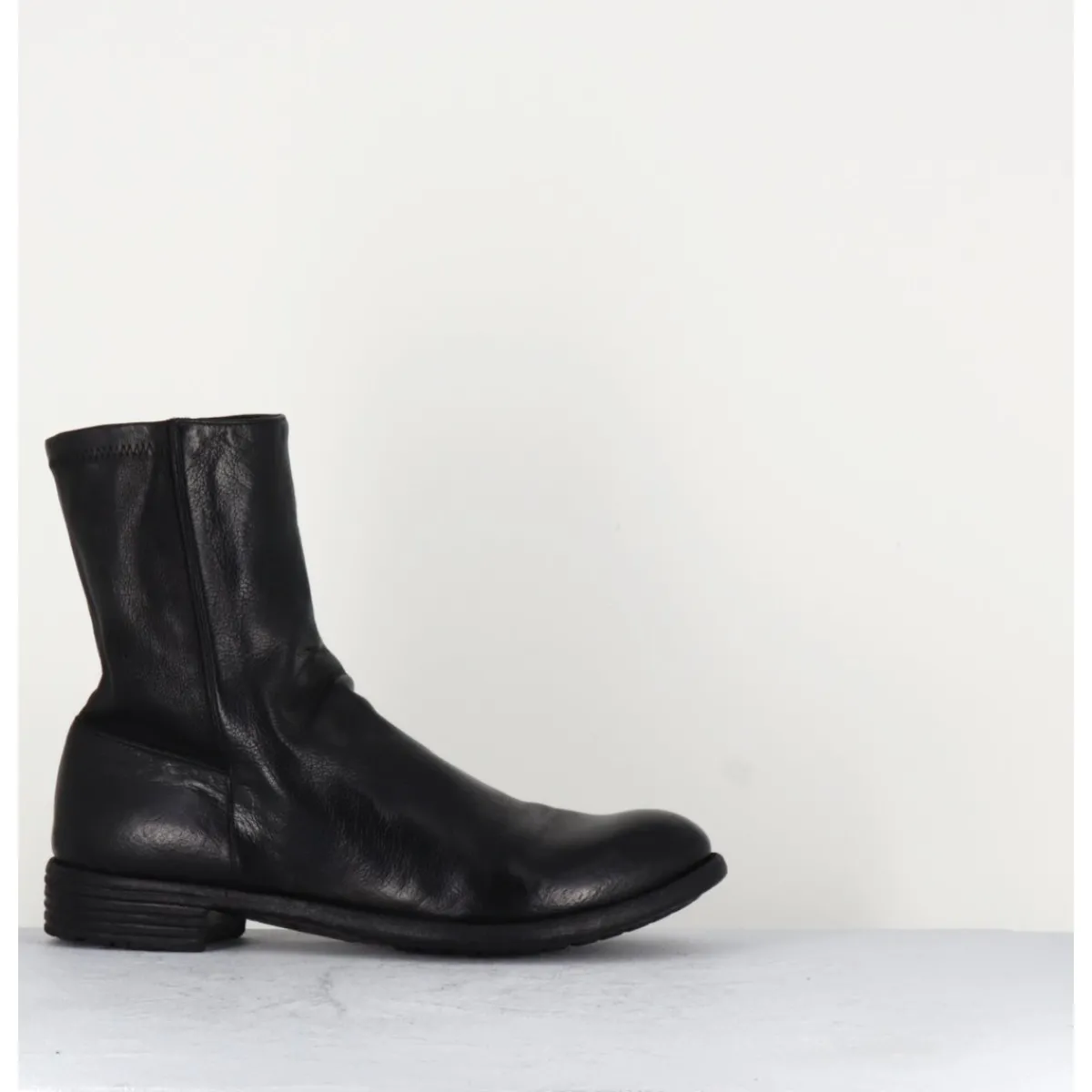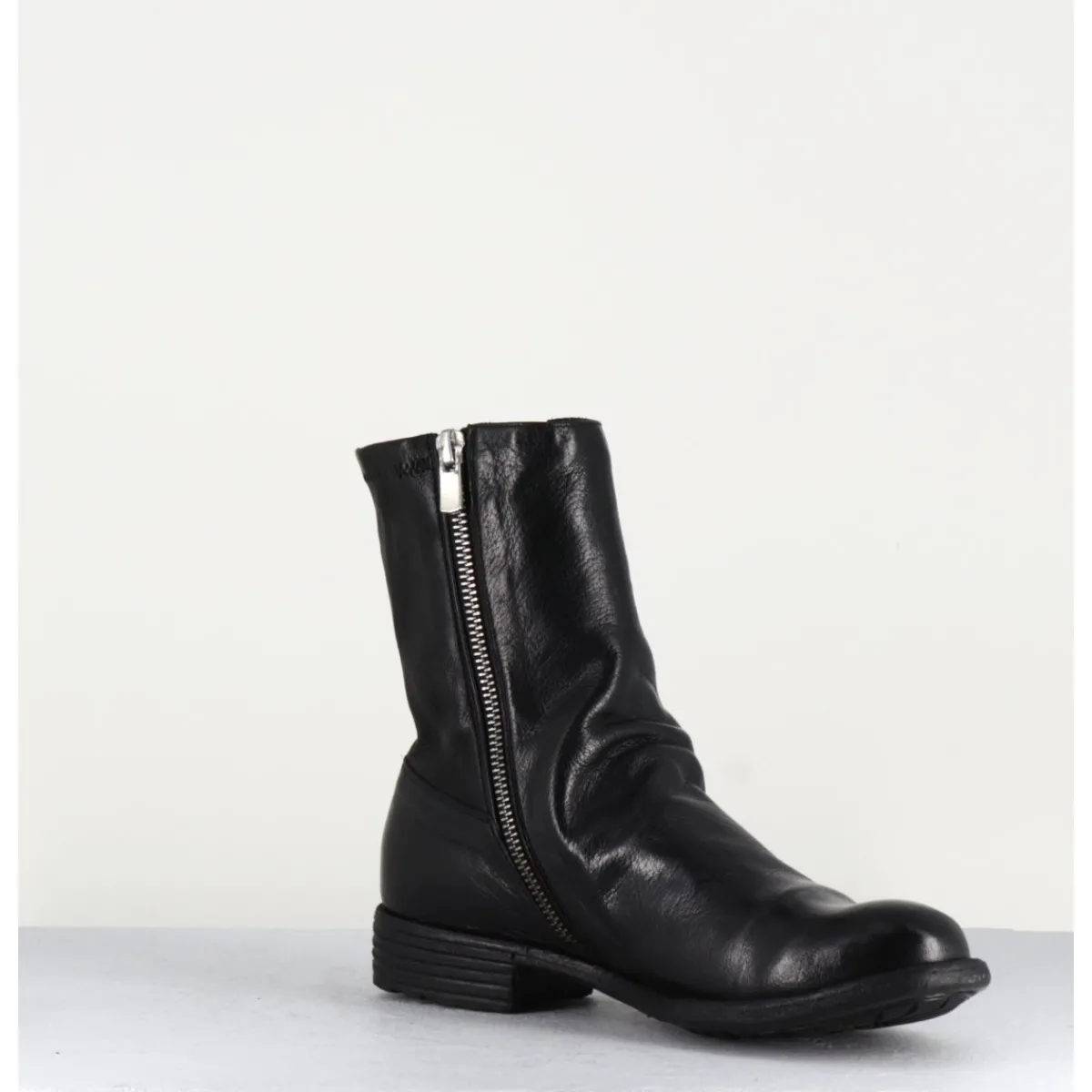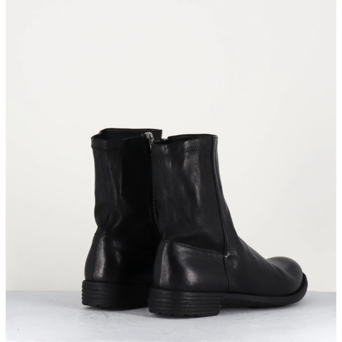 Bottines en cuir souple noir à bout en amande, présentant à l’arrière une partie en cuir stretch galbant élégamment la cheville; fermeture éclaire intérieure, montées sur un petit talon.