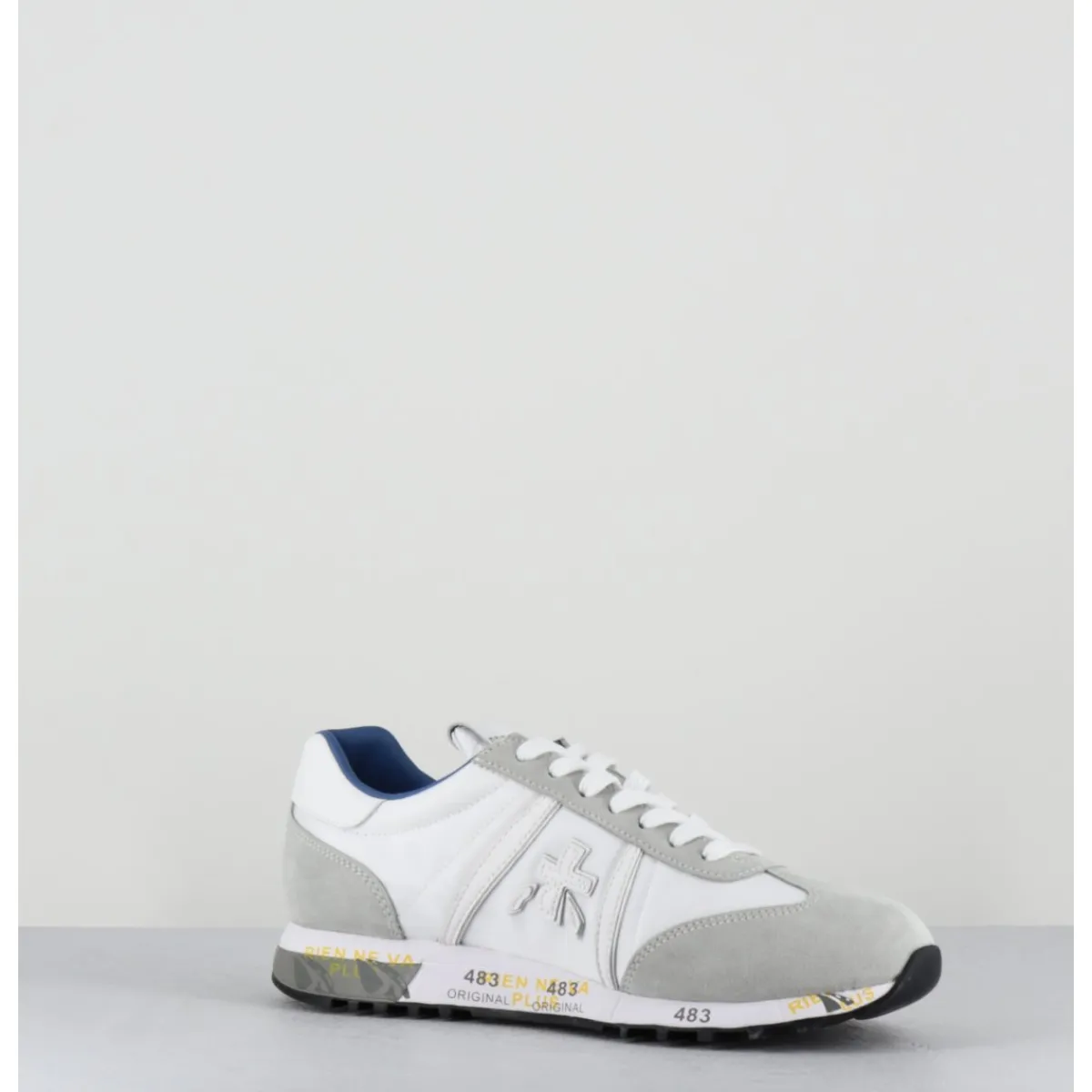 Baskets daim gris et toile technique blanche avec détails de cuir bleu à l’intérieur, montées sur une semelle légère, avec imprimé signature de la Maison Italienne Premiata