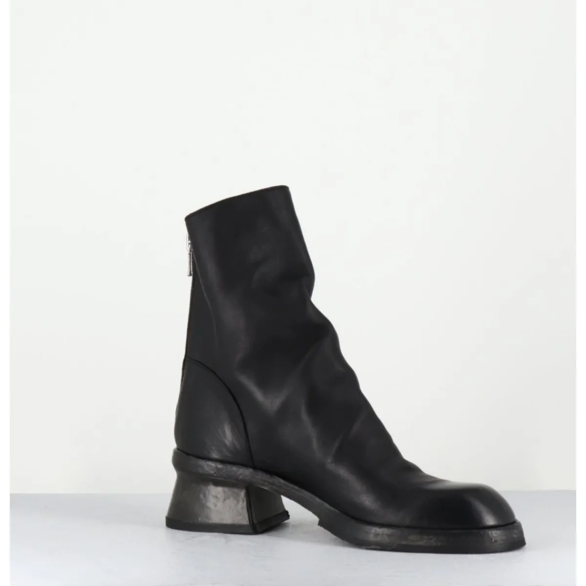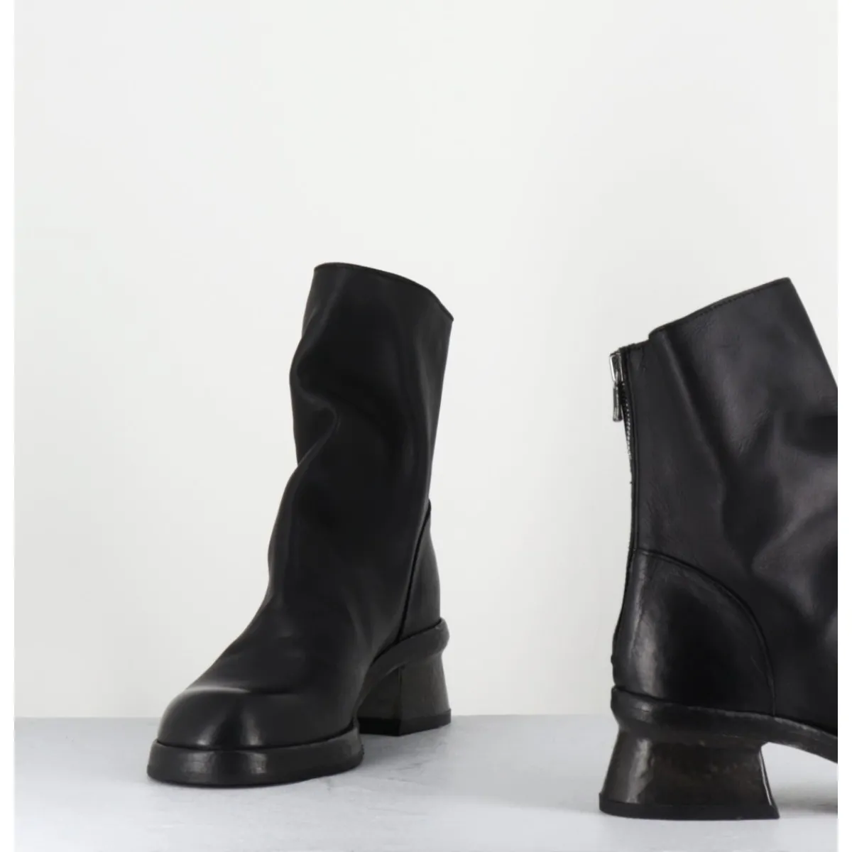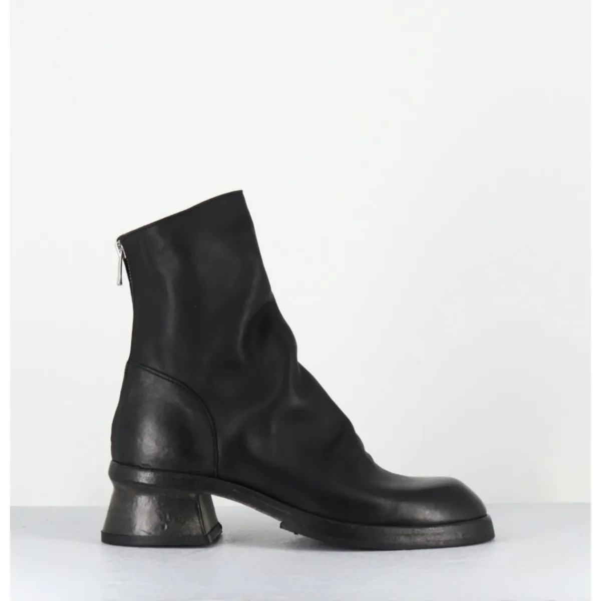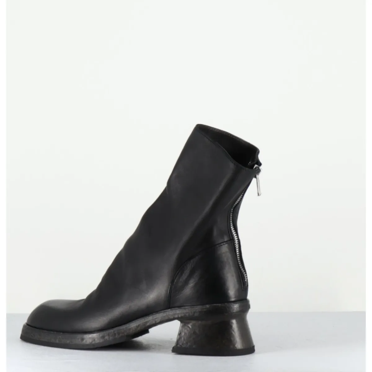 Boots en cuir noir souple lavé à la main pour un effet vintage « usé » sur la semelle, zip arrière, montées sur une double semelle cousue intégral et un petit talon légèrement déstructuré