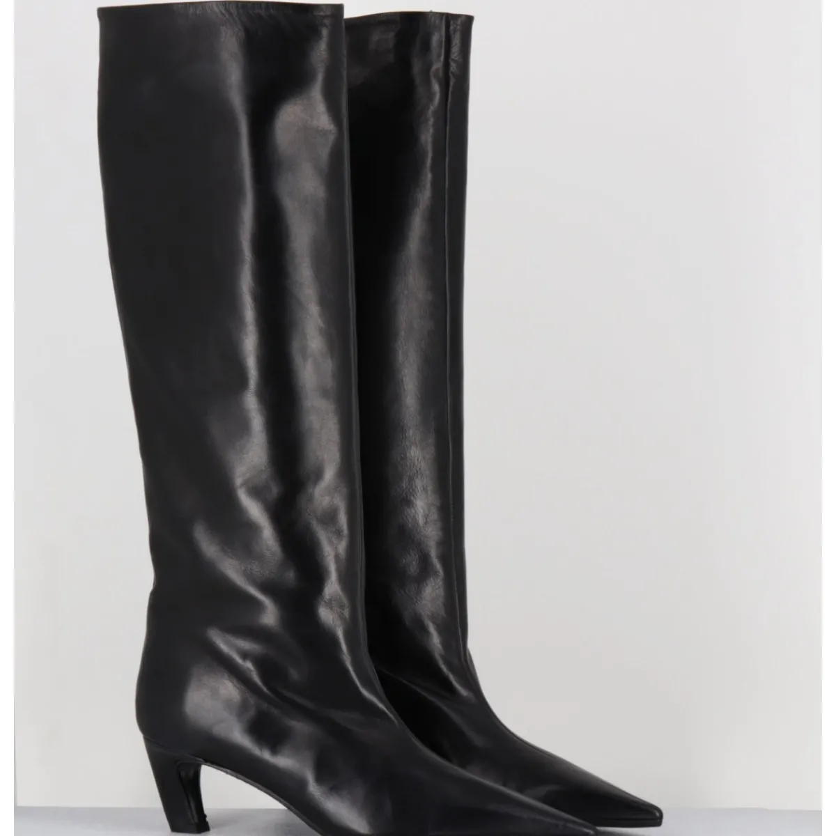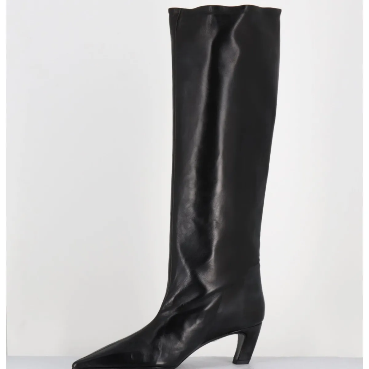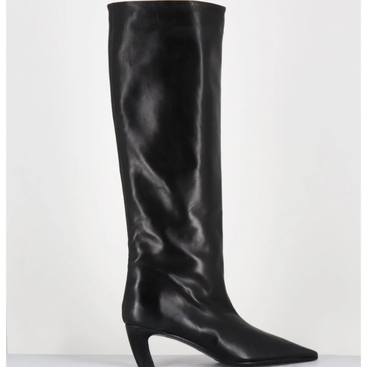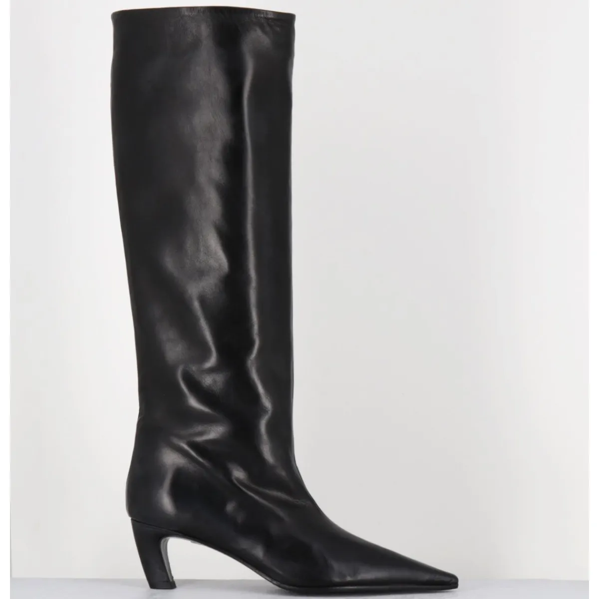 Bottes en cuir noir souple, bout pointu, ligne pure à tige droite qui s’enfile, montées sur un petit talon légèrement incurvé