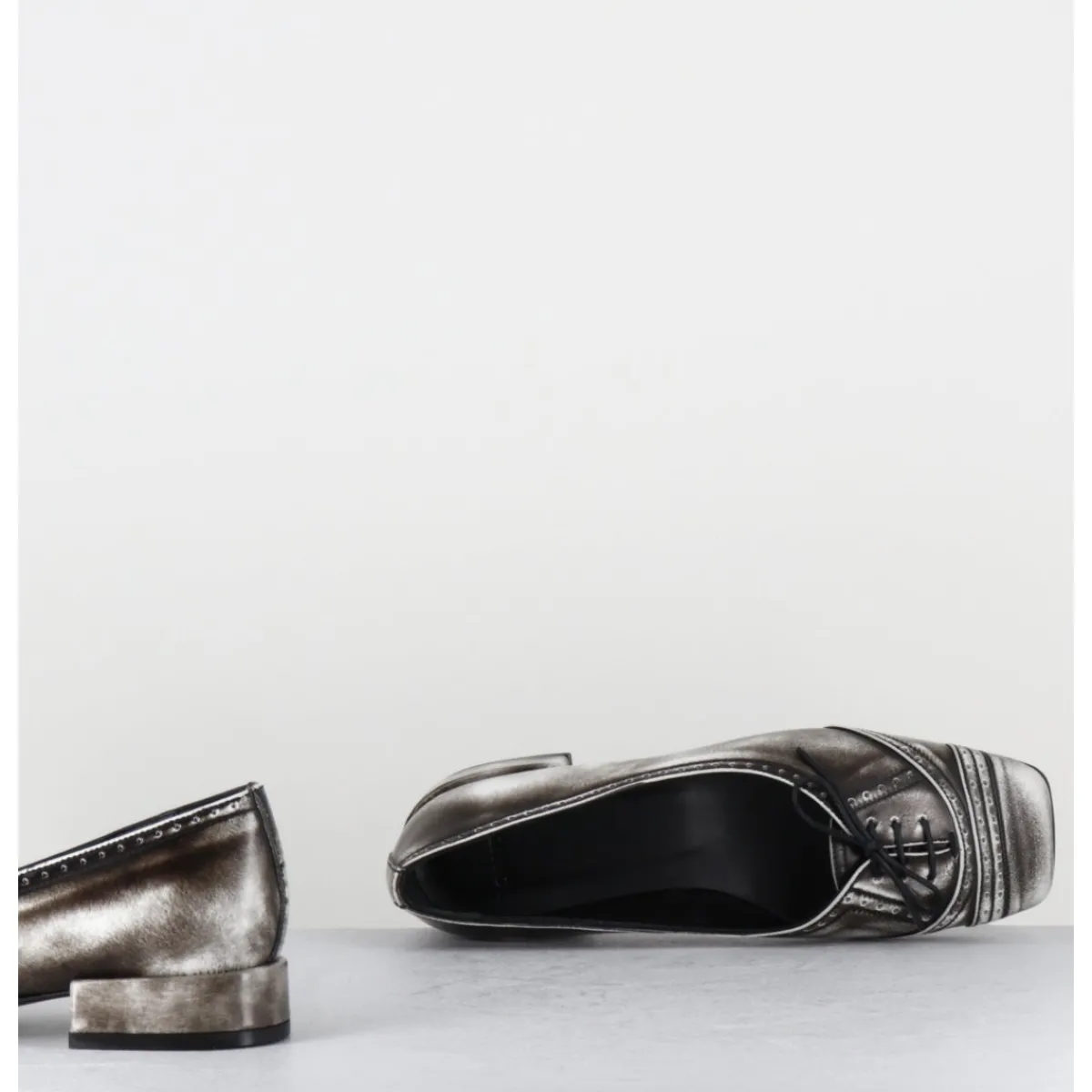 Ballerines en cuir glacé effet vintage noir et blanc, surpiqures trompe l’oeil et petit lacets à l’avant, montées sur un petit talon carré