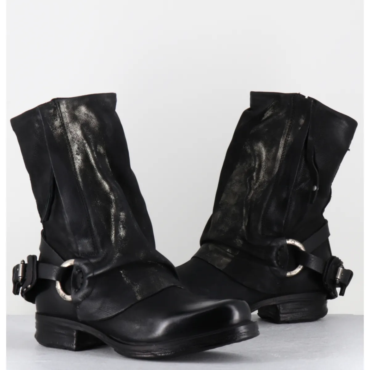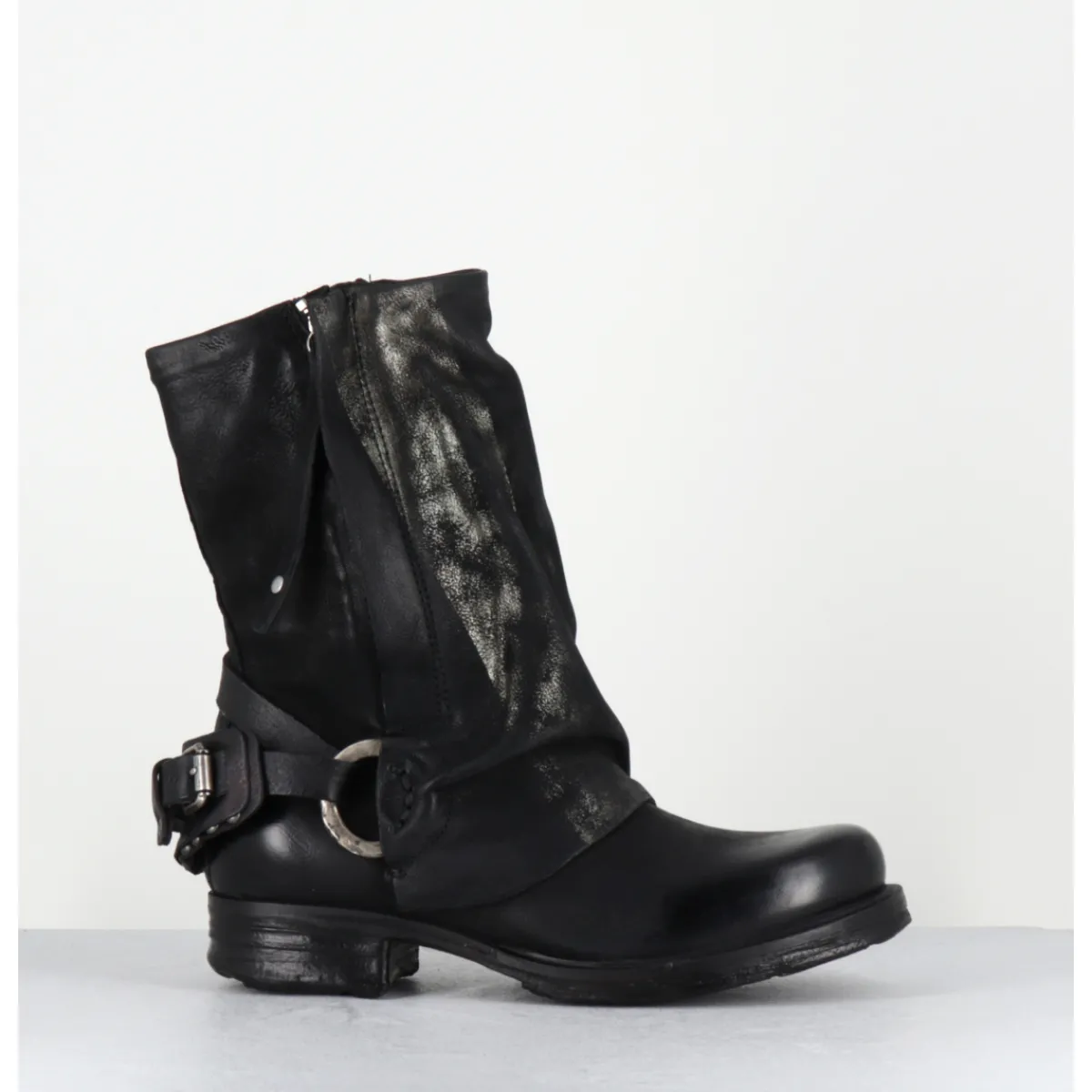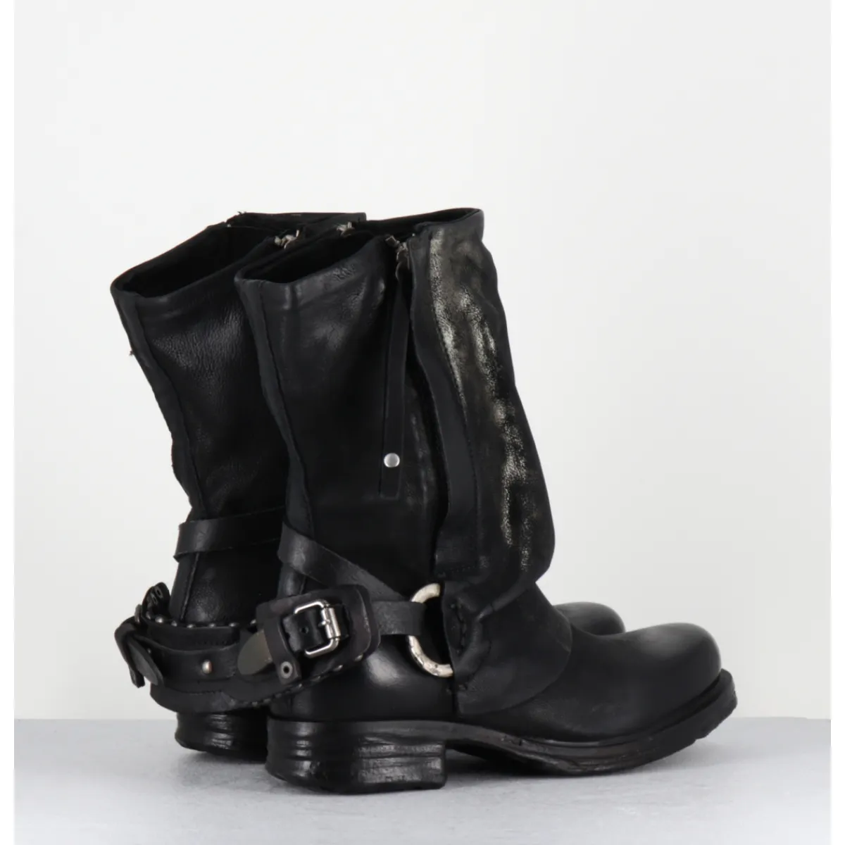 Boots bikers en cuir gras noir patiné pour un effet ‘vintage’ avec détails dorés, double zip, sangle réglable à l’arrière et empiècement volontairement froissé à l’avant. Ligne avant-gardiste, iconique de la Maison