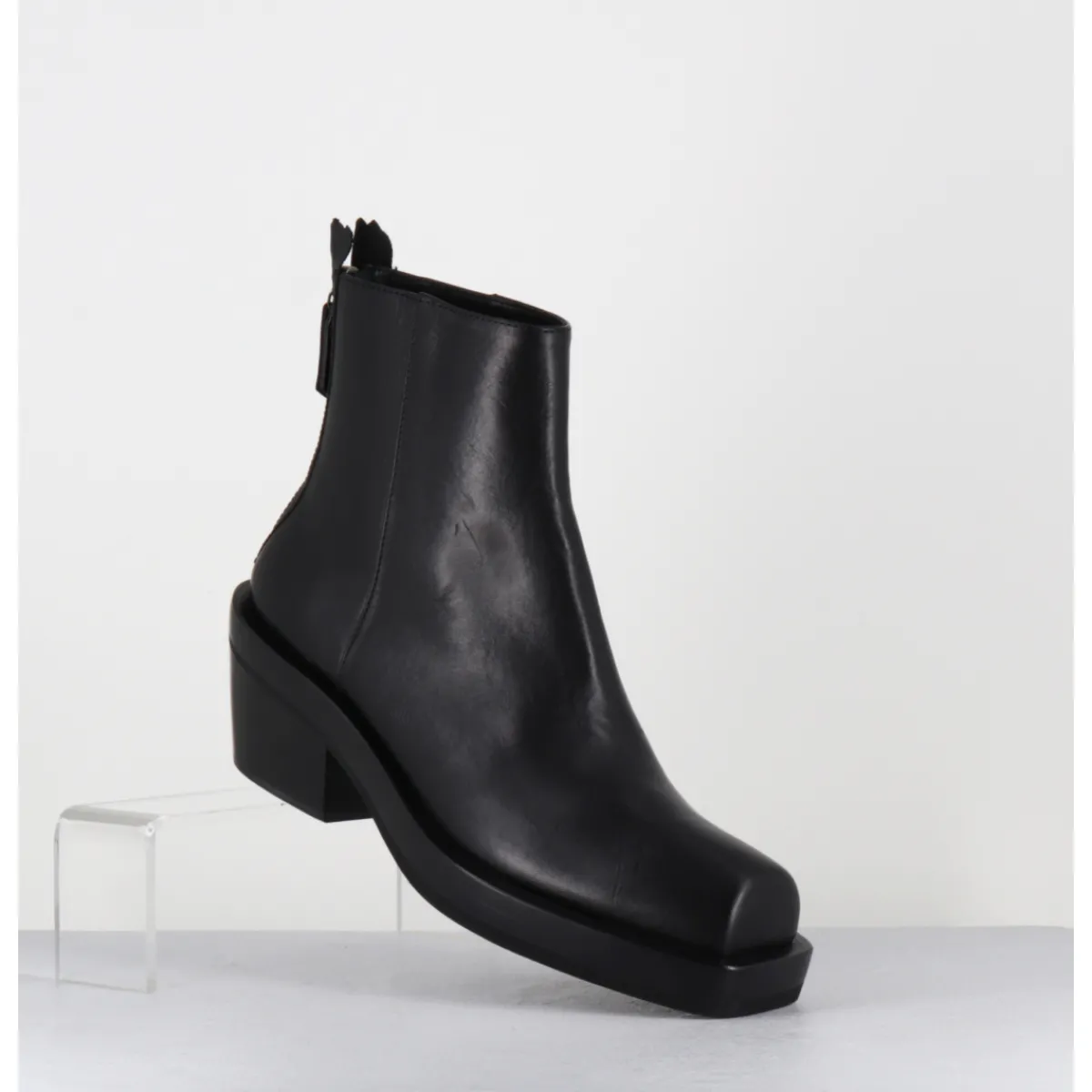 Boots courtes en cuir noir esprit bikers avec bout carré et zip arrière, montées sur une double semelle et un talon légèrement biseauté