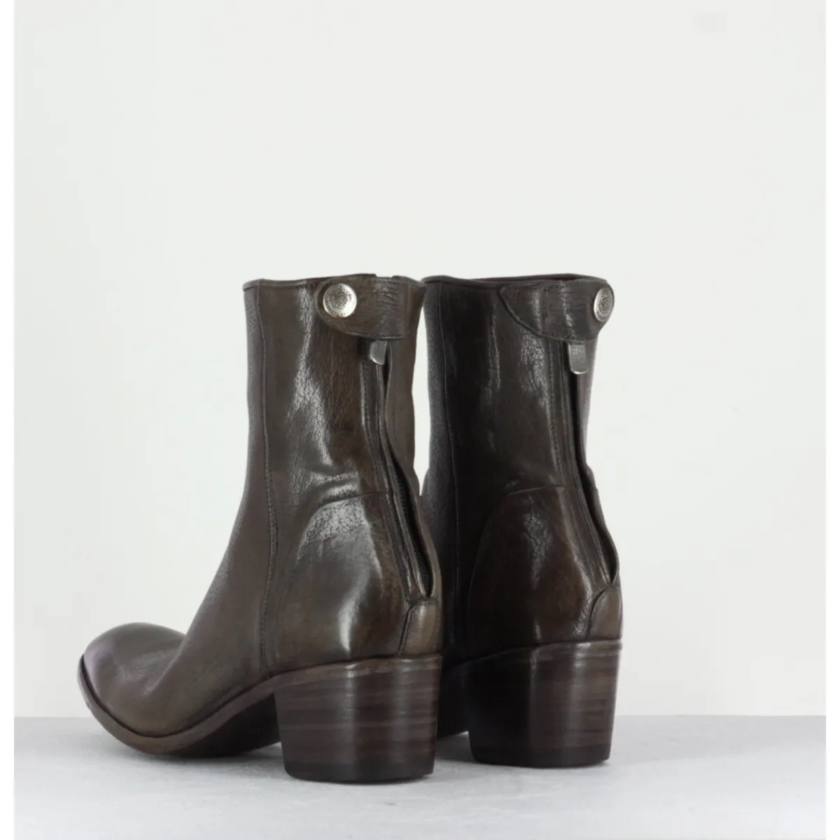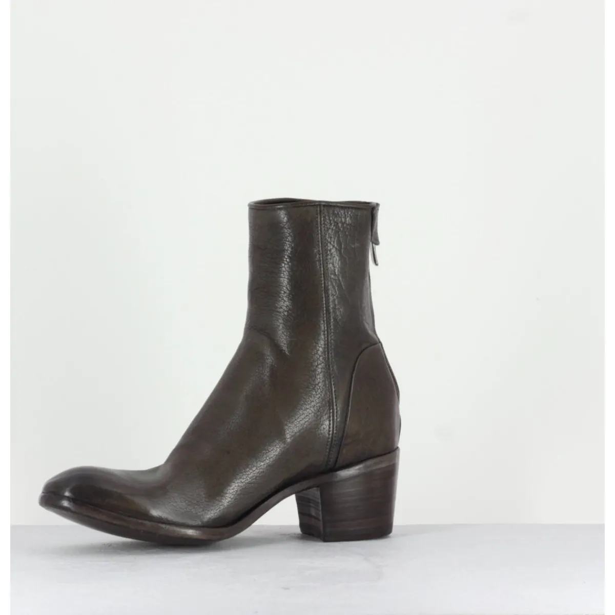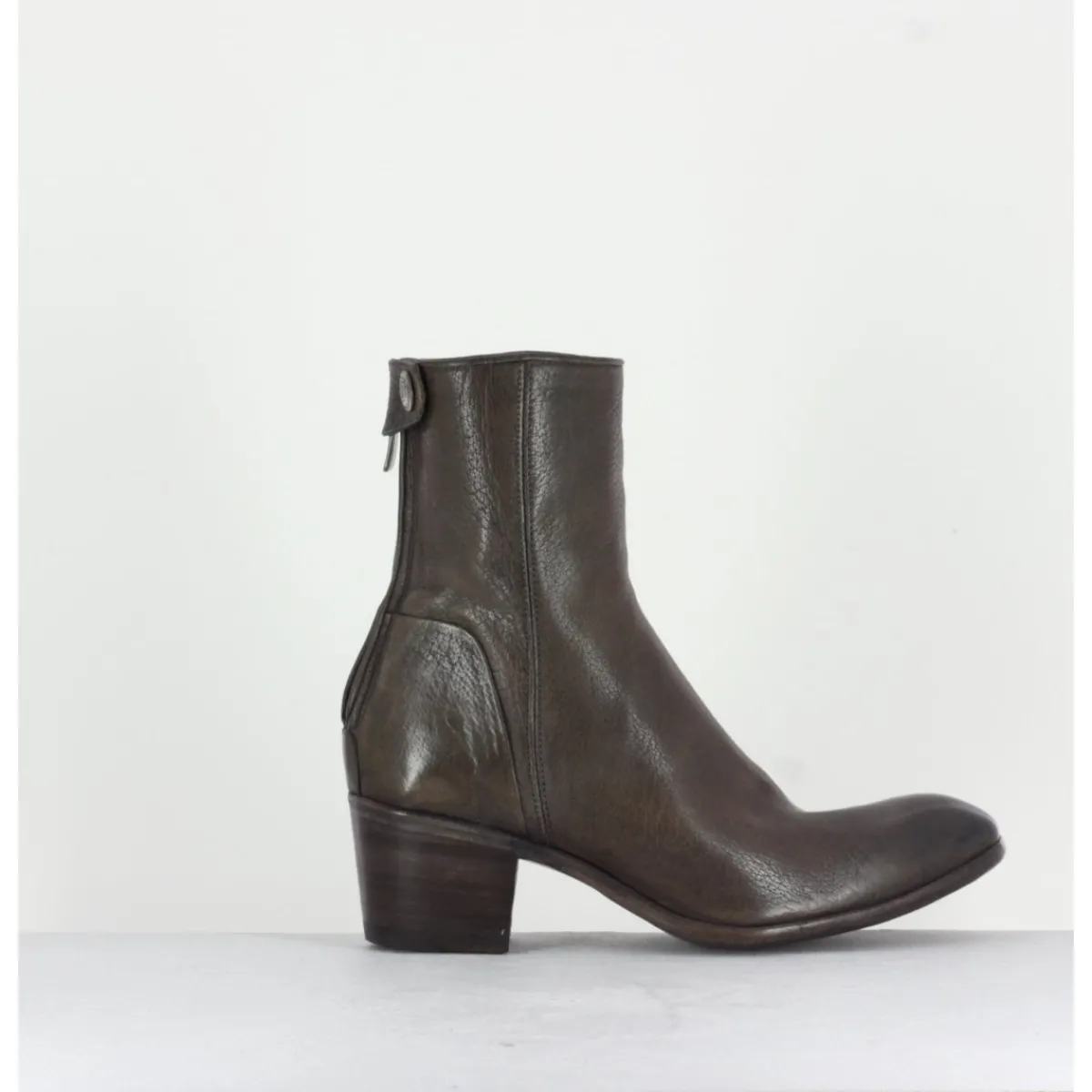 Bottine à tige mi-haute en cuir gris taupe souple avec fermeture arrière, montées sur un talon bottier. Fabrication artisanale.