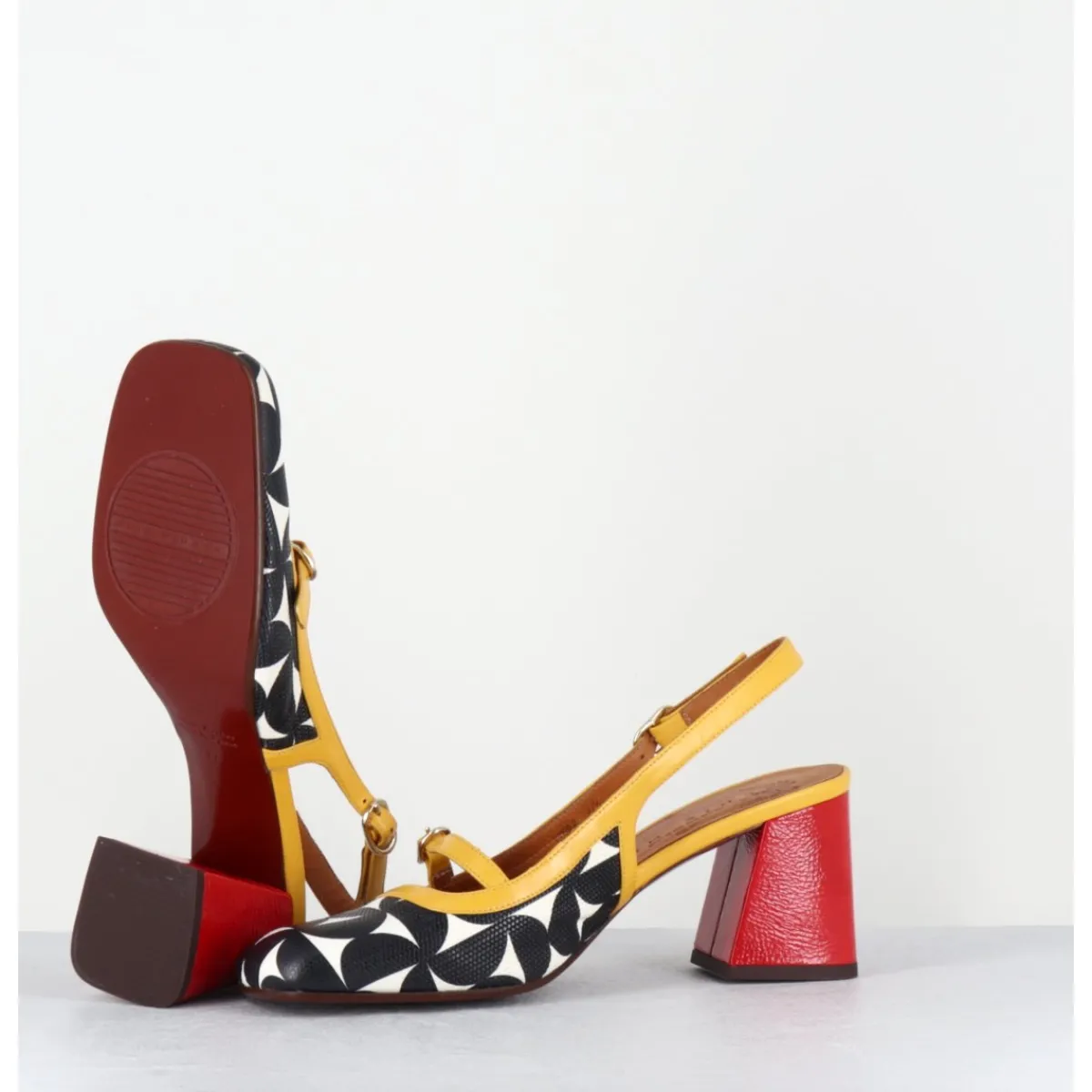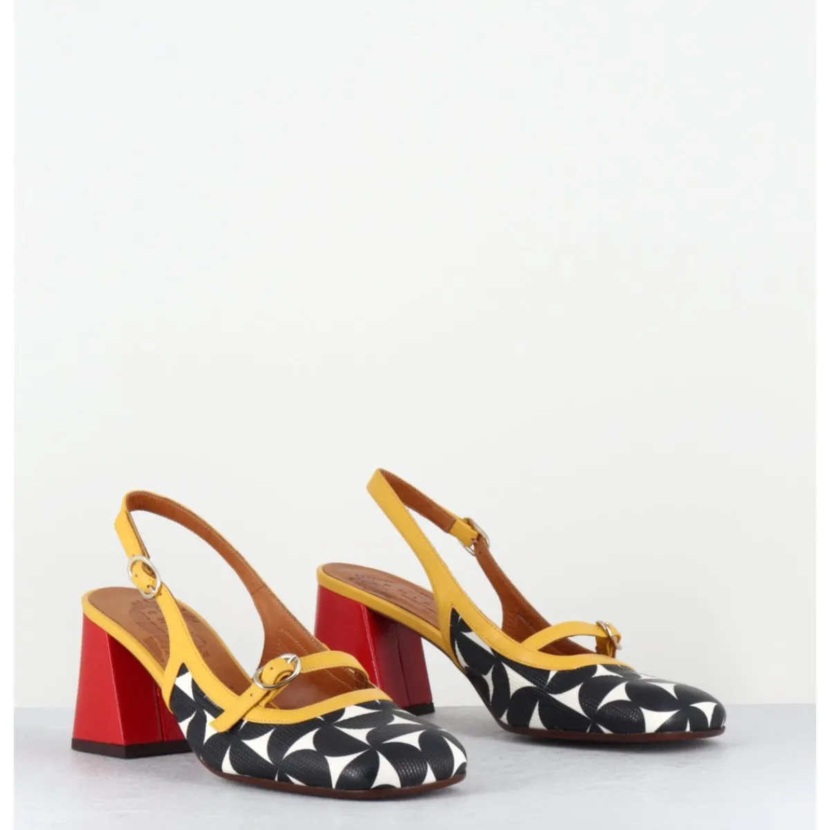 Babies slingback esprit vintage , motifs psychédélique noir & blanc à l’avant & brides en cuir jaunes réglables, montés sur un talon légèrement évasé vernis rouge
