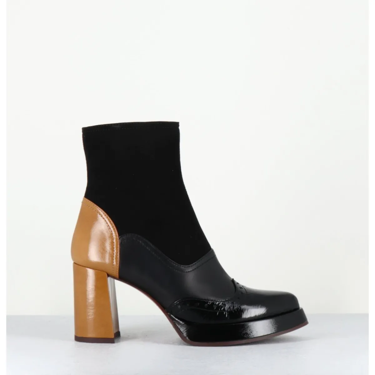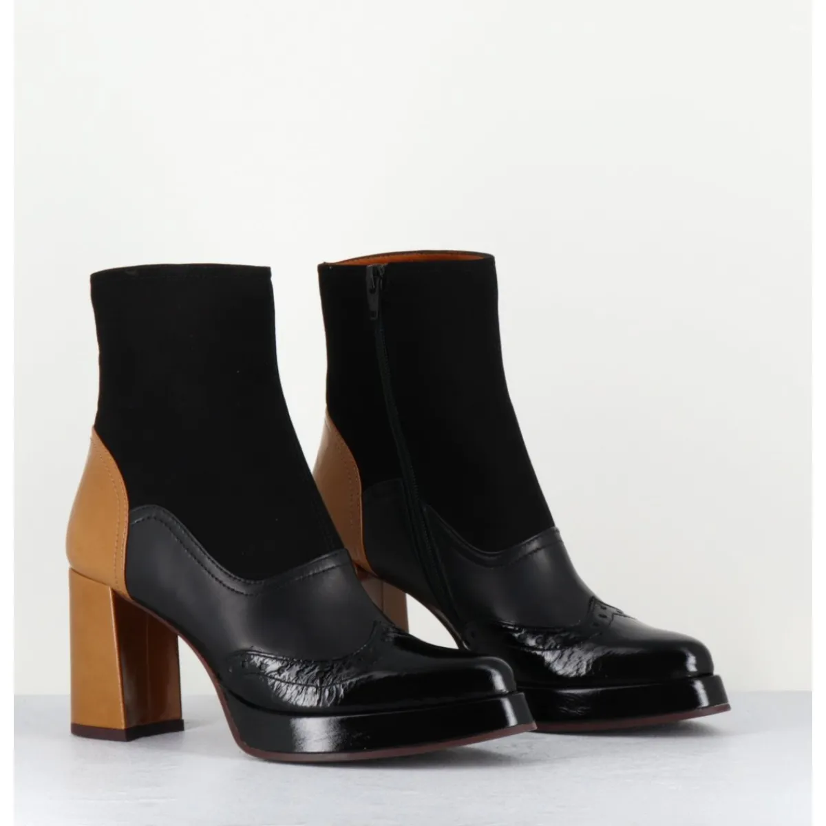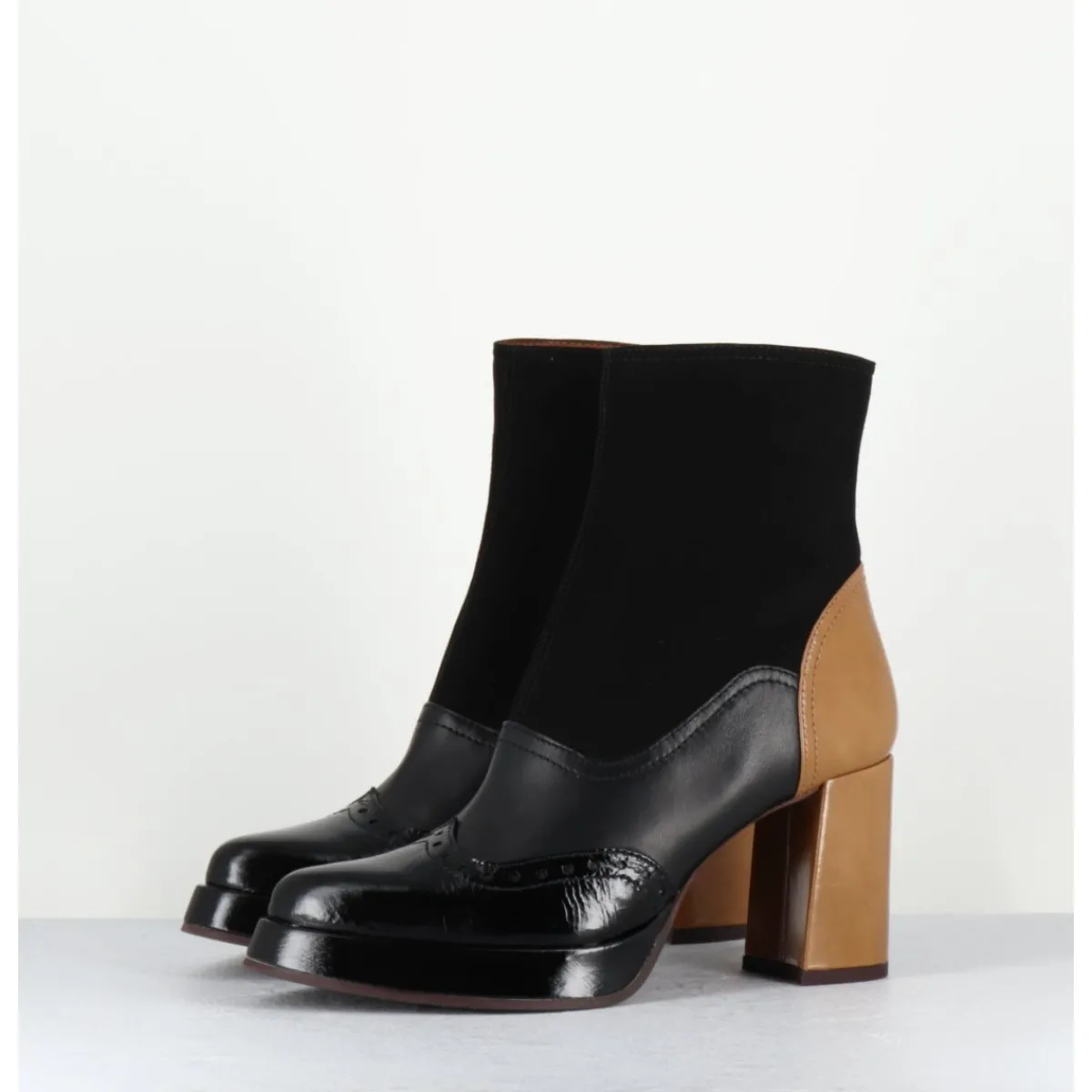 Boots multi-matière daim – cuir – vernis noir avec bout fleuri à l’avant et cuir beige légèrement brillant à l’arrière, bout effilé pointu doux, montées sur un talon droit, et une petite plateforme confortable.