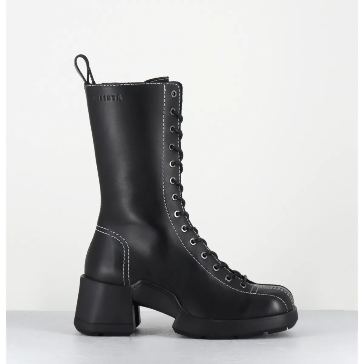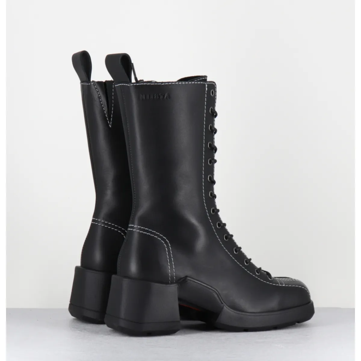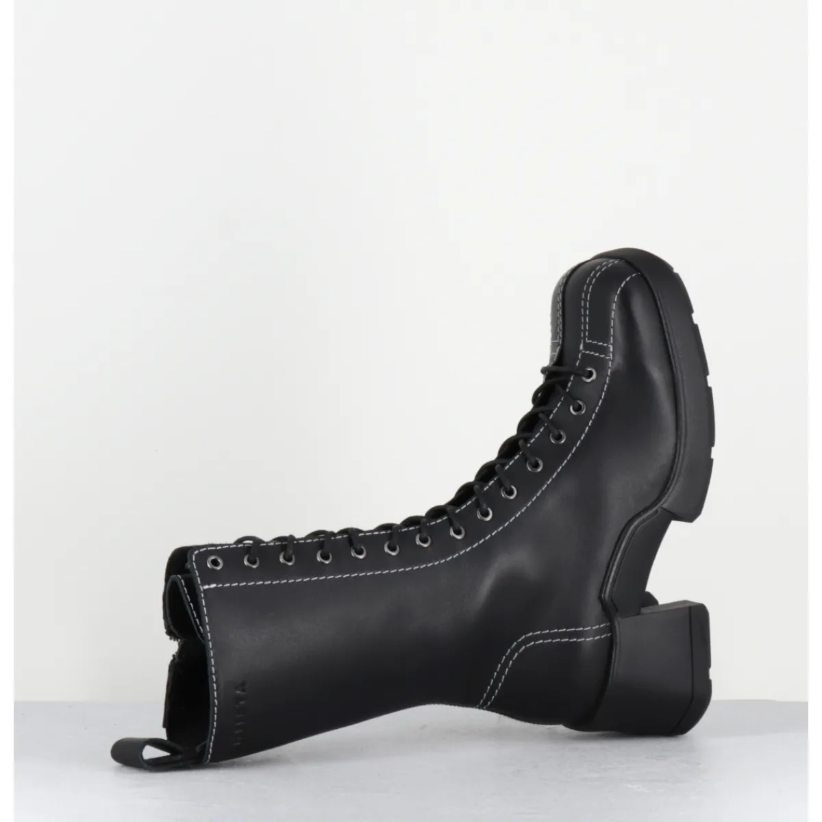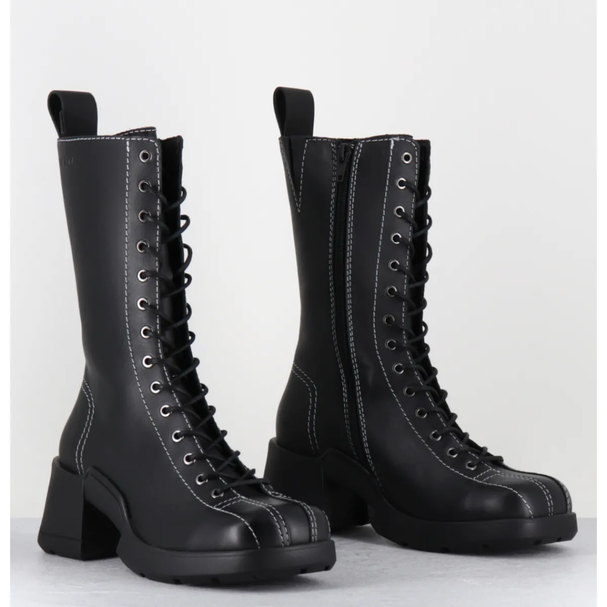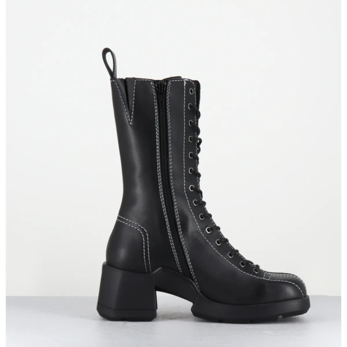 Boots à lacets en cuir noir avec zip intérieur et surpiqûres blanches esprit années 90, montées sur une semelle en gomme et un talon bloc décroché