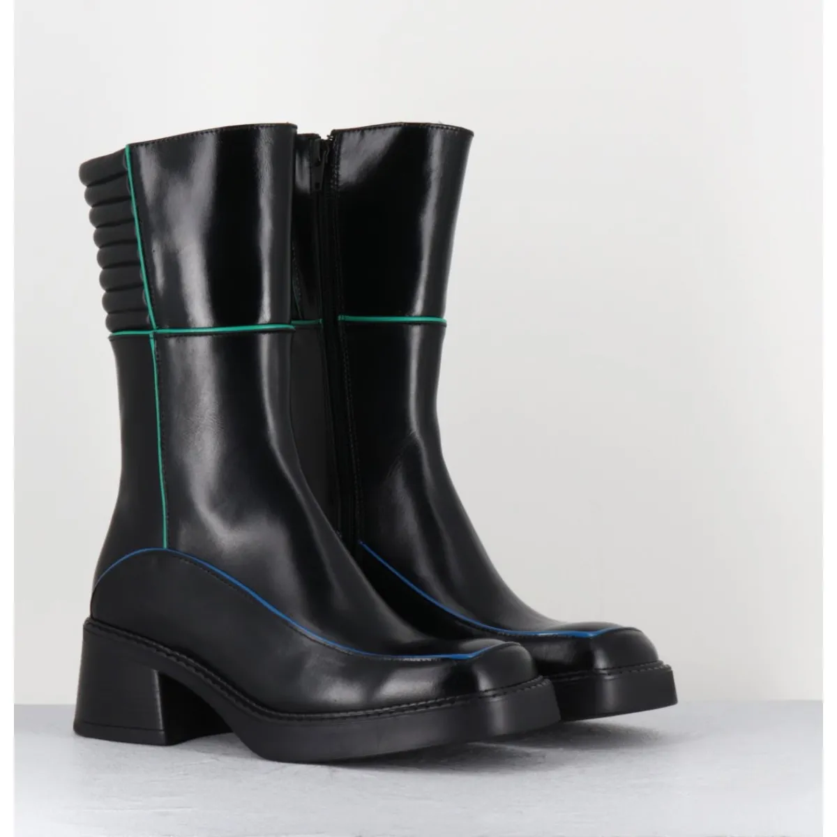 Boots en cuir noir, découpes & surpiqûres brogues esprit années 90 couleur bleu & vert, bout carré arrondi, arrière matelassé motard, montés sur un petit talon bloc et une fine plateforme en gomme confortable