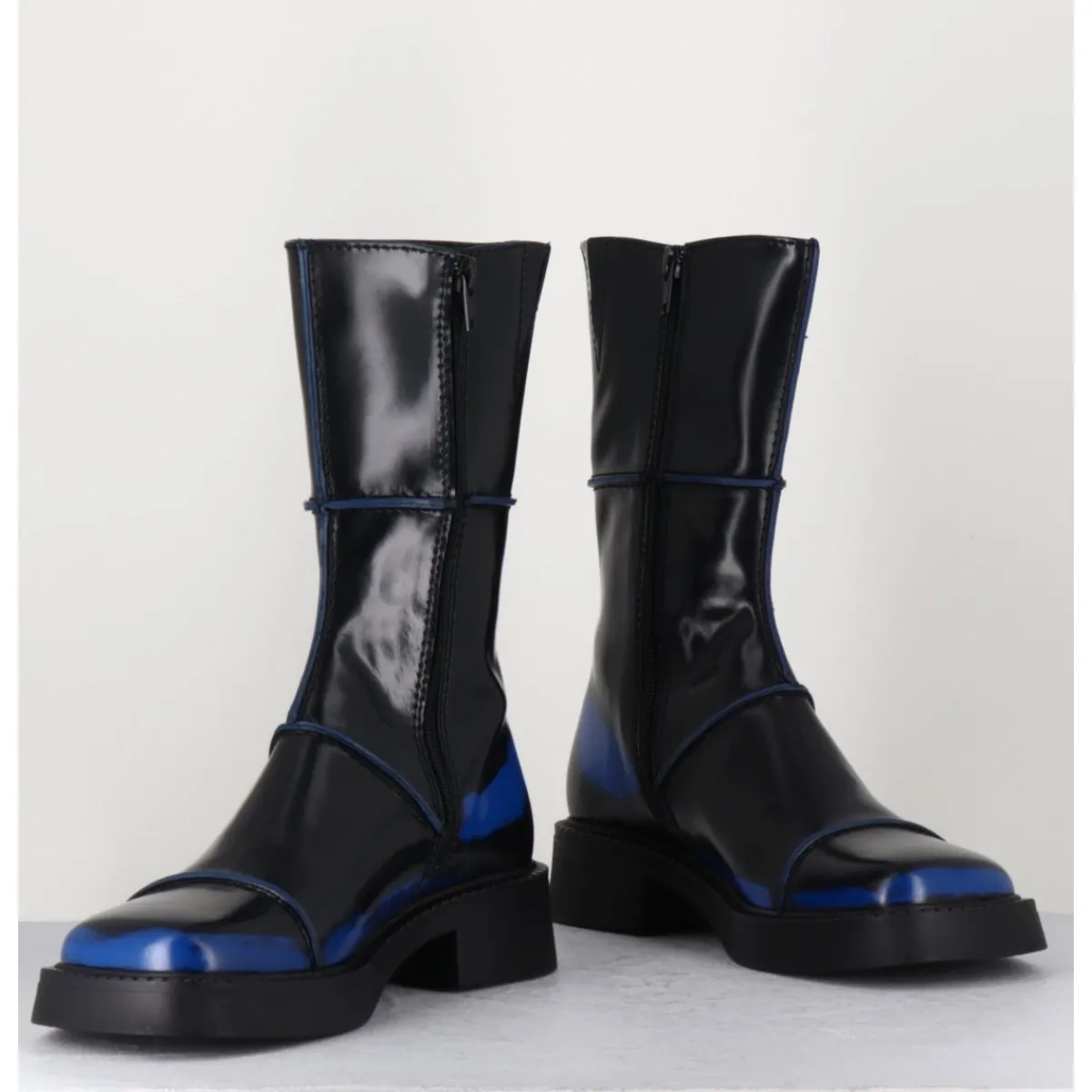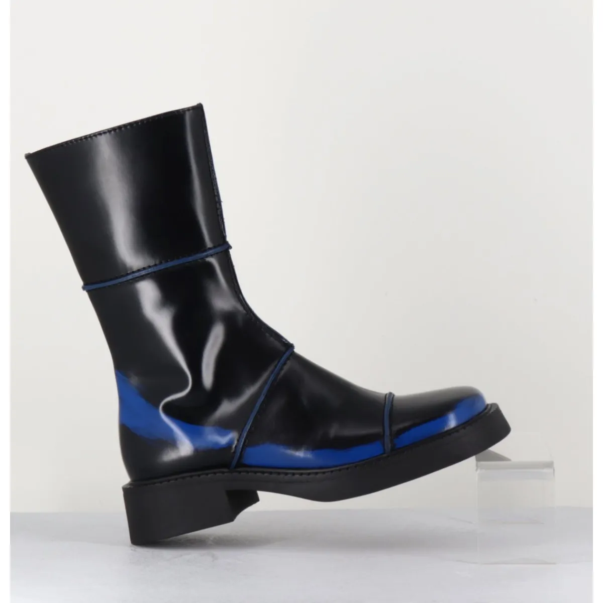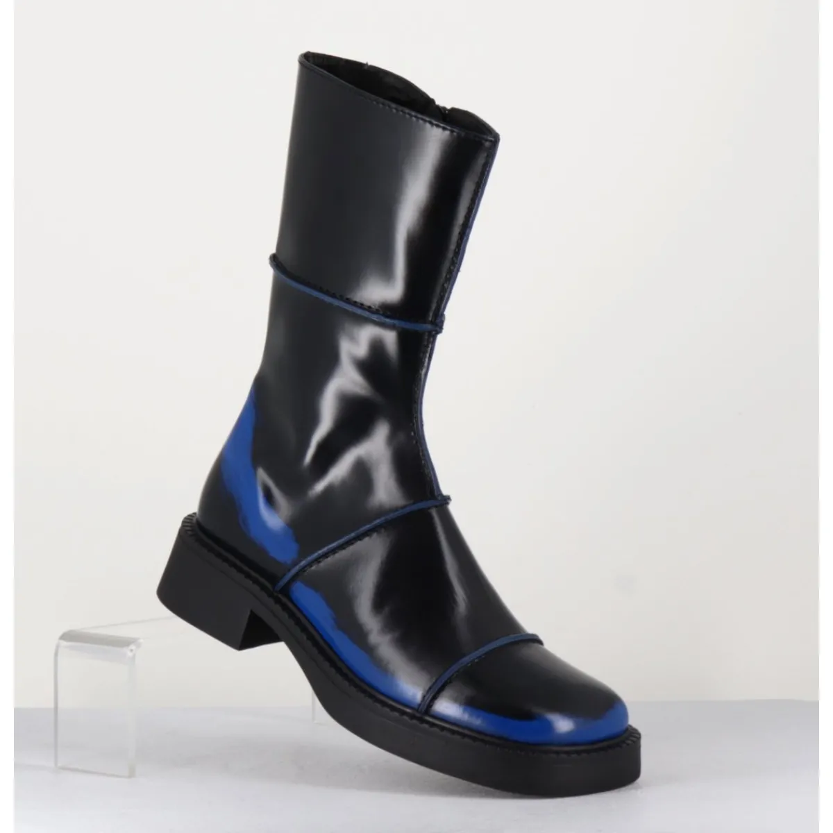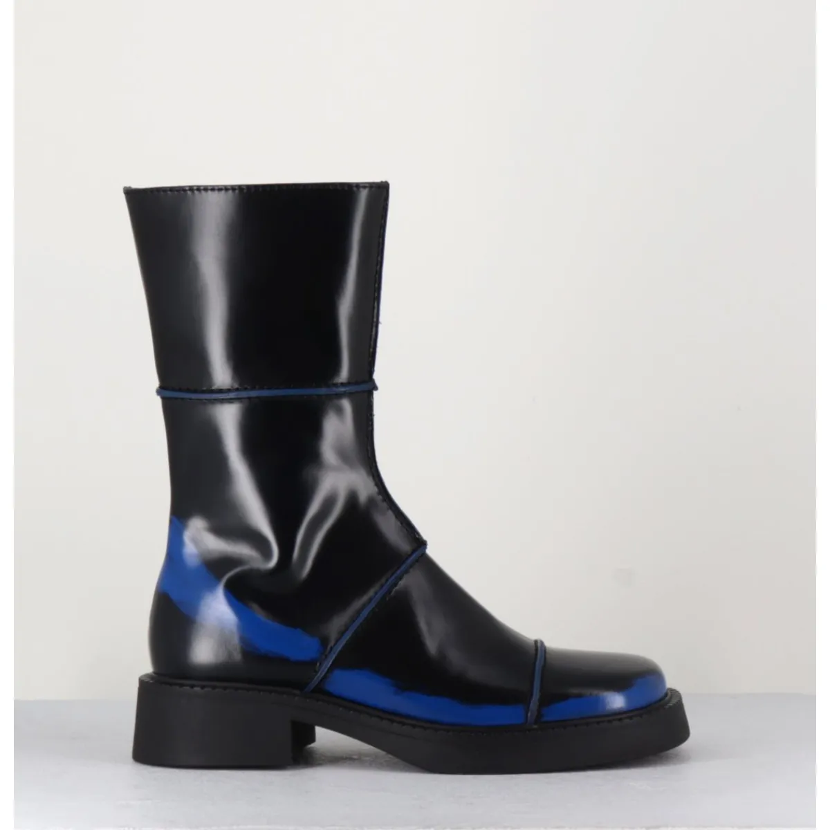 Boots tige mi-haute à bout carré large, cuir noir lisse brossé à la main pour obtenir cet effet bleu vieilli, faites d’une série d’empiècements aux coutures apparentes terminées par des bords bleus, zip intérieur, montées sur une semelle et un petit talon bloc en gomme.