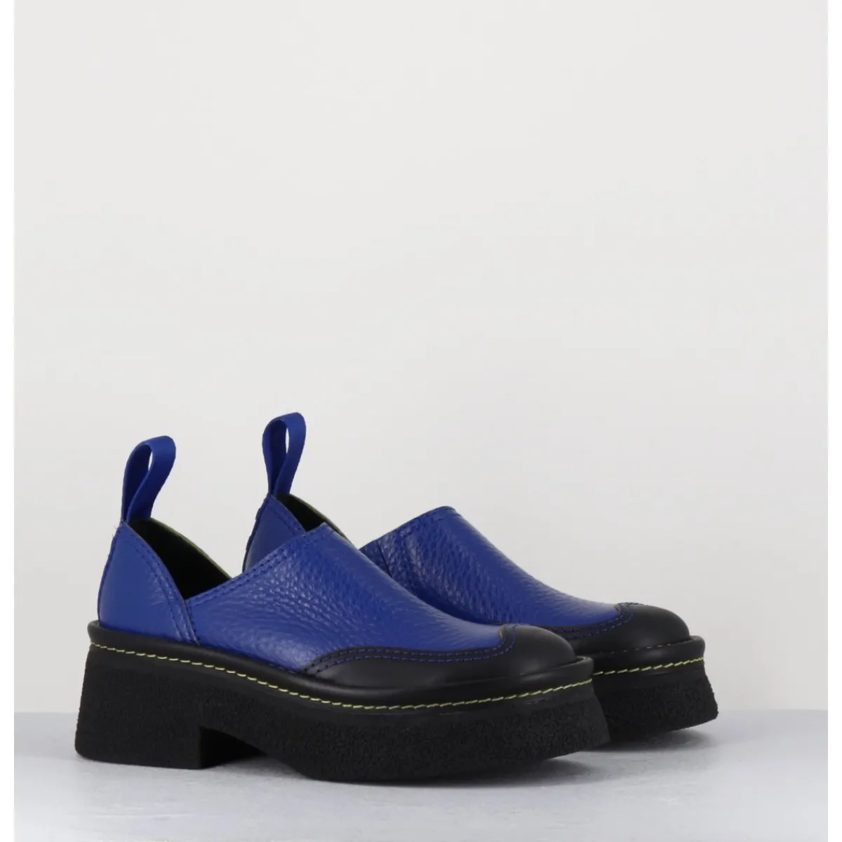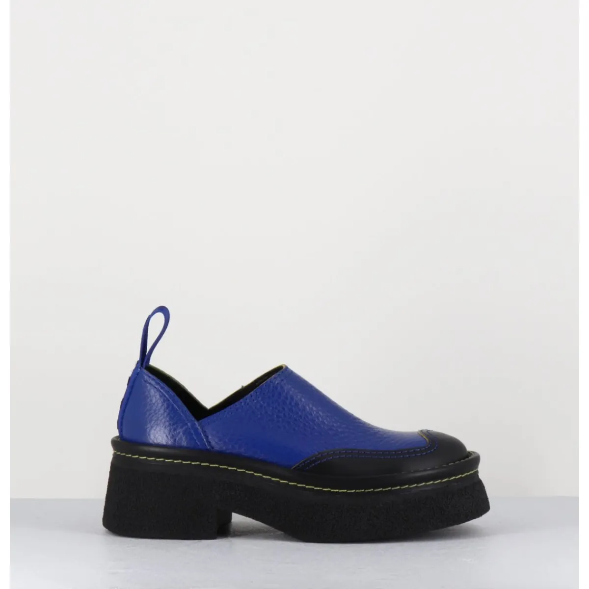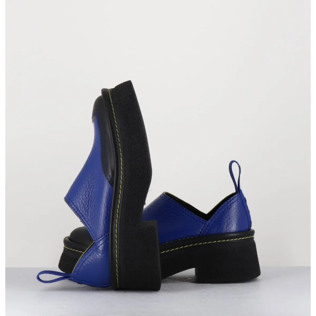 Entre le sabot et la mule, Odile est réalisé dans un cuir grainé bleu électrique, découpe avec empiècement gomme noire à l’avant, bout arrondi esprit 90s, montées sur une semelle épaisse en gomme texturé avec surpiqures jaunes contrastantes et un petit talon confortable légèrement évasé, signature de la Maison Miista à l’arrière de la chaussure