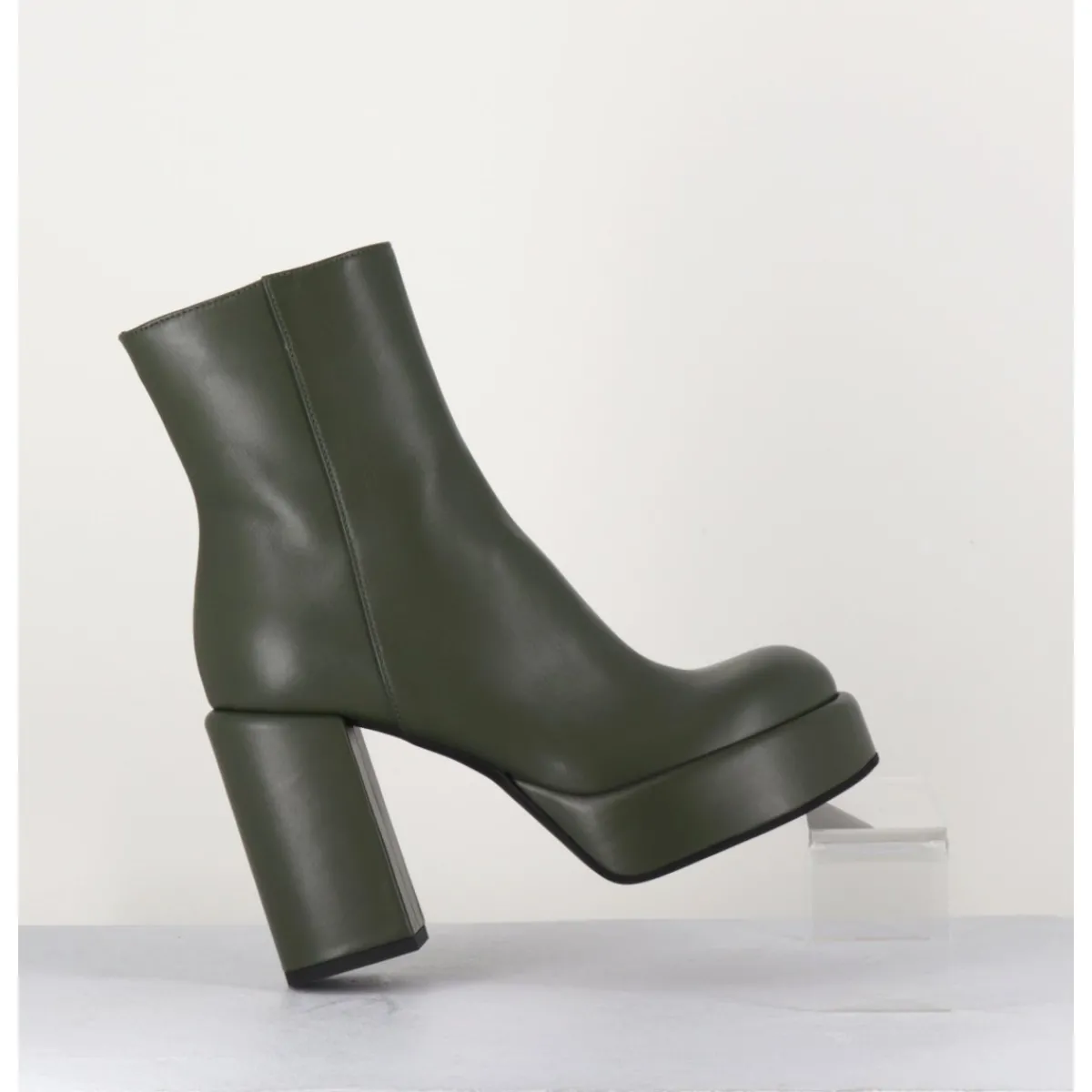 Boots 70s en cuir khaki, bout rond anatomique, zip intérieur, montées sur une plateforme et un talon stylisés et recouverts.