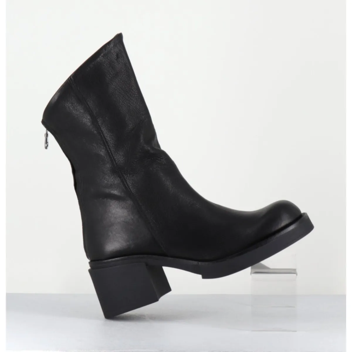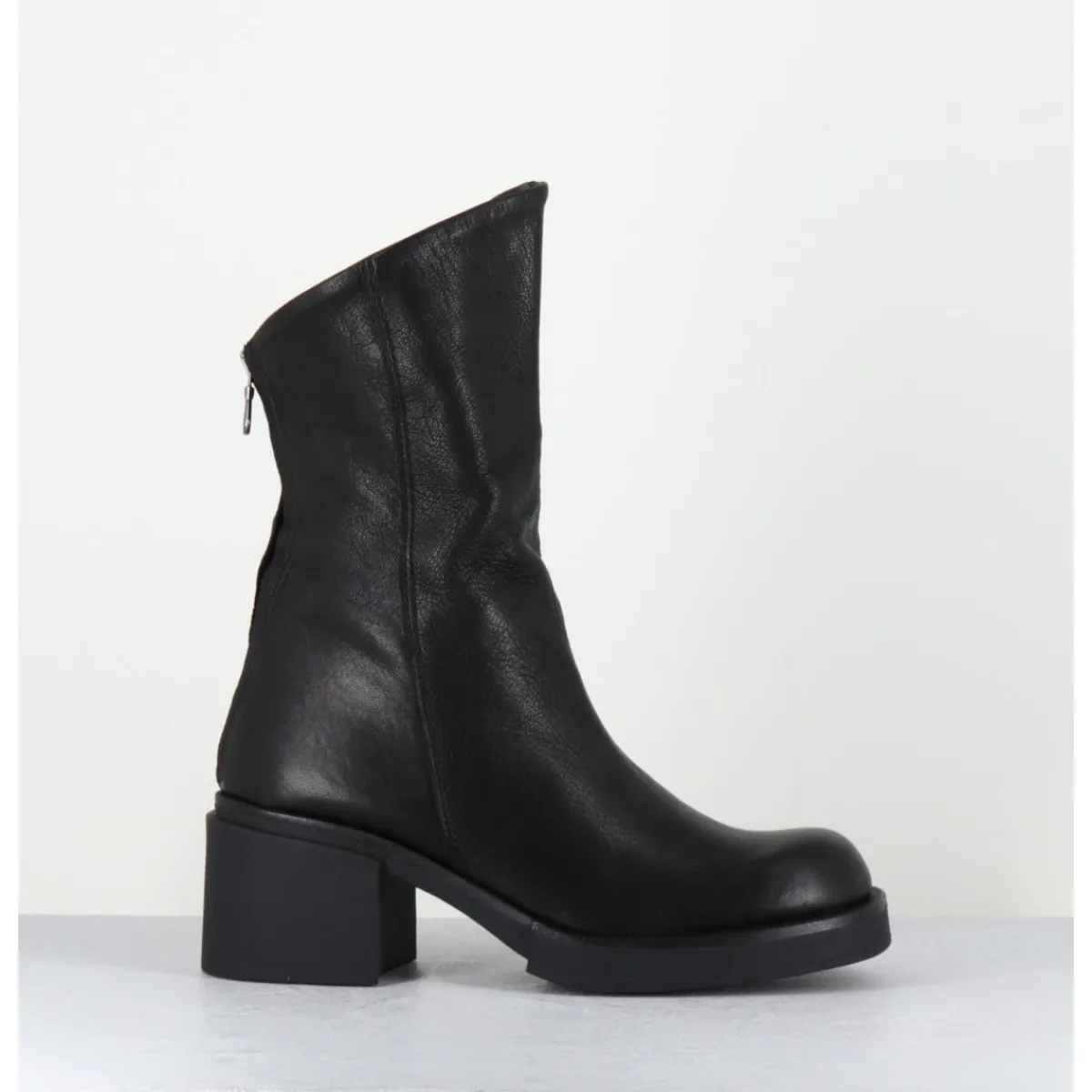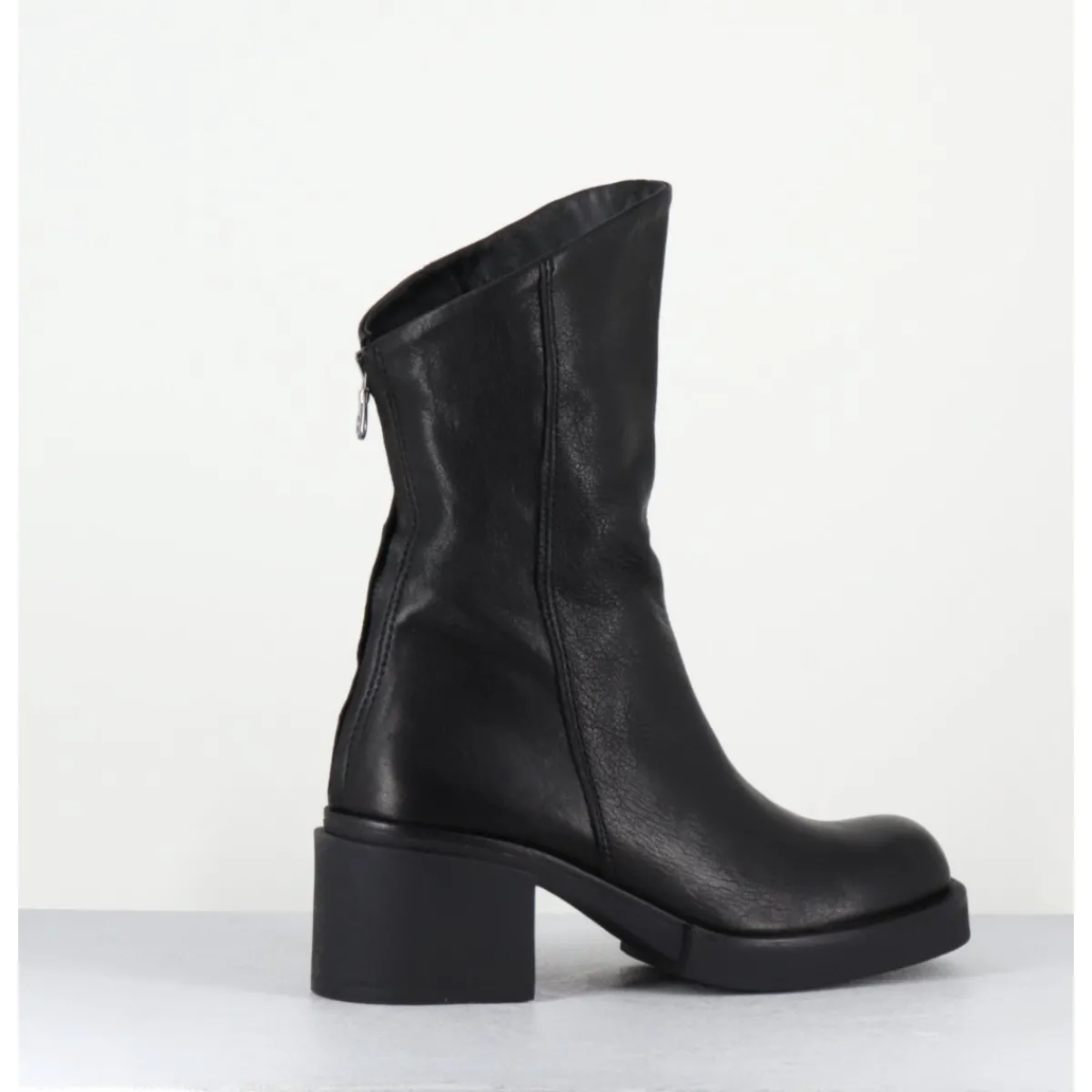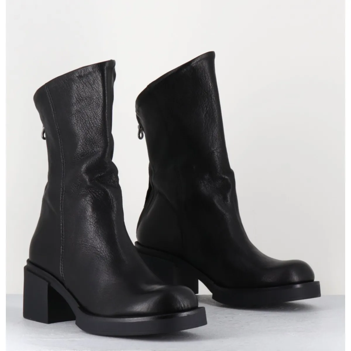 Boots esprit biker en cuir grainé noir effet froissé sur la jambe, tige mis-haute à découpe asymétrique, zip arrière, montées sur une semelle en gomme ultra légère et un talon bloc confortable