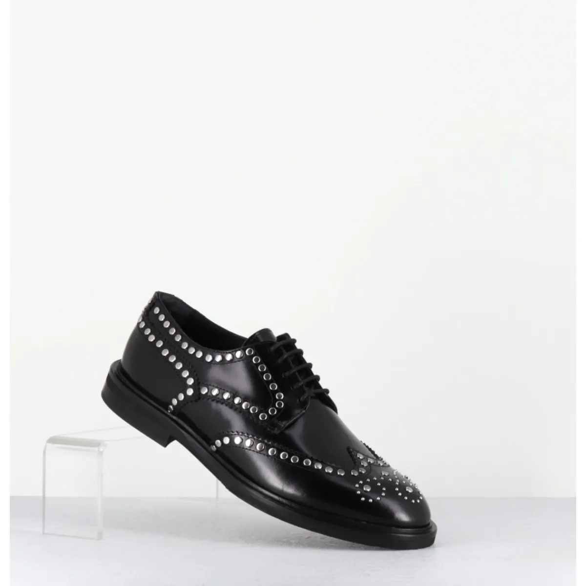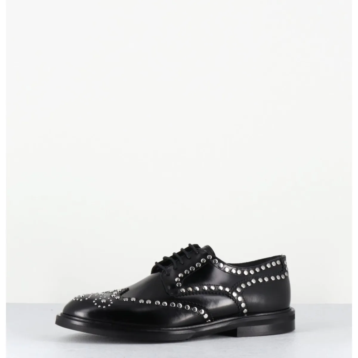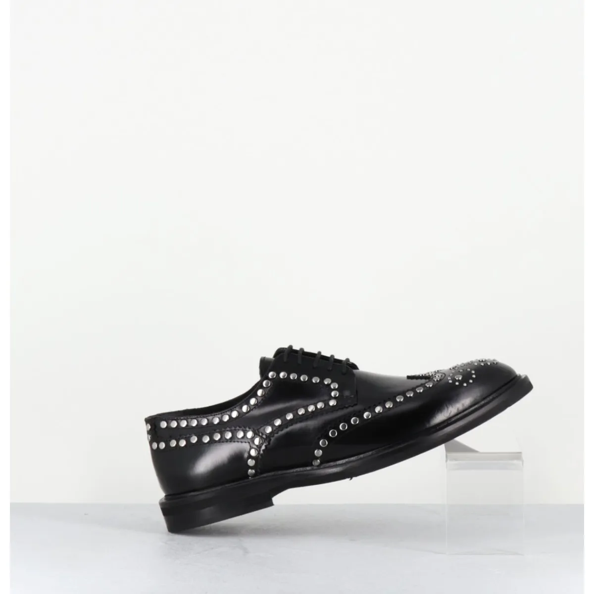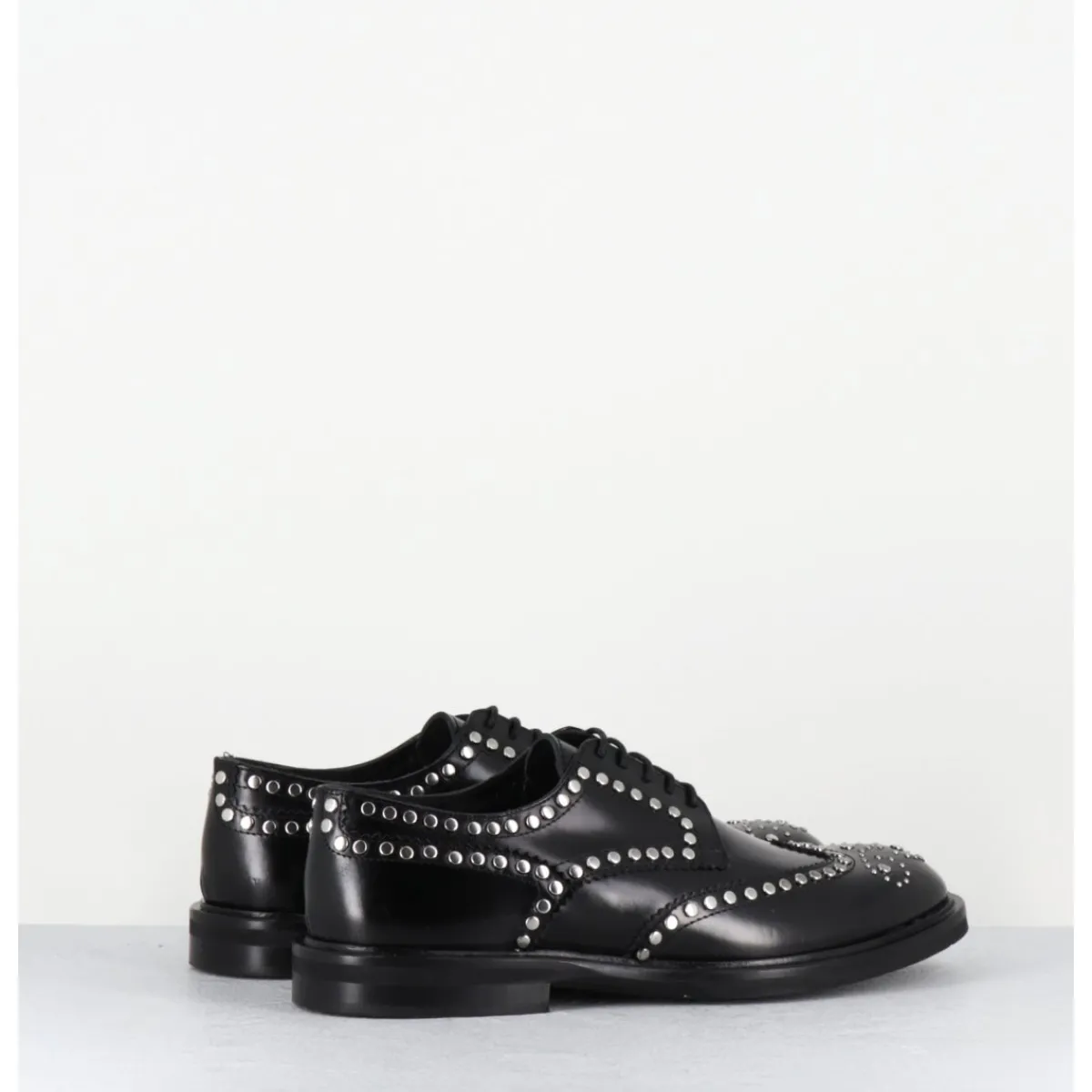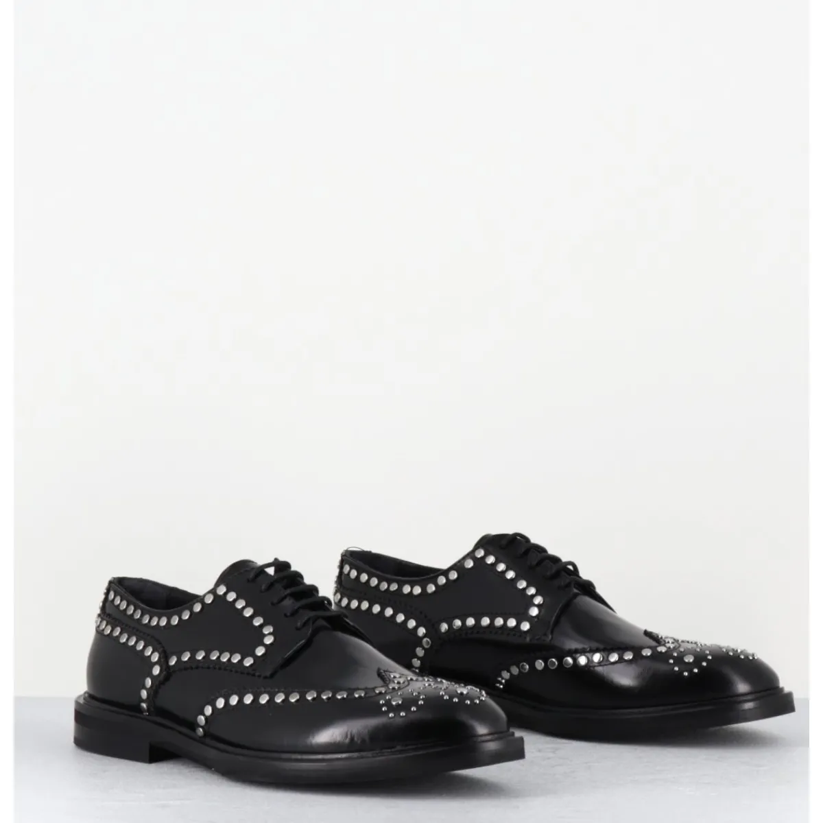 Derbies plats à lacets en cuir légèrement glacé noir, ornés de rivets argentés et d’un bout fleuri à l’avant, montées sur une semelle légère