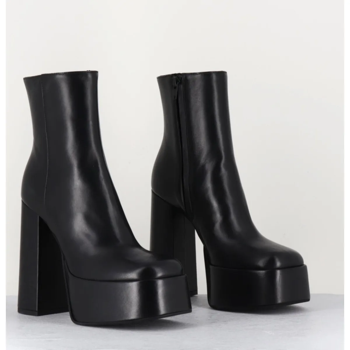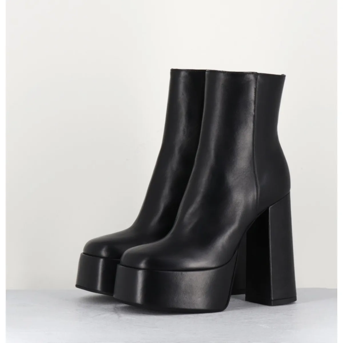 Boots à plateforme en cuir lisse noir, montés un très haut talon large.