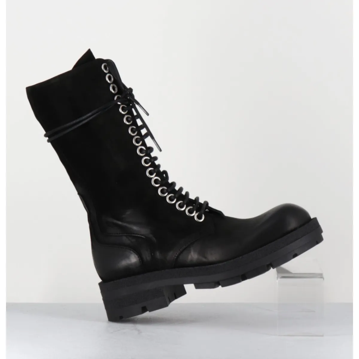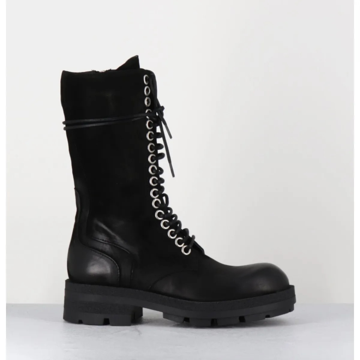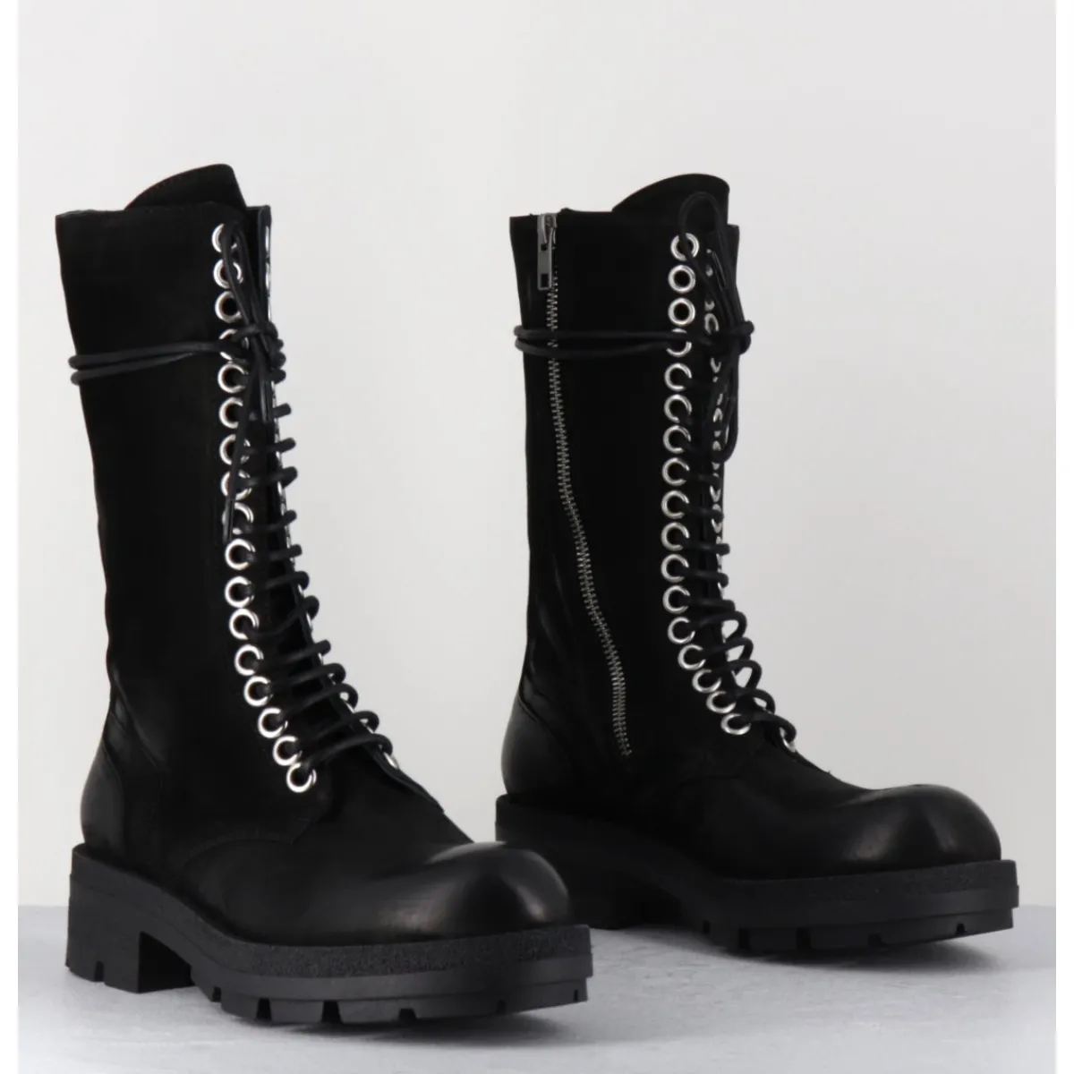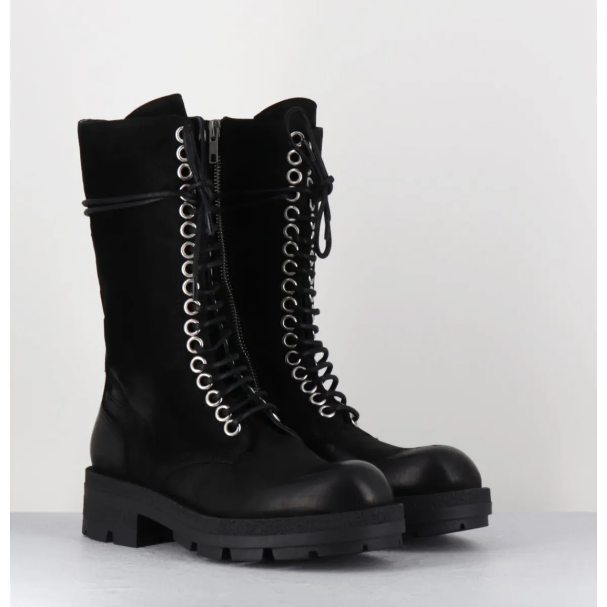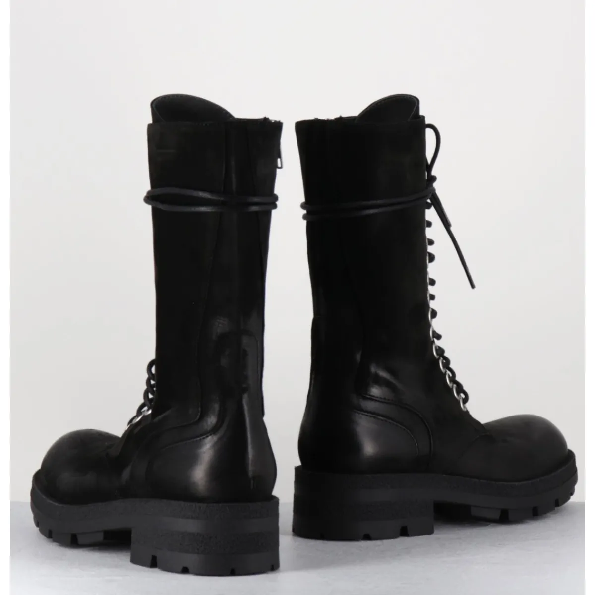 Boots rangers tige haute en nubuck gras noir patiné à la main pour un effet vieilli, rivets larges et zip intérieur, montées sur une semelle légère en gomme crantée