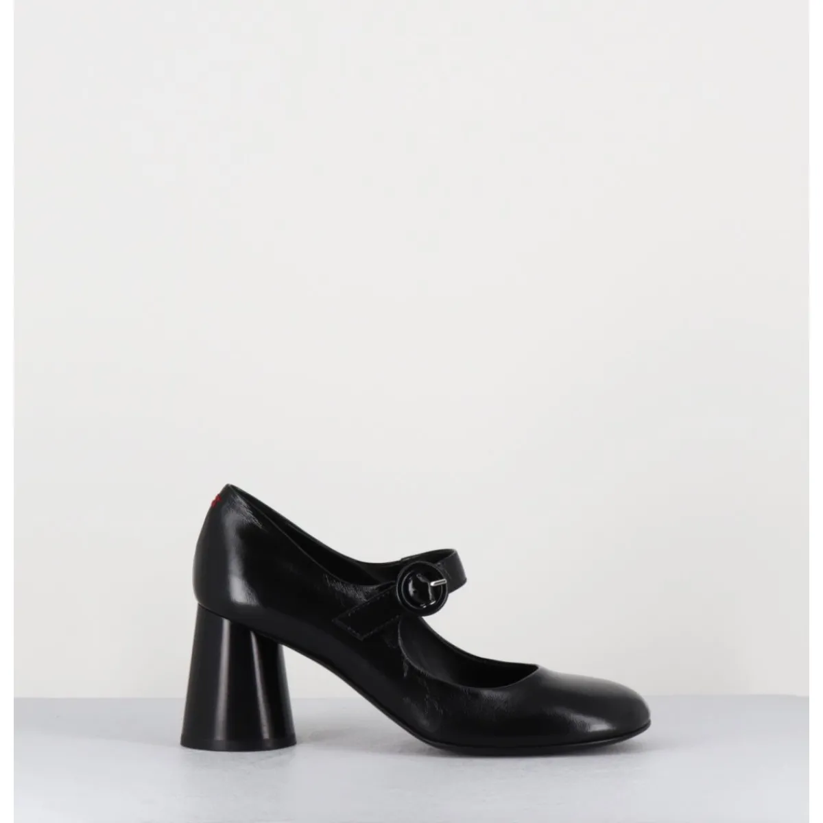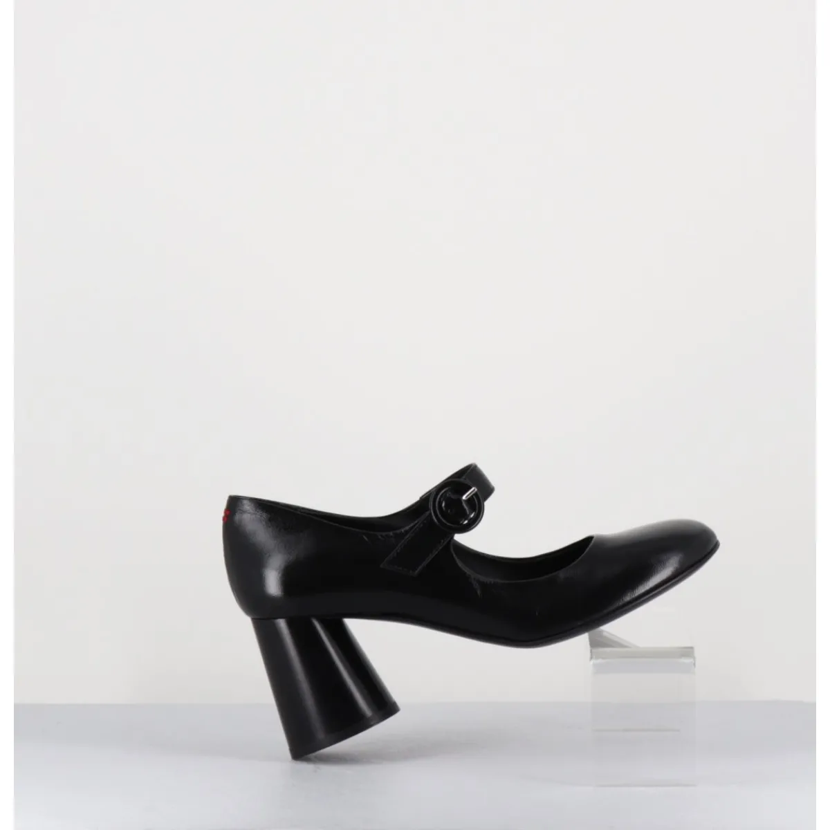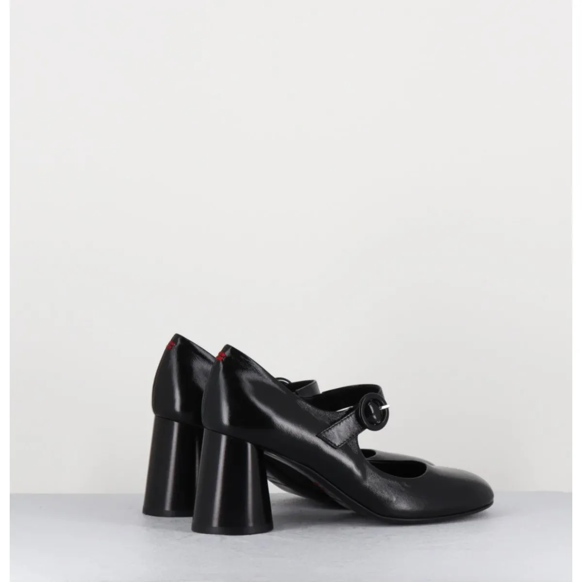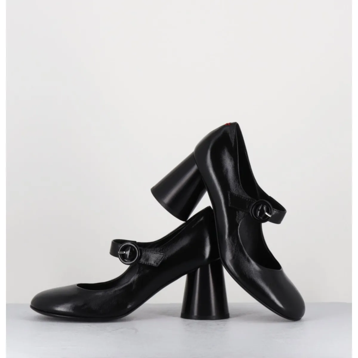 Babies à talon en cuir souple noir légèrement brillant, bout très rond, bride cheville réglable, couture signature de la maison sur le contrefort, montés sur un talon cylindrique évasé peint à la main en noir.