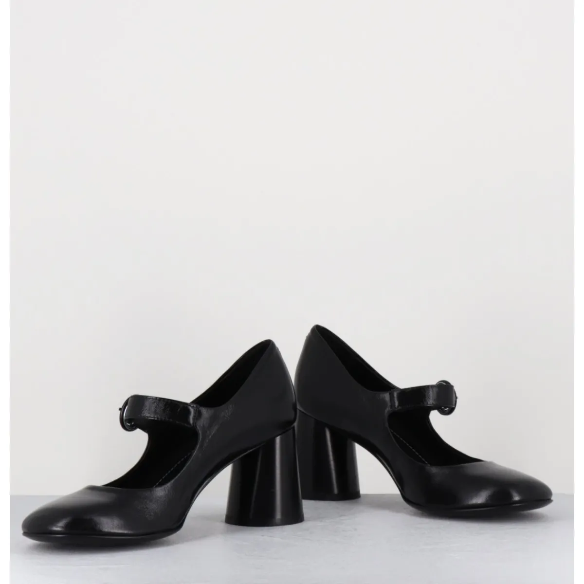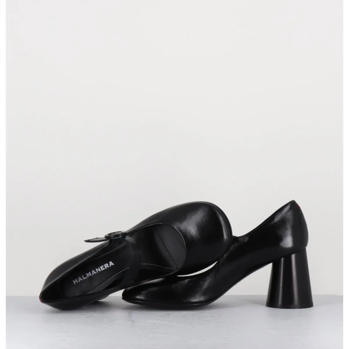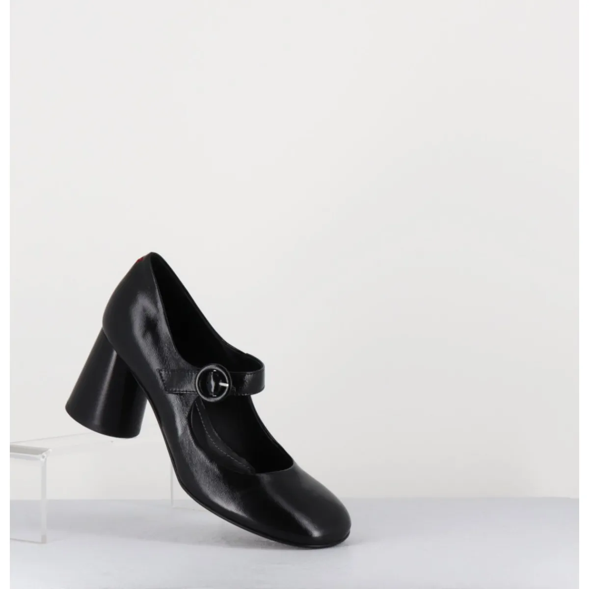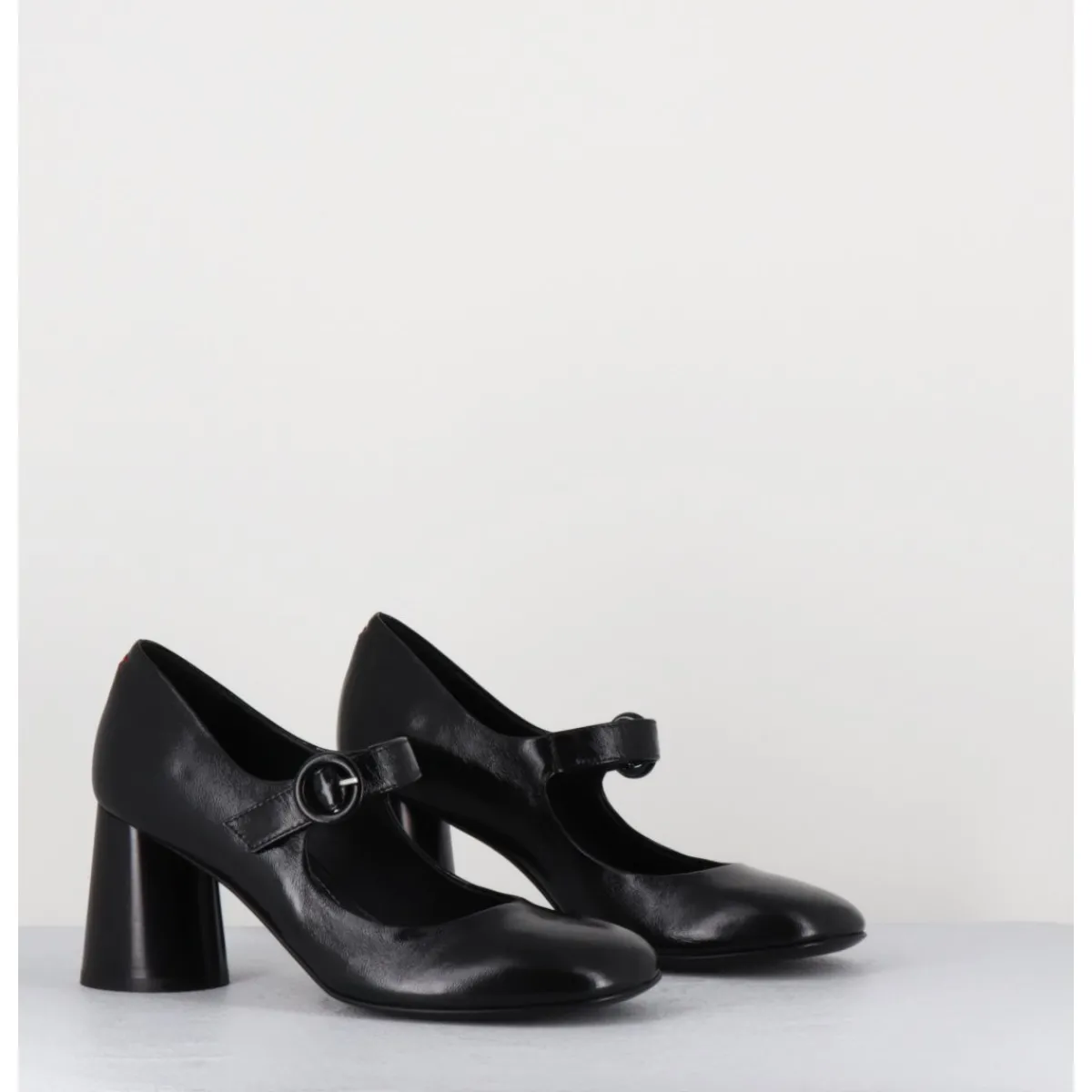 Babies à talon en cuir souple noir légèrement brillant, bout très rond, bride cheville réglable, couture signature de la maison sur le contrefort, montés sur un talon cylindrique évasé peint à la main en noir.
