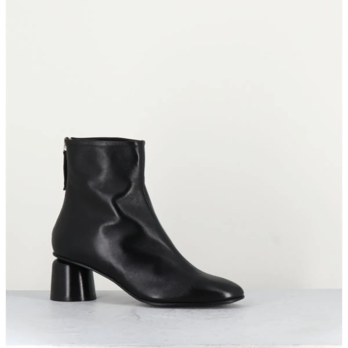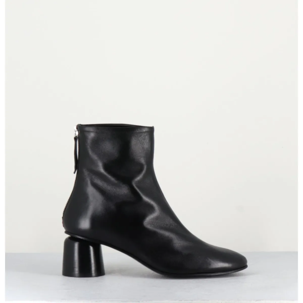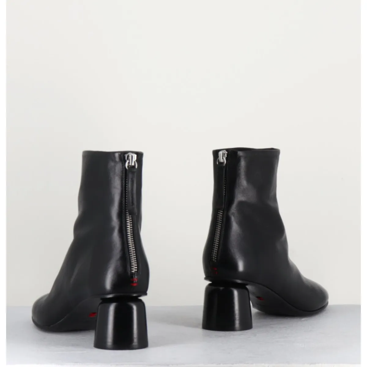 Bottines en cuir ultra souple noir, bout rond et couture central 60s, montées sur un petit talon cylindrique noir, peint à la main.