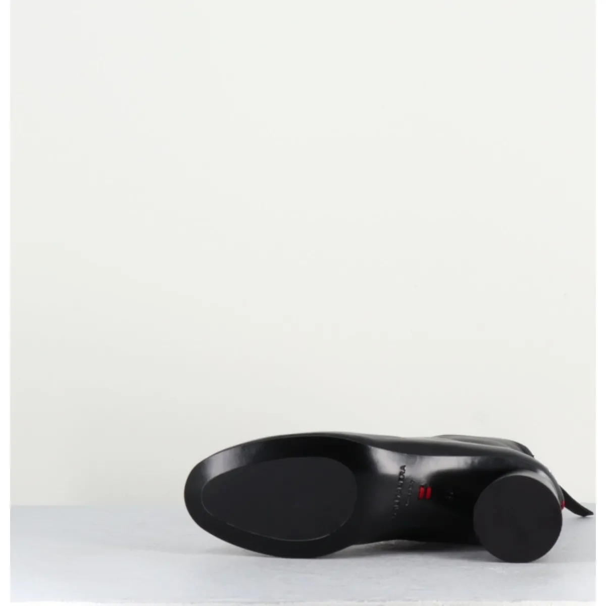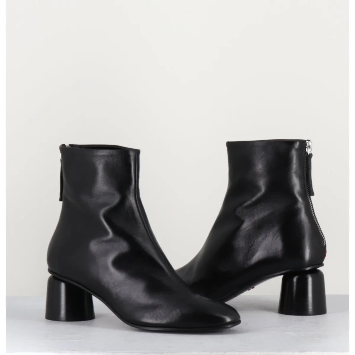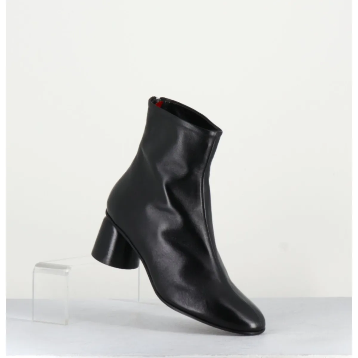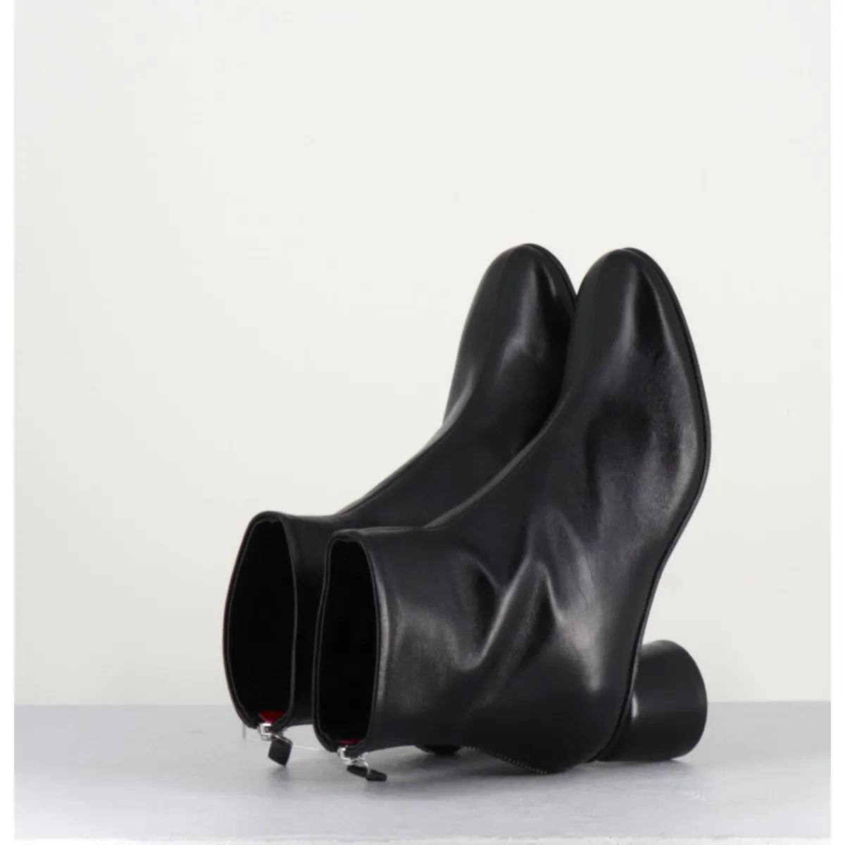 Bottines en cuir ultra souple noir, bout rond et couture central 60s, montées sur un petit talon cylindrique noir, peint à la main.