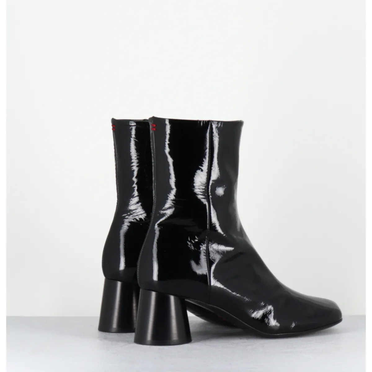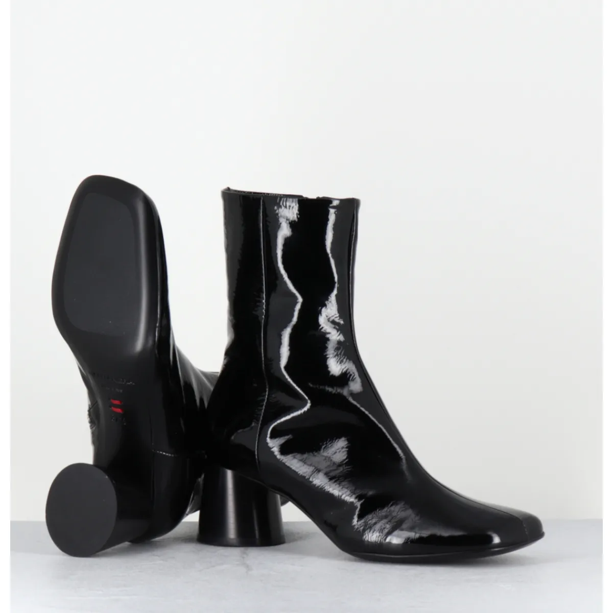Boots en cuir noir vernis souple, bout carré légèrement asymétrique, zip intérieur, couture signature de la maison sur le contrefort, montés sur un talon cylindrique évasé peint à la main en noir
