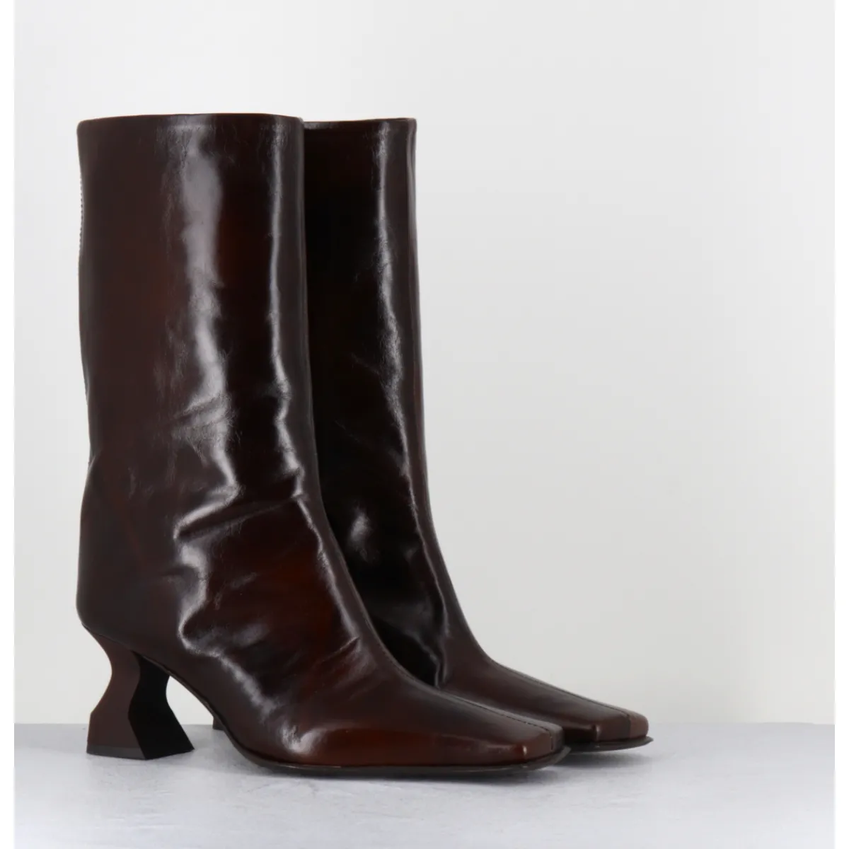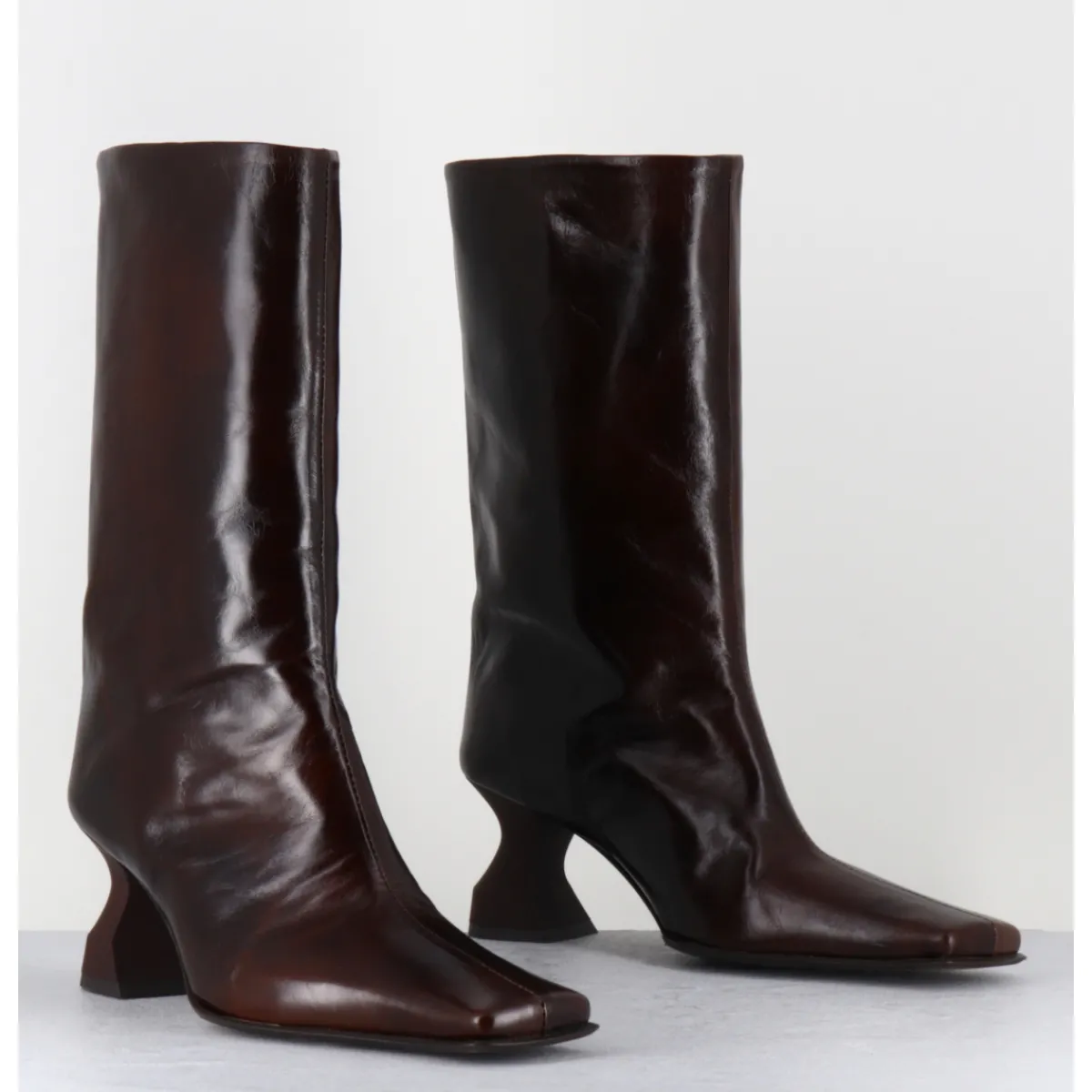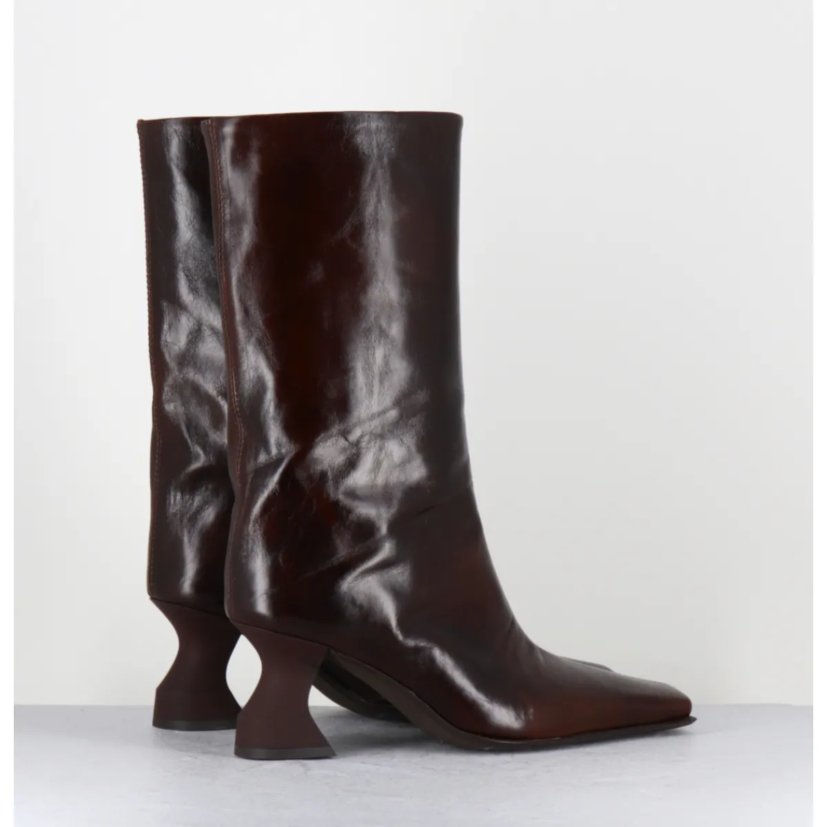 Boots en cuir froissé marron brossé pour un effet ‘vintage’, ligne effilée à bout carré 90s, tige droite large qui s’enfile, montées sur un talon virgule stylisé recouvert de gomme