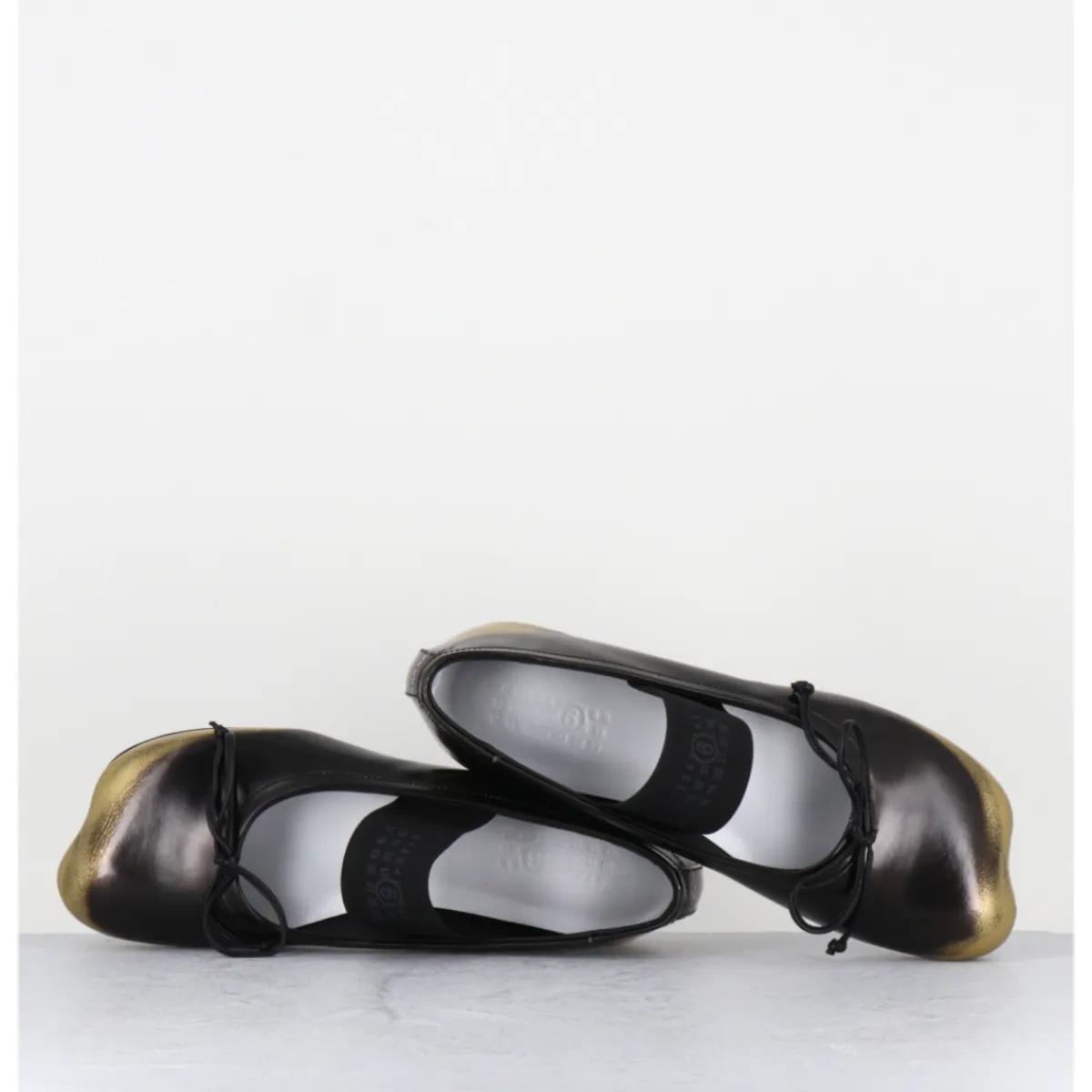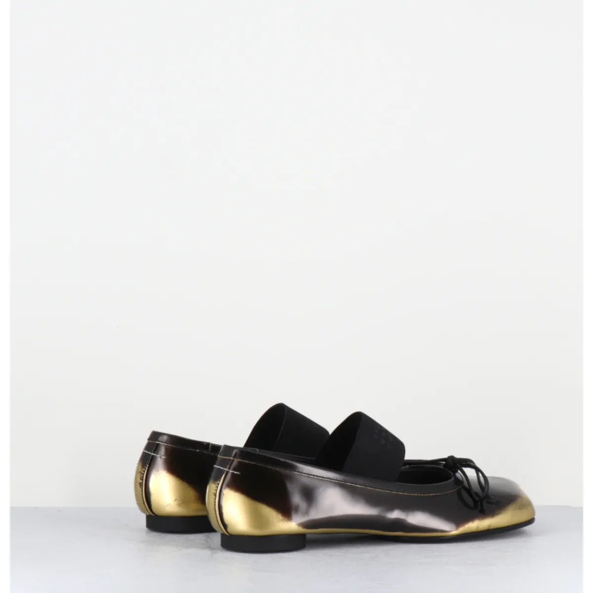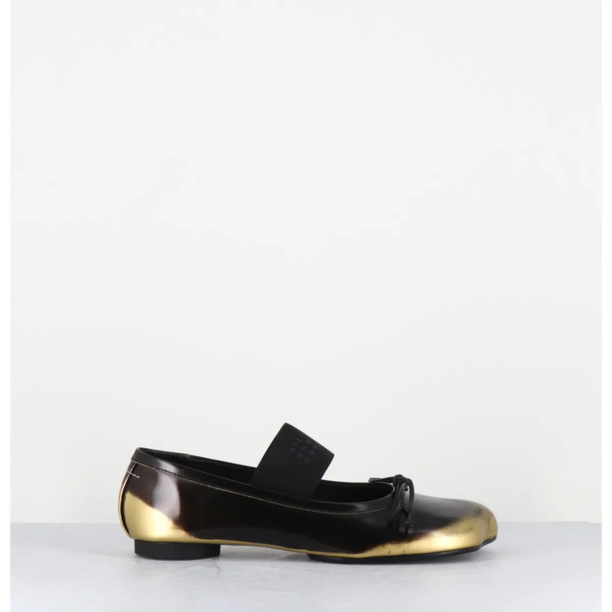 Ballerines esprit chausson de danse en cuir glacé marron brossé et or, dotées d’un petit talon géométrique en pvc avec logo 6 imprimé sur la base & d’un élastique Numeric signature. Ces chaussures arborent un bout anatomique, hommage au modèle iconique Tabi et un détail en forme de nœud, le tout complété à l’arrière de la célèbre surpiqûre horizontale de la Maison.