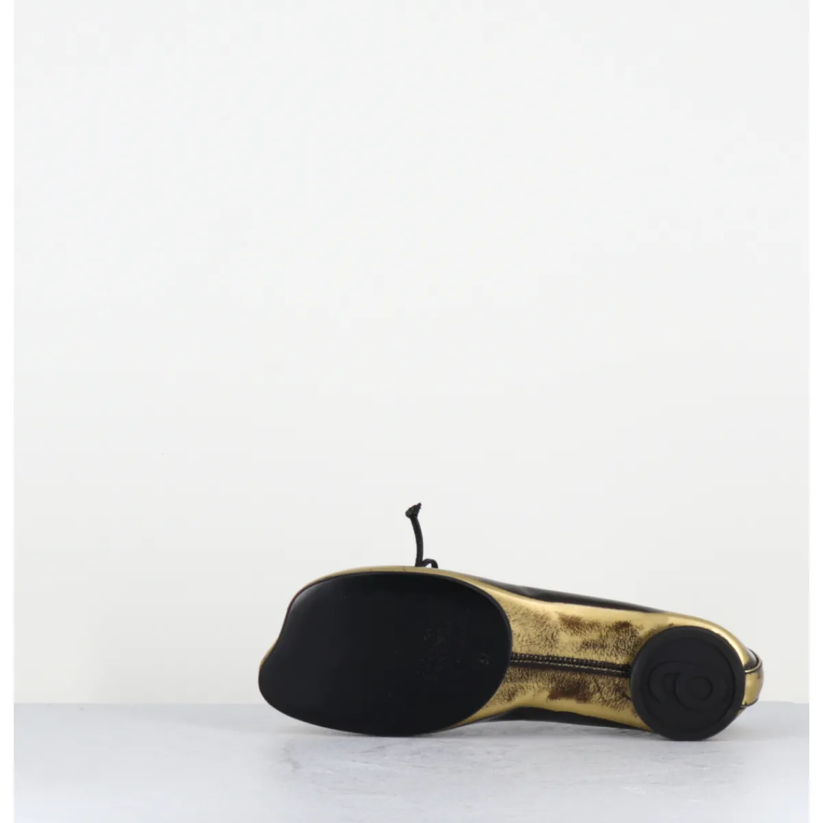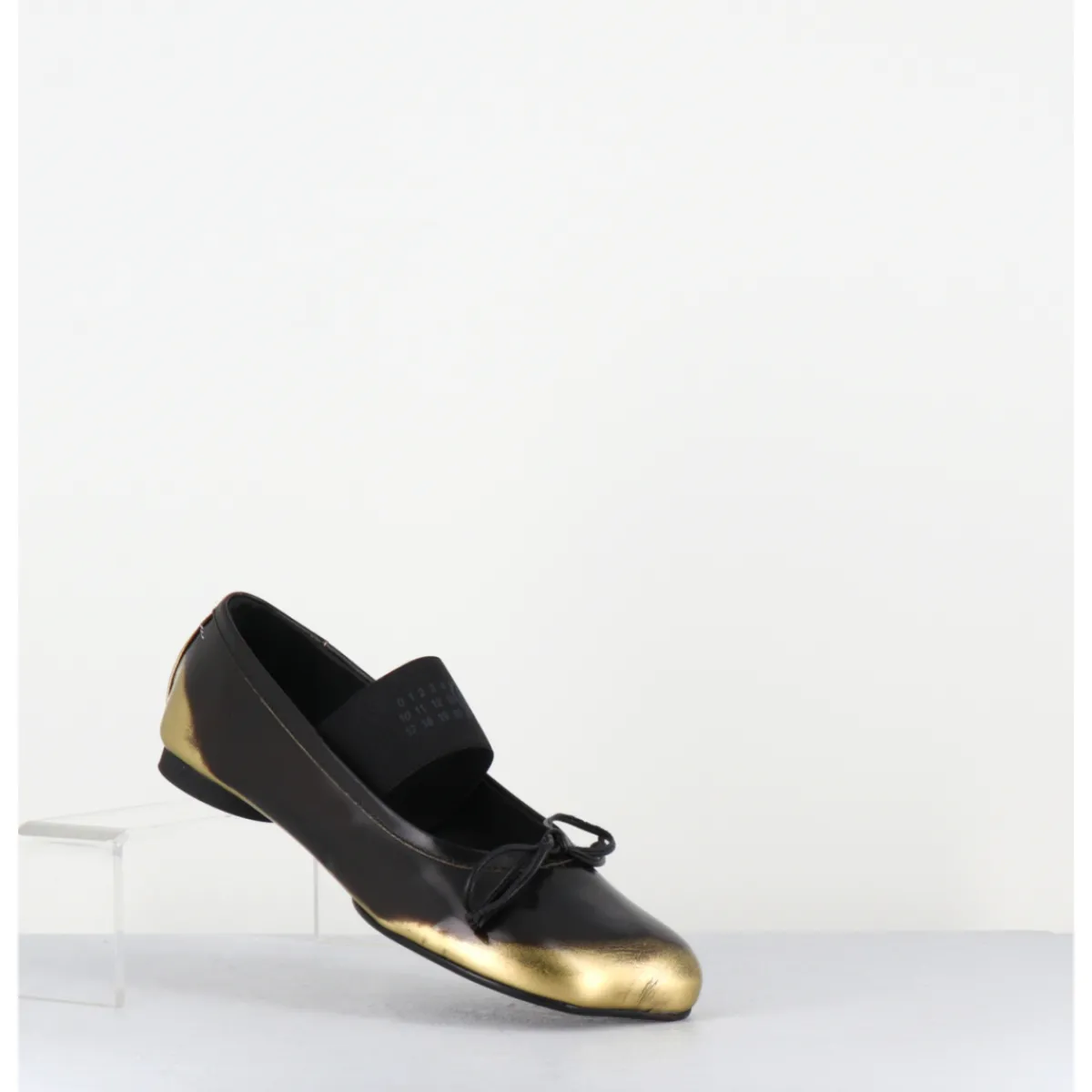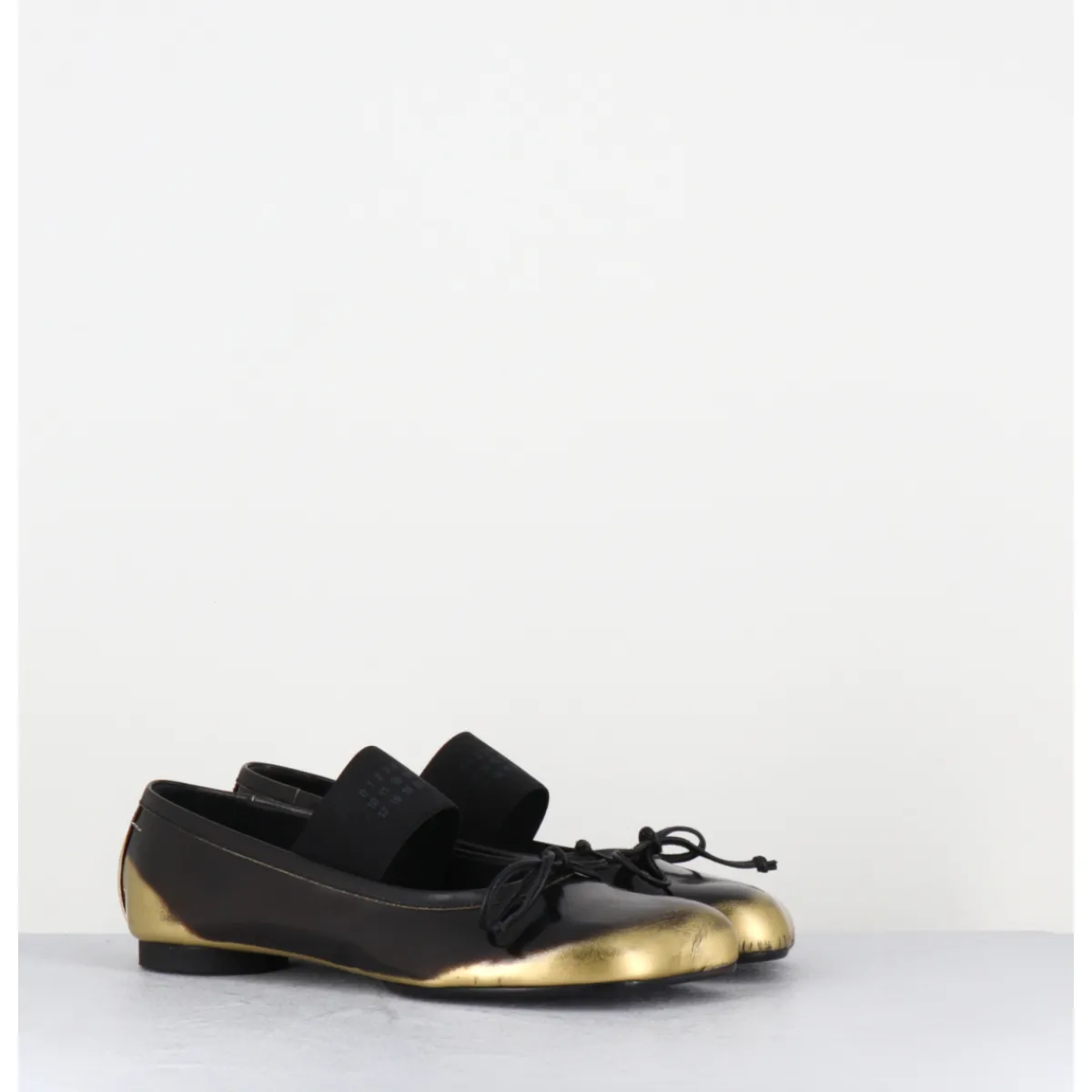 Ballerines esprit chausson de danse en cuir glacé marron brossé et or, dotées d’un petit talon géométrique en pvc avec logo 6 imprimé sur la base & d’un élastique Numeric signature. Ces chaussures arborent un bout anatomique, hommage au modèle iconique Tabi et un détail en forme de nœud, le tout complété à l’arrière de la célèbre surpiqûre horizontale de la Maison.