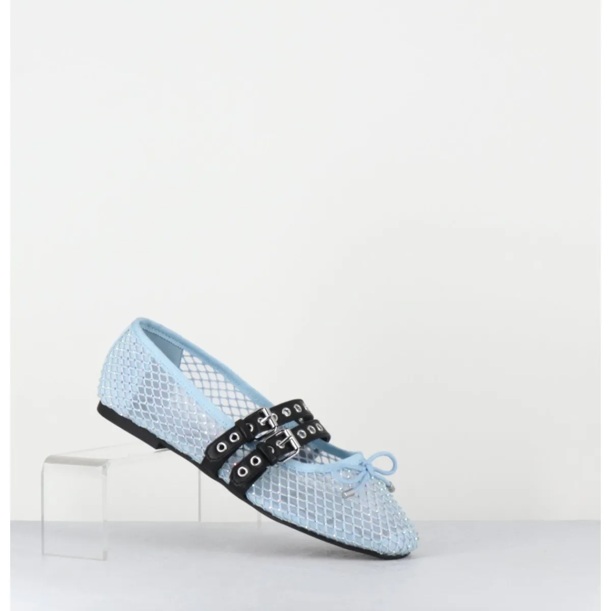 Ballerines en mesh bleu ciel effet résille orné de petits strass, double brides réglables en cuir noir esprit Mary-Jane, ligne effilée avec bout arrondi et petit noeud décoratif, montées sur une semelle plate en gomme