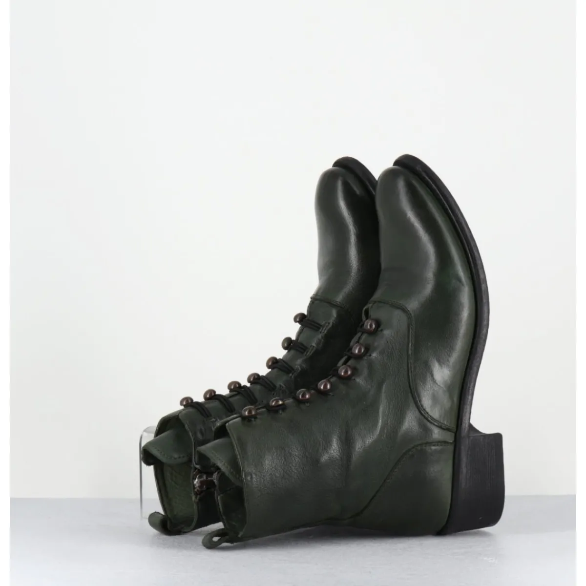 Bottines en cuir souple vert à bout en amande, présentant à l’avant un élégant design de boutons sous forme de perles canon de fusil alignées avec fermeture éclaire intérieure et montées sur une semelle souple cousue main et un talon confortable